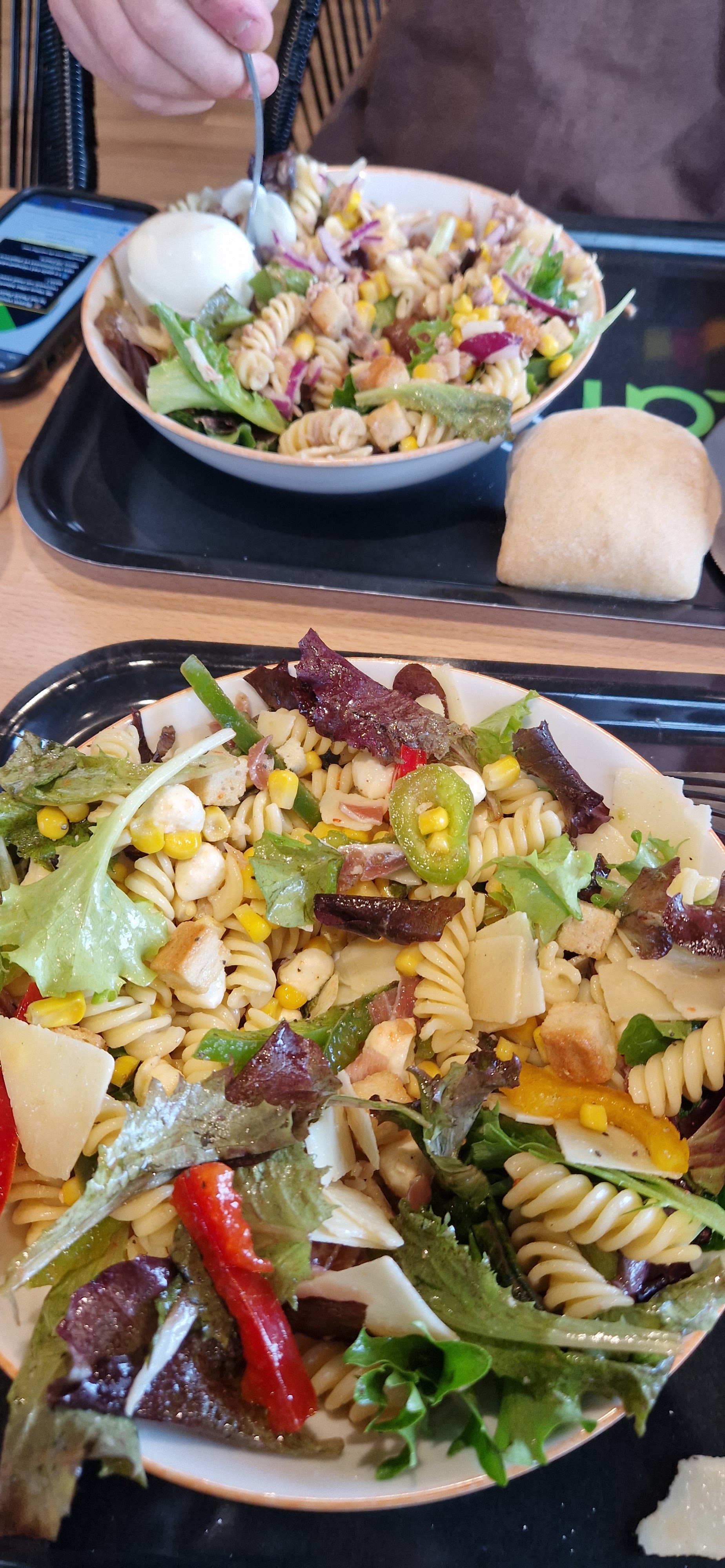 J'ai pris base fusili, plus mimolette/tomates seché/concombre/avocat et sauce pesto. Bon, c'est petit : j'ai toujours faim après et aucun des aliments n'étaient travaillé. Ca fait très premier prix/boites de conserves. J'aurai souhaité plus de générosité dans le service, des aliments plus recherchés ou marinés, cuisiné (eg: pas du bète maïs en boite) et aussi moins de plastique dans les emballages.