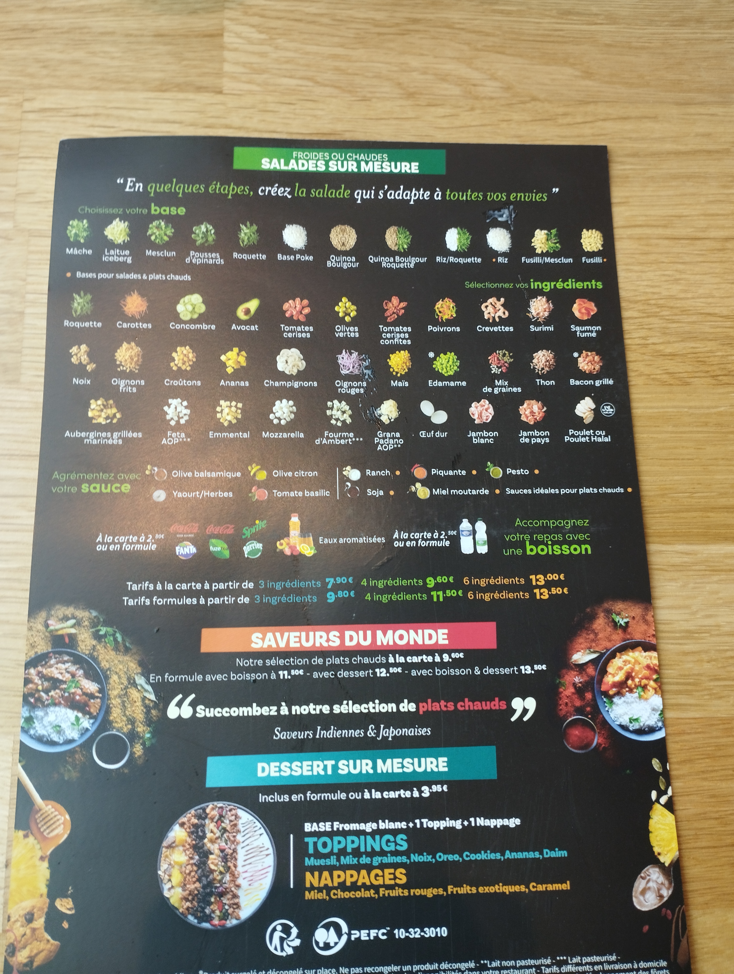 Testé ''Eat salad'' en prenant à emporter. Bon concept, du choix et le personnel agréable. Un peu cher tout même, 15,50 € la formule avec 6 ingrédients, boisson et dessert.