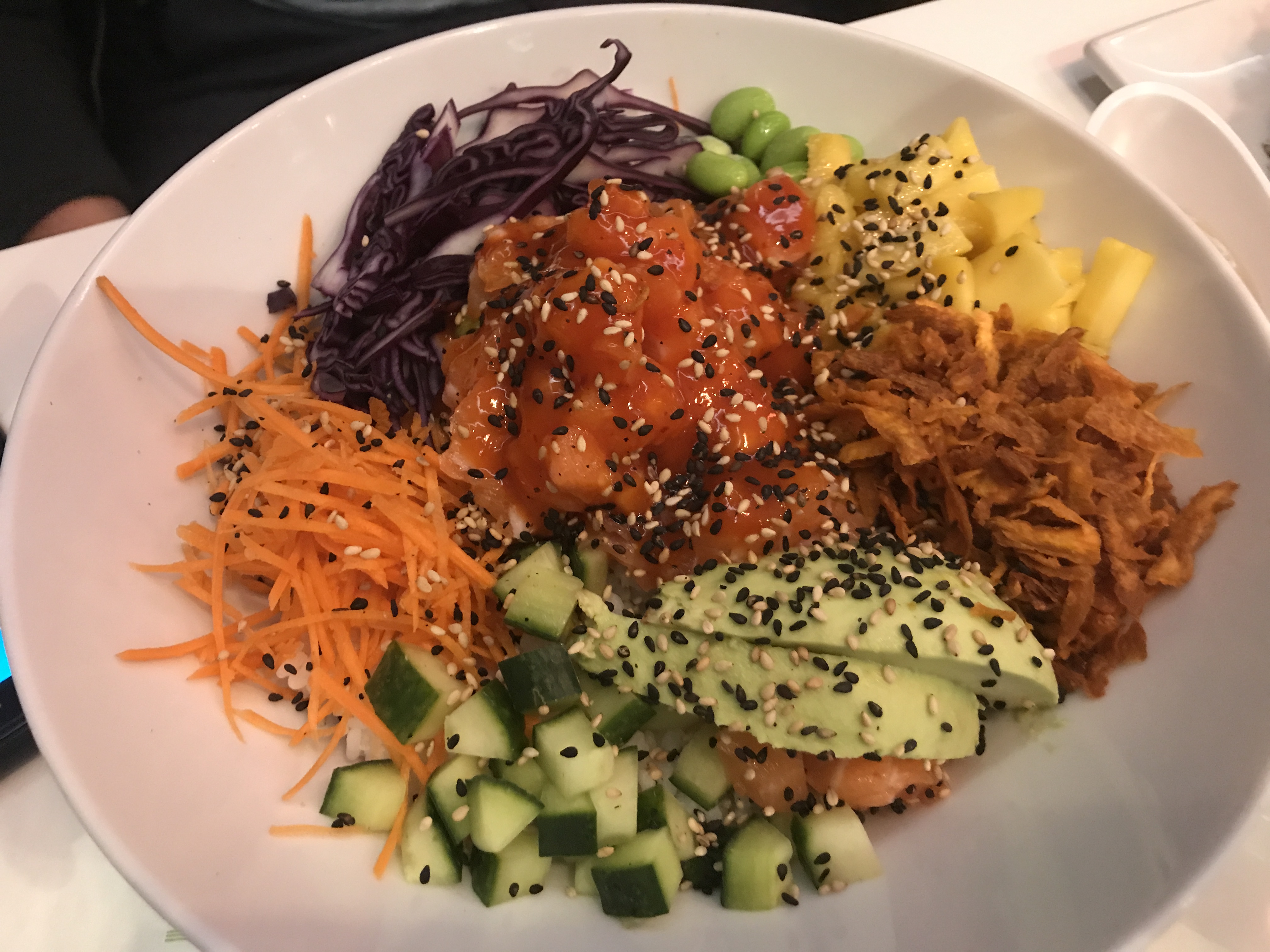 Poké commandés via Ubereats, plusieurs ingrédients sont absent du poké et les morceaux de saumon ne sont pas légion... Le pire, on commande chez Poké & CO, une autre enseigne et on se fait livrer par Eat Sushi... Et la cerise sur le gâteau, la personne au téléphone qui refuse de reconnaître qu'il manque des ingrédients, mais reconnait bien volontiers qu'ils sont préparés (bien) à l'avance.