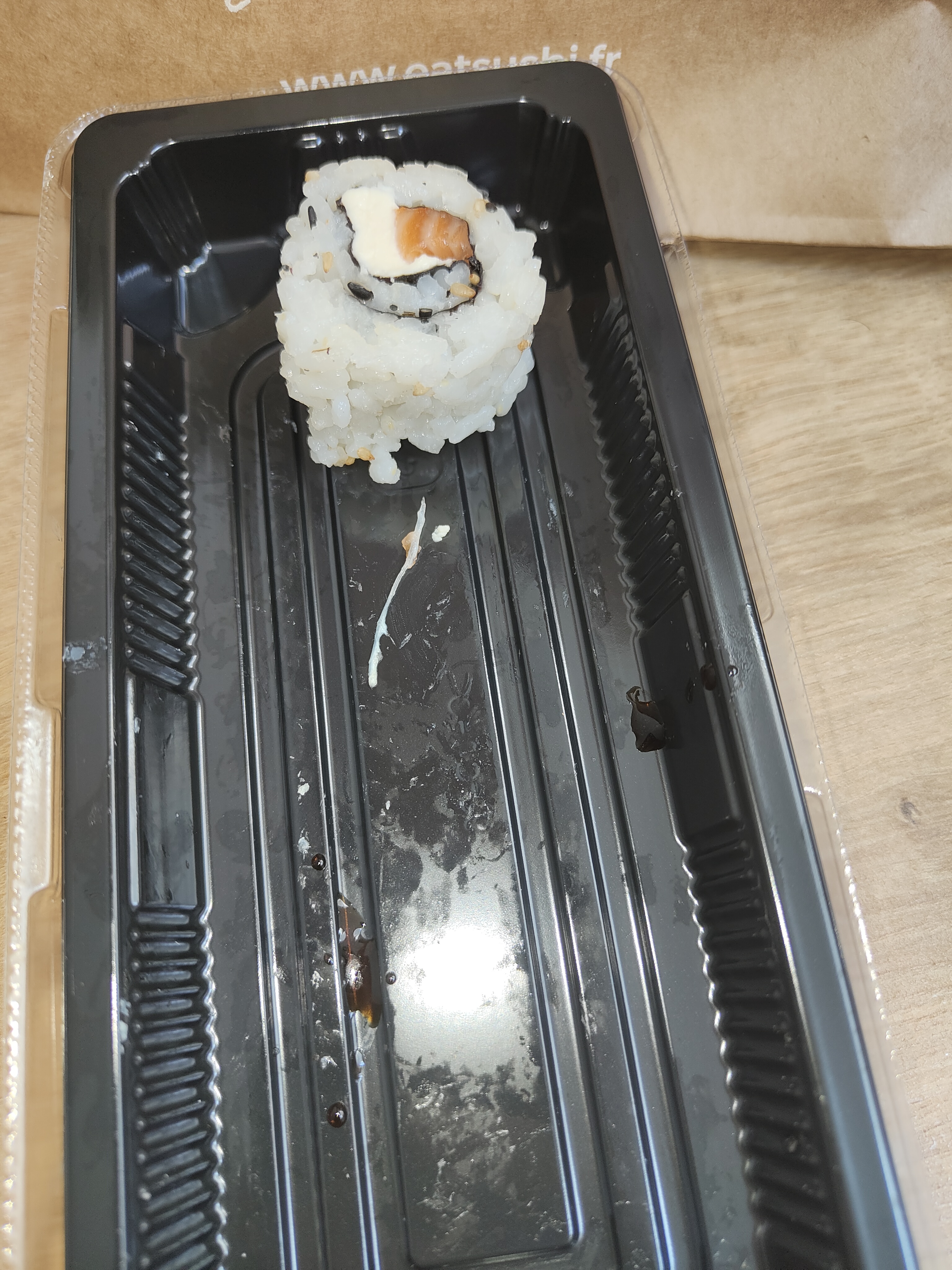 Commande uber eats. arrivée avec une odeur forte de poisson (poisson pas frais ? ) 1 sauce sucre pour 24 California commandés niveau radinerie je pense qu’on a atteint un palier J’en ai goûté qques un pas dingue j’évite peut être une intoxication en jetant tout ça Première et dernière commande pour moi