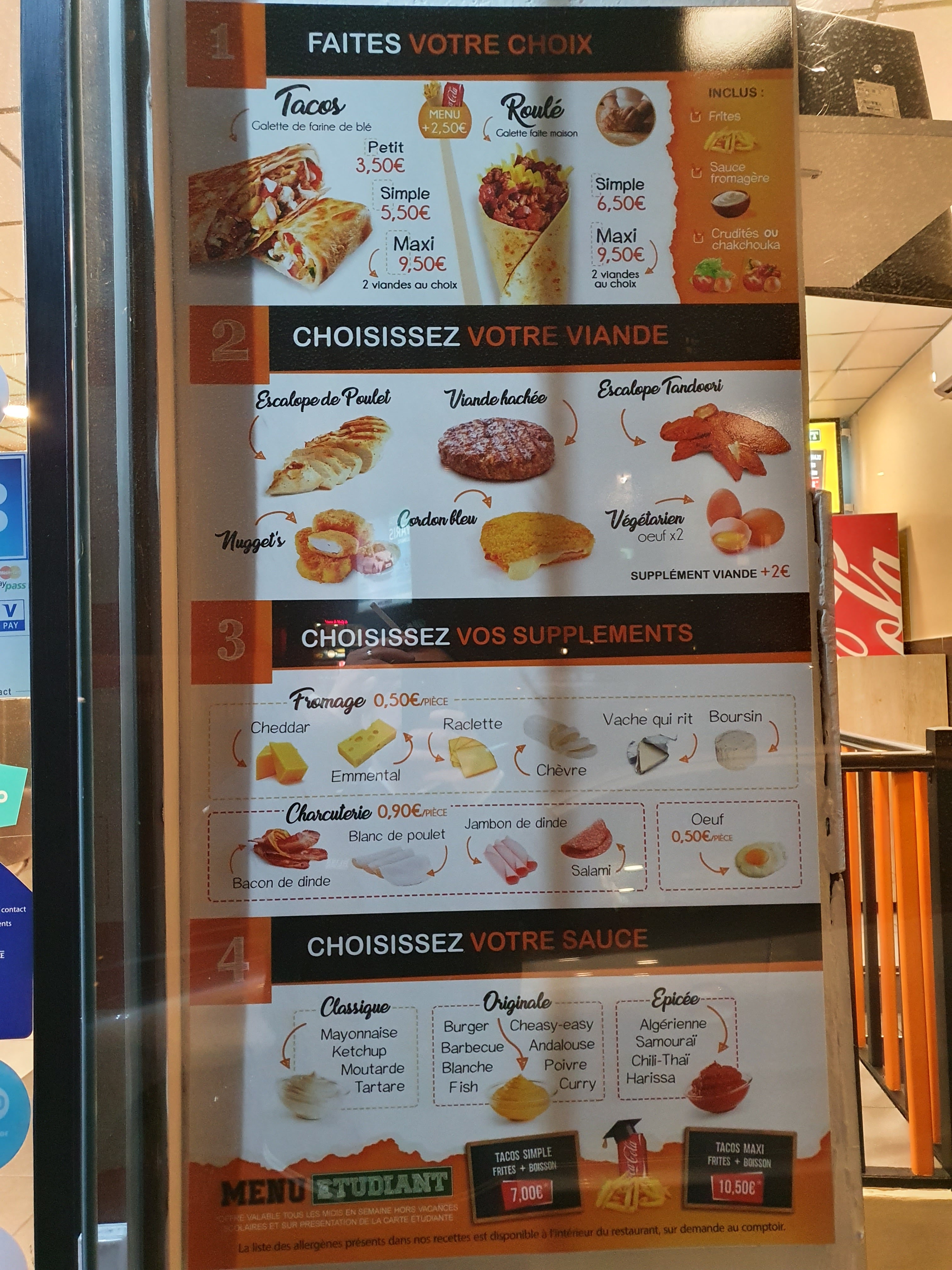Ils ont oublié la sauce dans le tacos et les frites étaient pas extra ! De même pour les tomates salade oignon, il y en avait peu donc c’est bien dommage ! Je conseille un autre tacos.