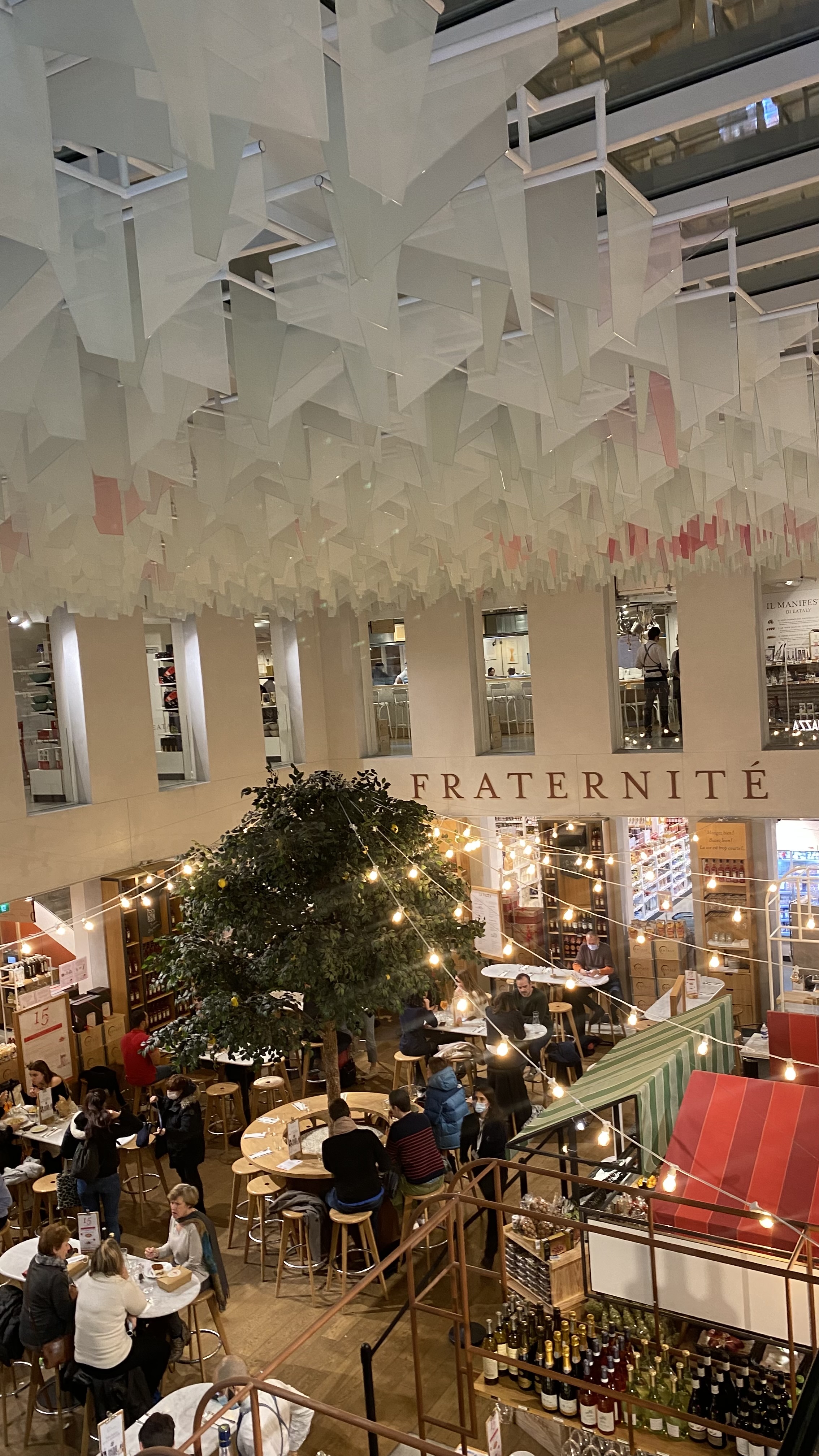 Endroit très sympathique on peut aussi bien y manger, faire ses courses ou juste boire une verre. Il y a un espace boulangerie, fromagerie, charcuterie, primeur, …
