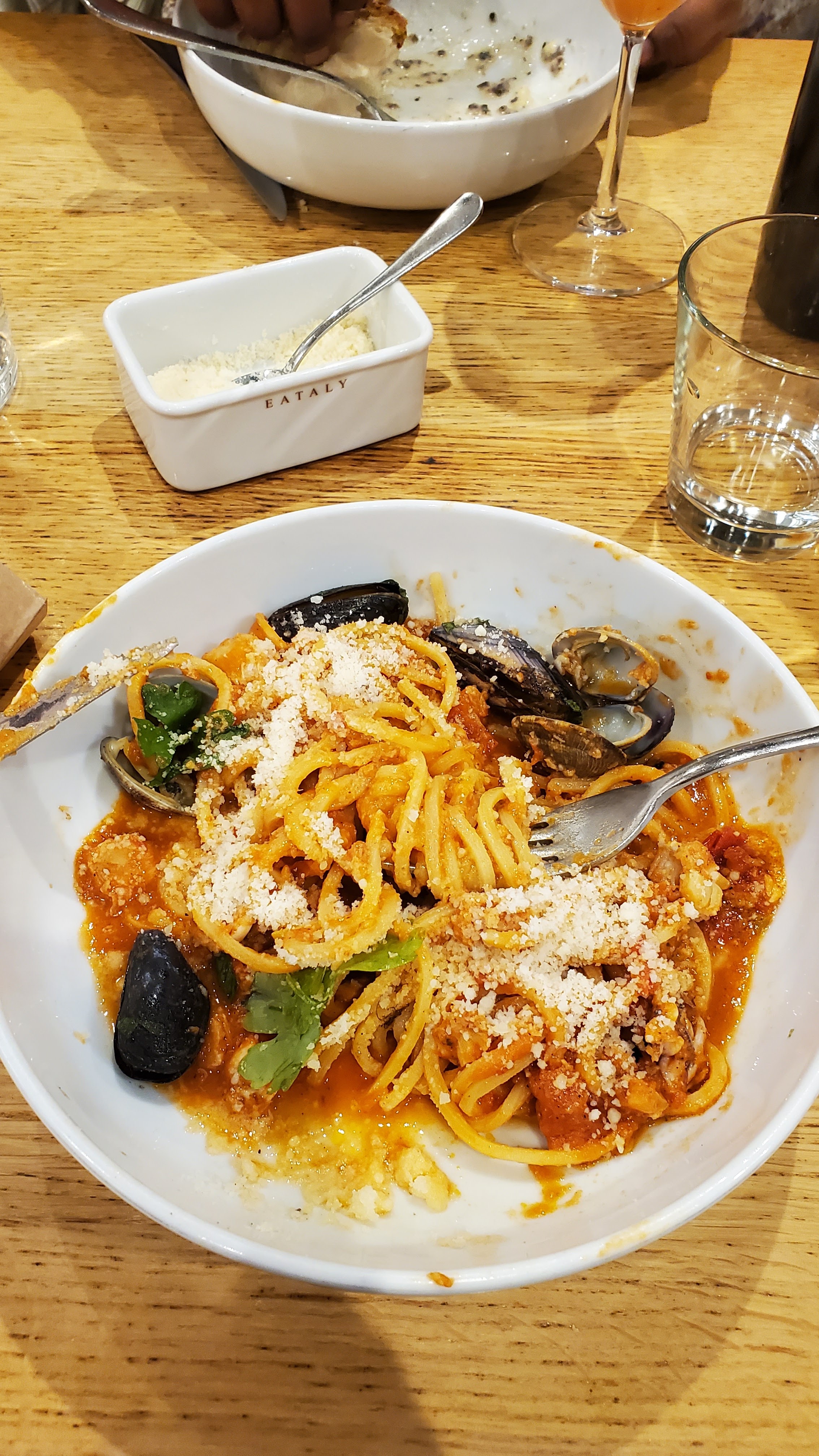 Expérience délicieuse chez Eataly, un marché proposant une variété de sélections de pâtes et de pizzas. Le plat de poisson est étonnamment frais.
