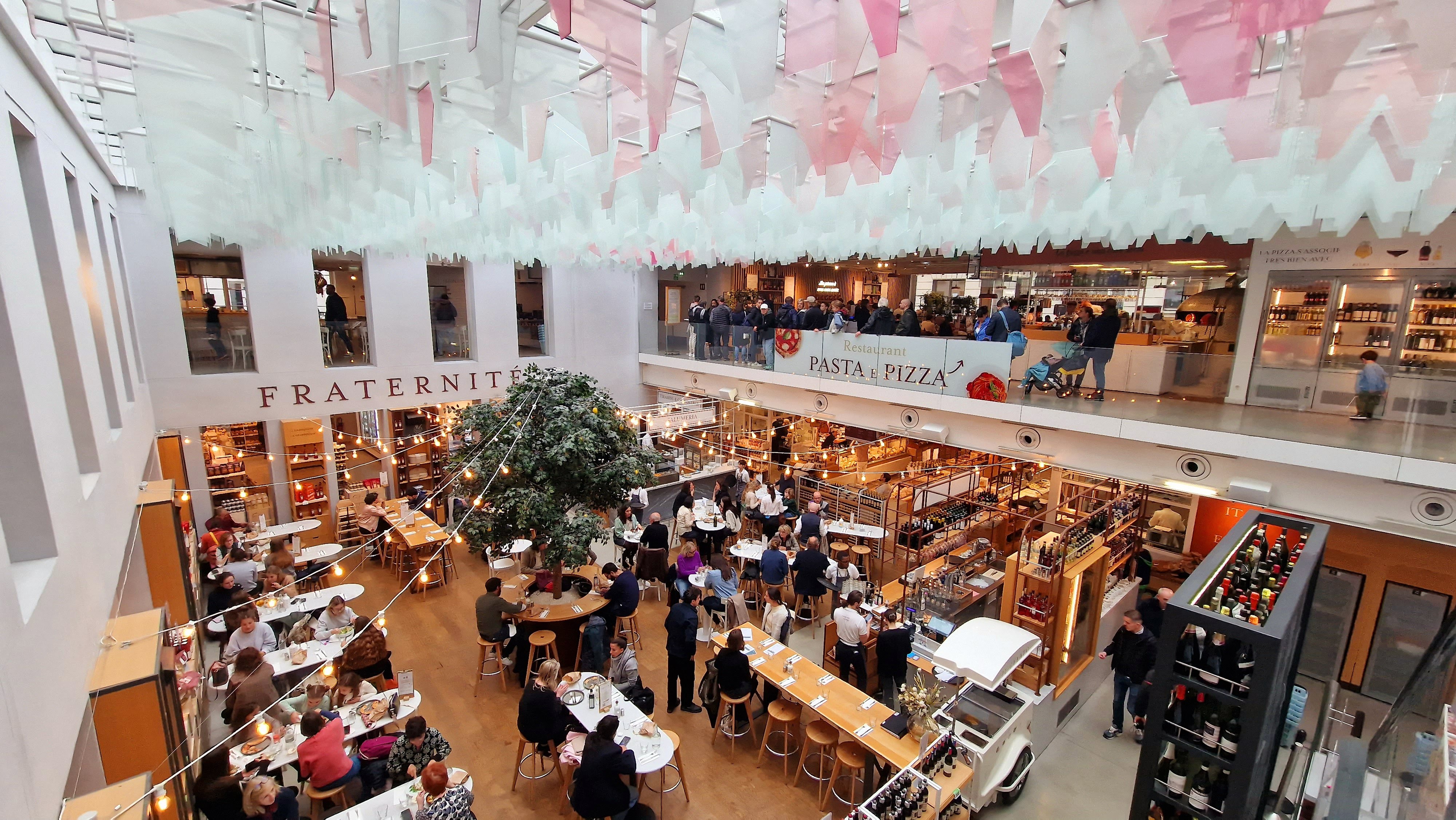 Magnifique marché italien couvert avec restaurants, matériel de cuisine, salle de cours de cuisine et sous-sol avec une grande sélection de vins. Cela vaut bien une visite !