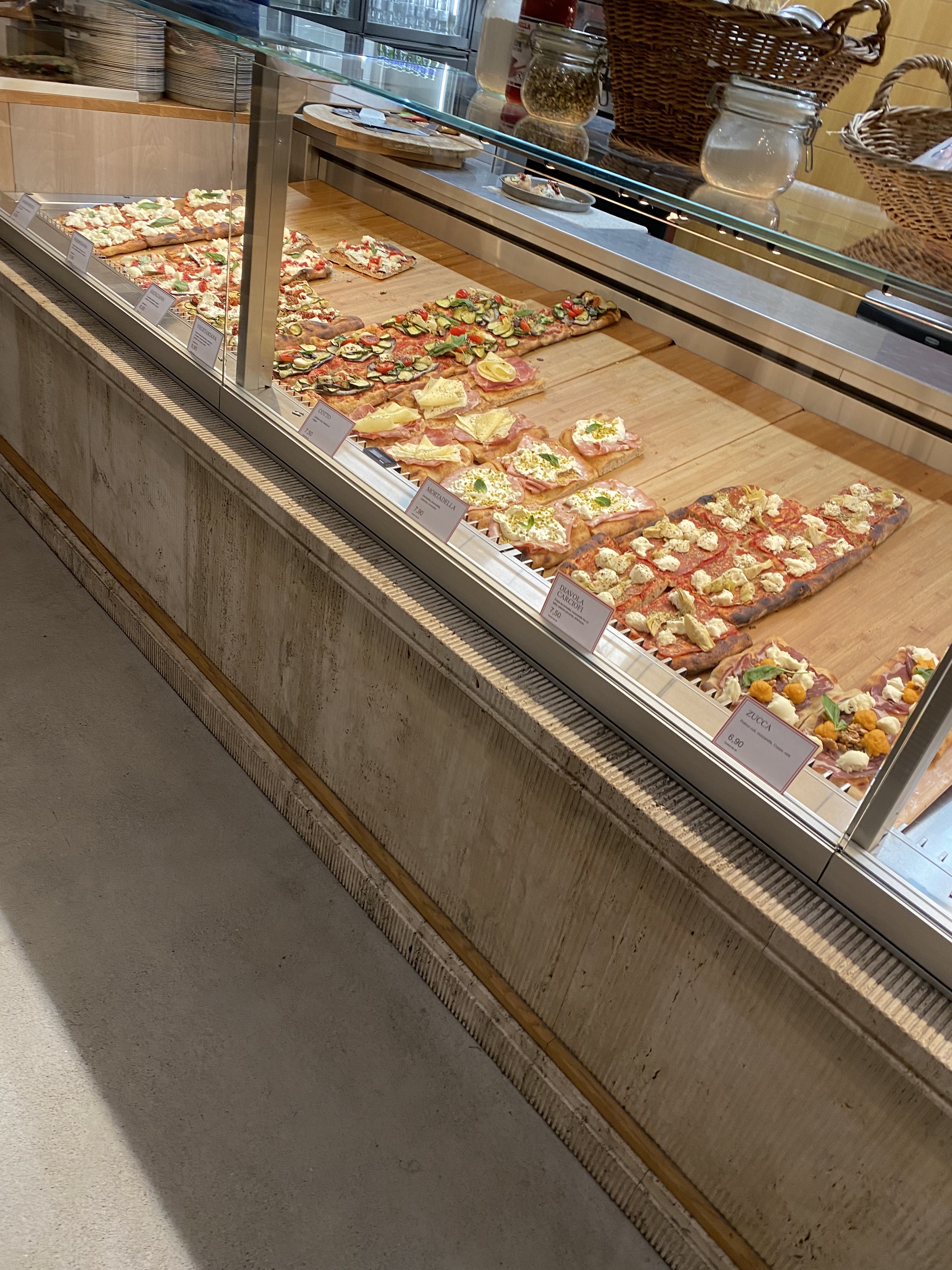 Pizza a la coupe. 7 euros pour la moins cher. Même pas bonne. J'arrive au comptoir pour commander 4 serveurs discutent entre eux sans se soucier de si je veux commander. Ça commence bien. Il faut revenir chercher la part une fois chauffée. La première brûlée car oubliée dans le four quand je reviens. Excuse sympathique et donc nouvelle part a réchauffer. Je ne reviendrai pas. Le goût le service et l'expérience premium promise par Eataly n'étant pas au rdv...