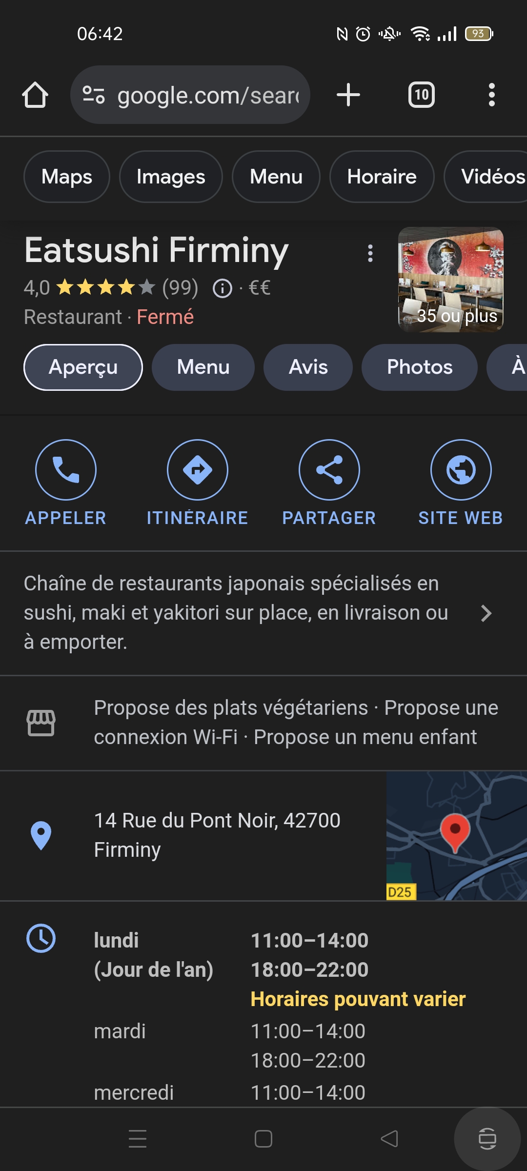 Départ un peu difficile je pense pour eat sushi Firminy, beaucoup d'attente pour récupérer une commande, dommage qu'elle ne soit pas conserver au frigo, les sushis manquent réellement de fraîcheur, et pas de chance commande incomplète.