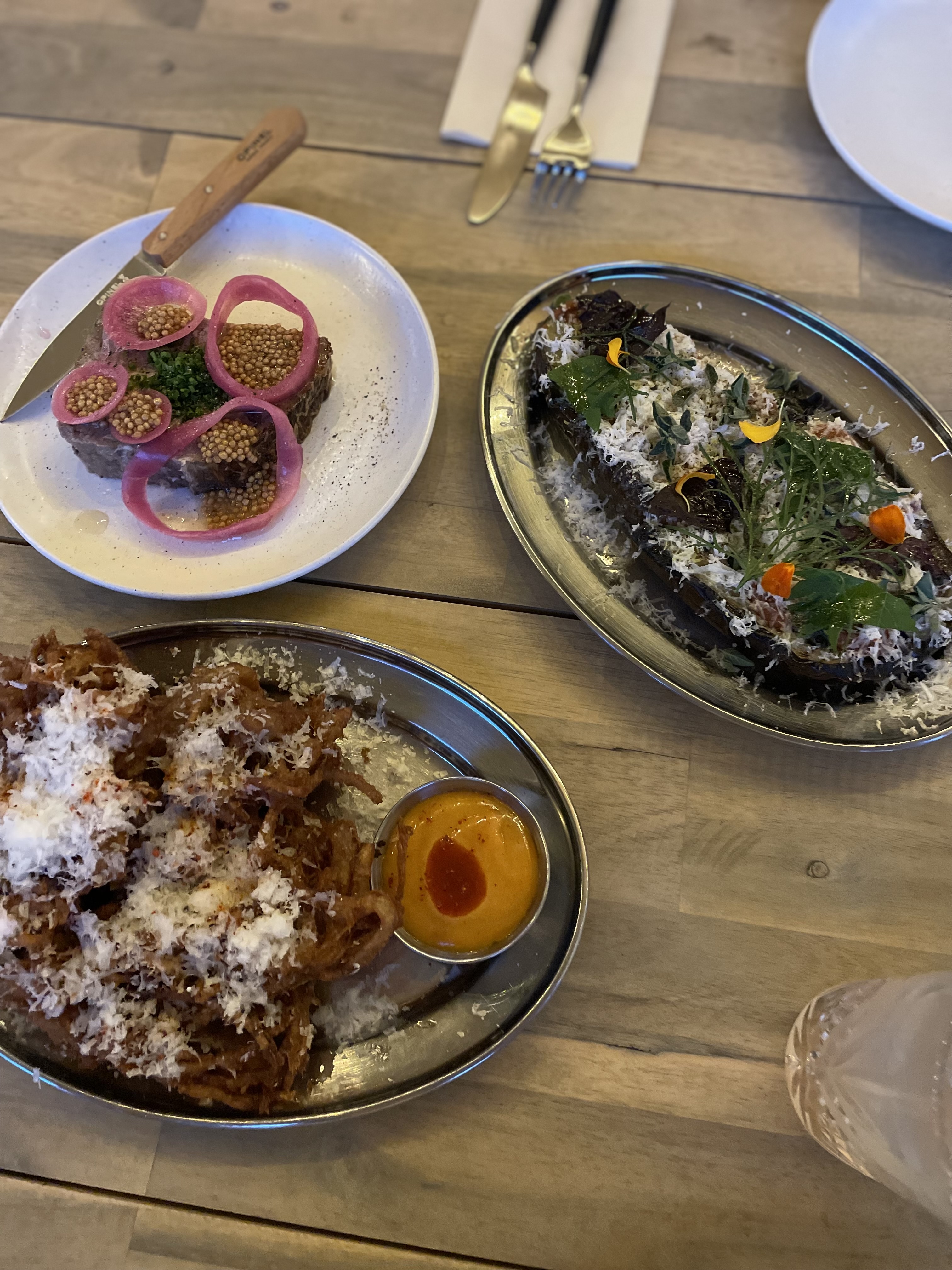 Nous avons pris différents « plats » pour un dîner. Le service est très bien. Les beignets, aubergines…sont bons. Cependant les tarifs des viandes et poissons sont exagérés. De très fines tranches. Une cuisse de poulet qui n’a rien d’une cuisse en terme de quantité mais bien plus proche d’une escalope coupée en lamelle pour 27€. On cherche la chaire de la truite. Je trouve ce concept de « à partager » excessivement cher par rapport aux plats qui n’en sont pas vraiment. L’impression d’avoir grignoté et non mangé.