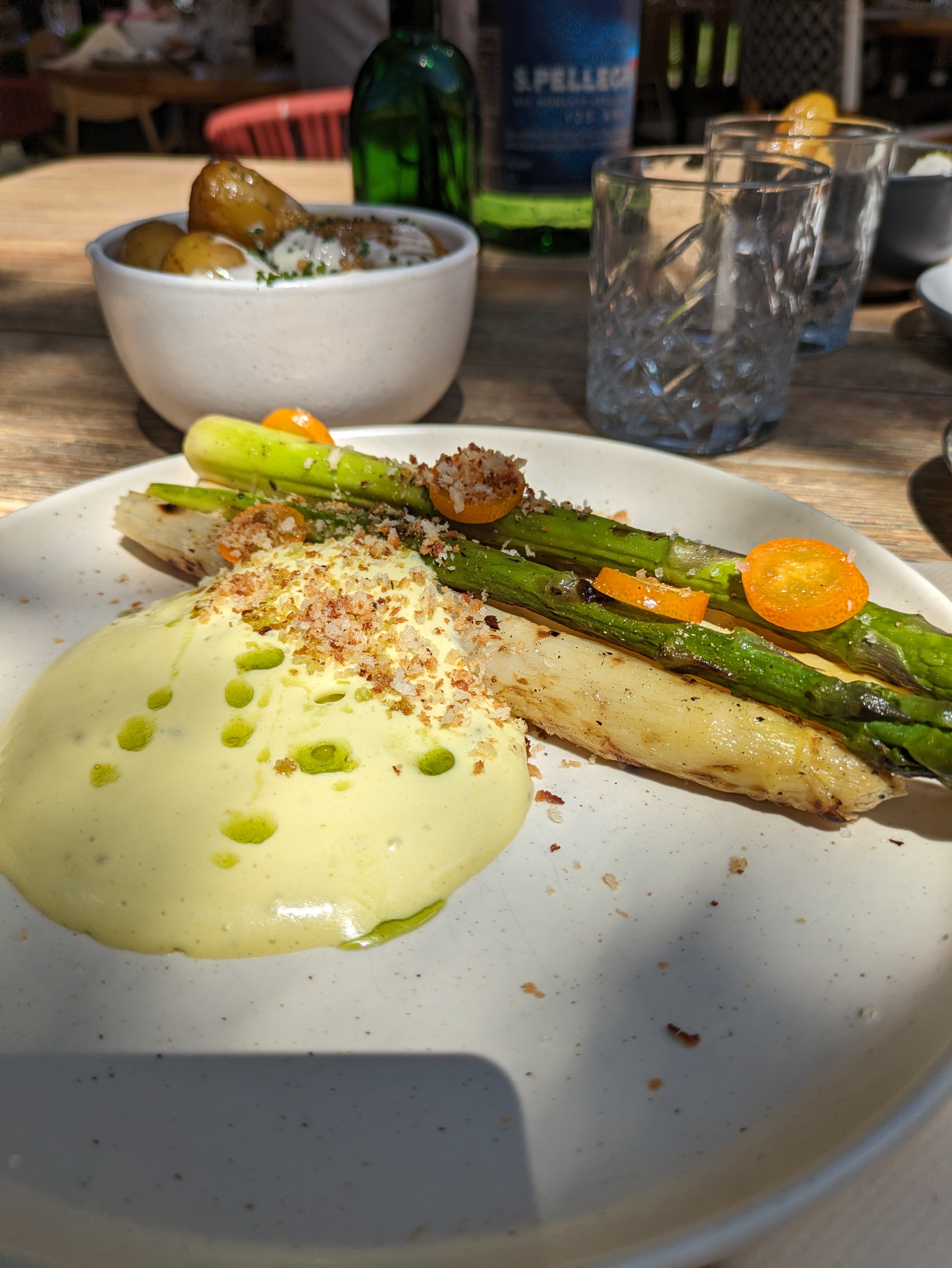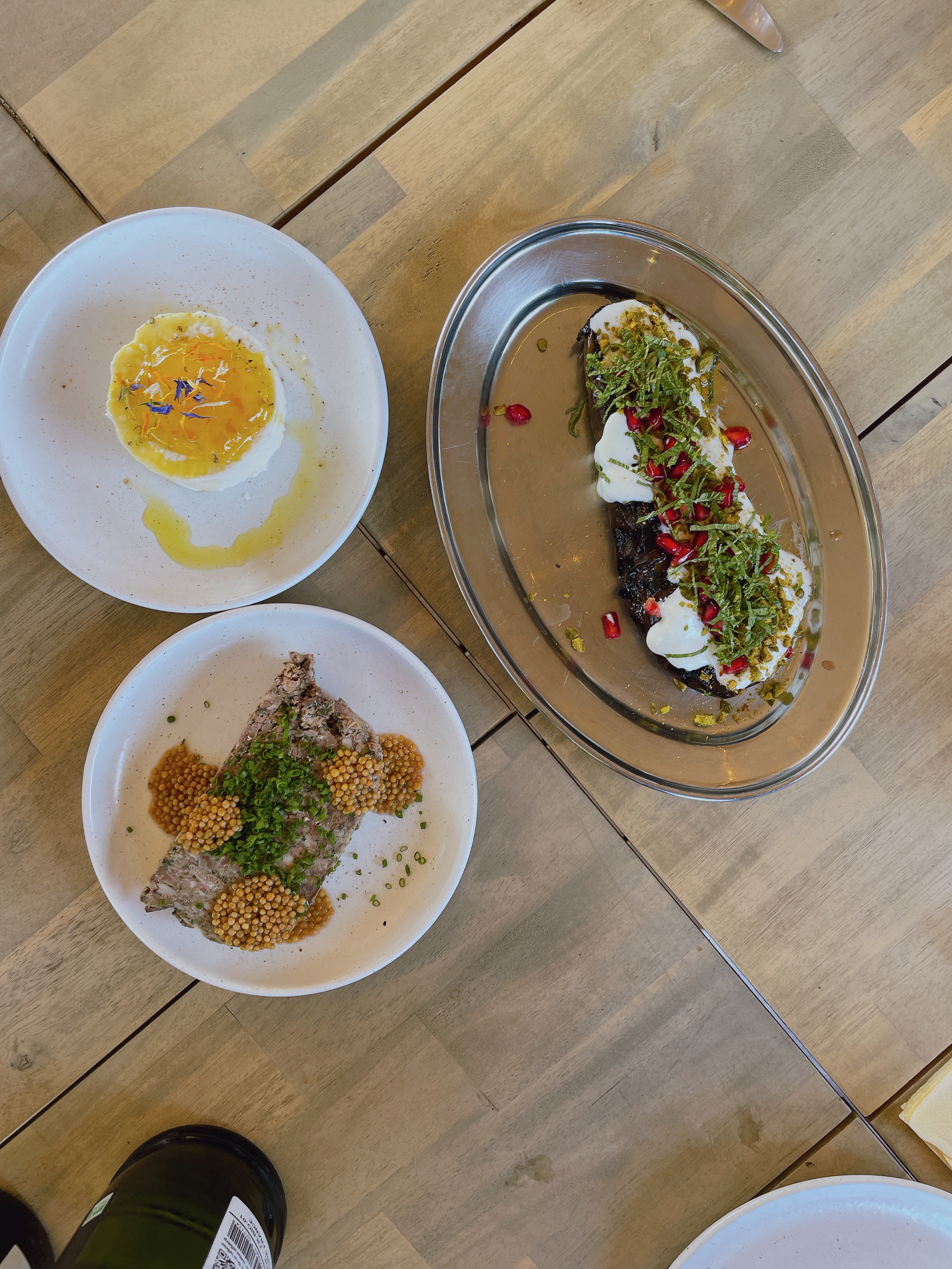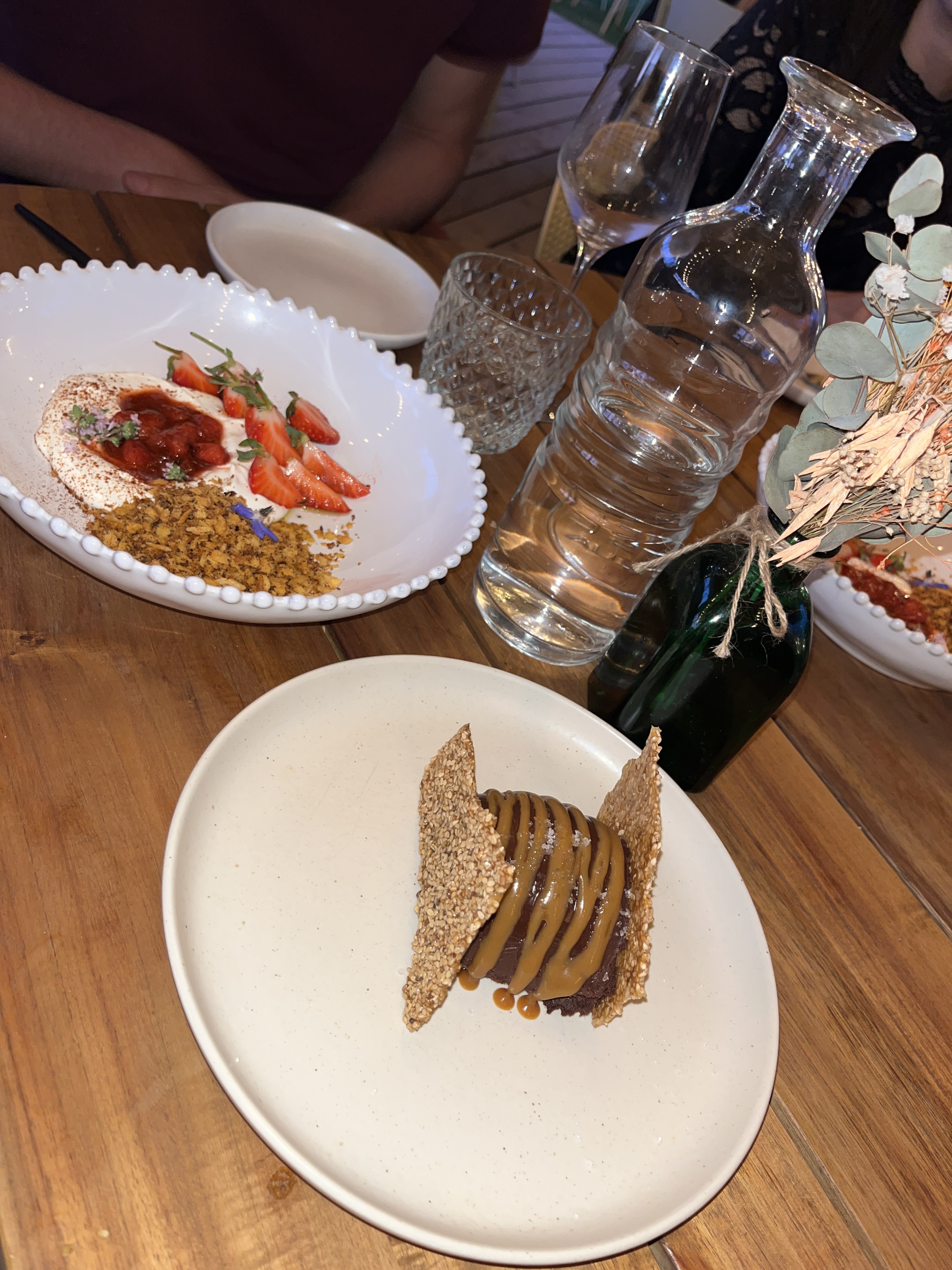 Cuisine délicieuse et concept très sympa avec les plats à partager ainsi que la belle terrasse. Cependant notre table était directement à côté du brasero et impossible de rester jusqu'au dessert avec la fumée qui nous brûlait les yeux et l'odeur qui était vraiment inconfortable. Nous avons eu une serveuse absolument charmante qui a pris notre commande mais le reste de l'équipe était à la limite du désagréable, voire de l'impolitesse. Même si on s'est régalés, je ne suis pas certaine qu'on y retournera ni qu'on recommanderait à des amis. Ou alors en précisant à la réservation qu'on veut un table très loin du grill !
