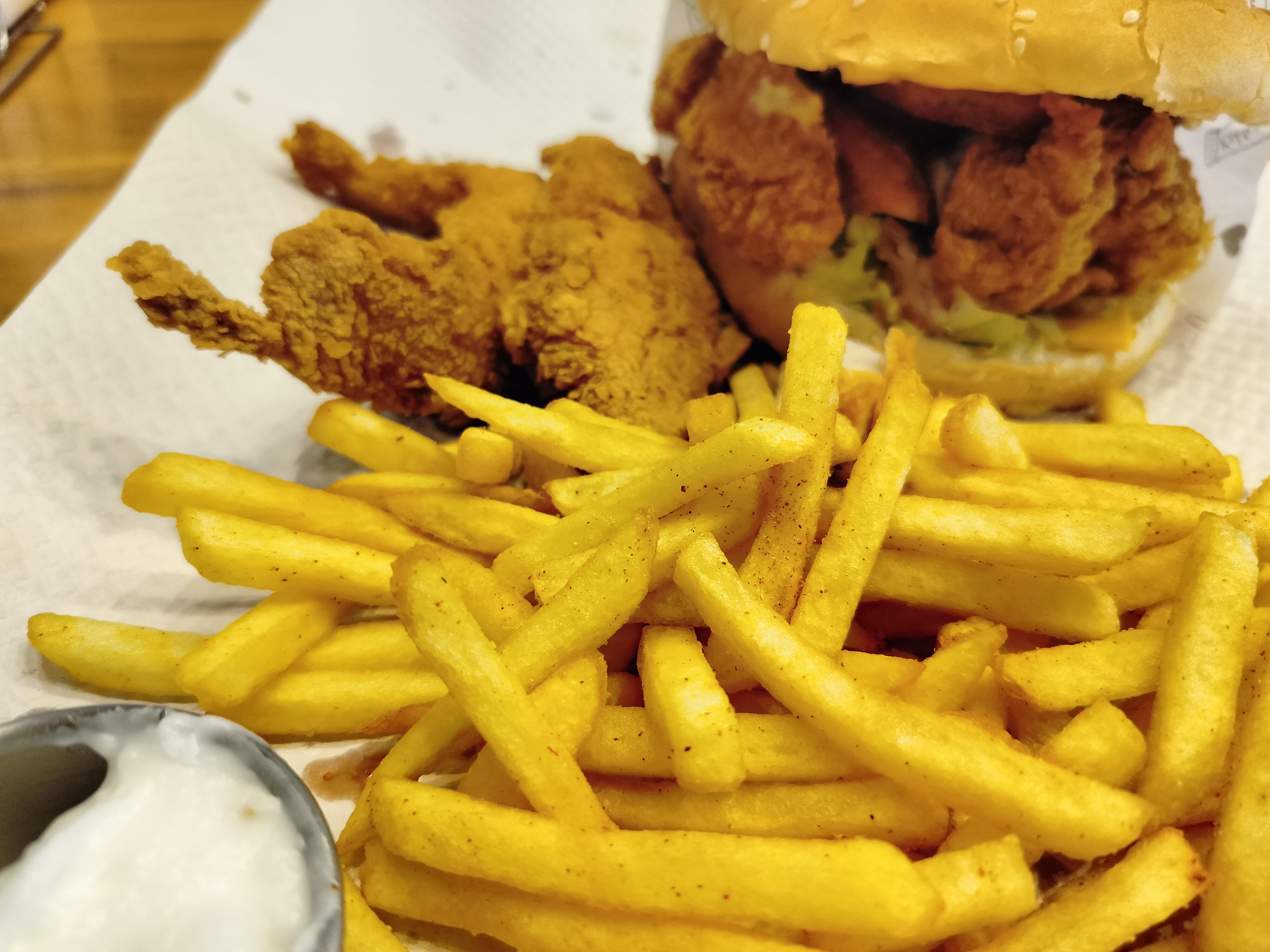 Un menu à 7€ très copieux, l'assaisonnement est un régal, les sauces aïoli et piment sont excellentes, j'ai trouvé ma nouvelle référence en terme de poulet frit ! Je le recommande grandement 👏