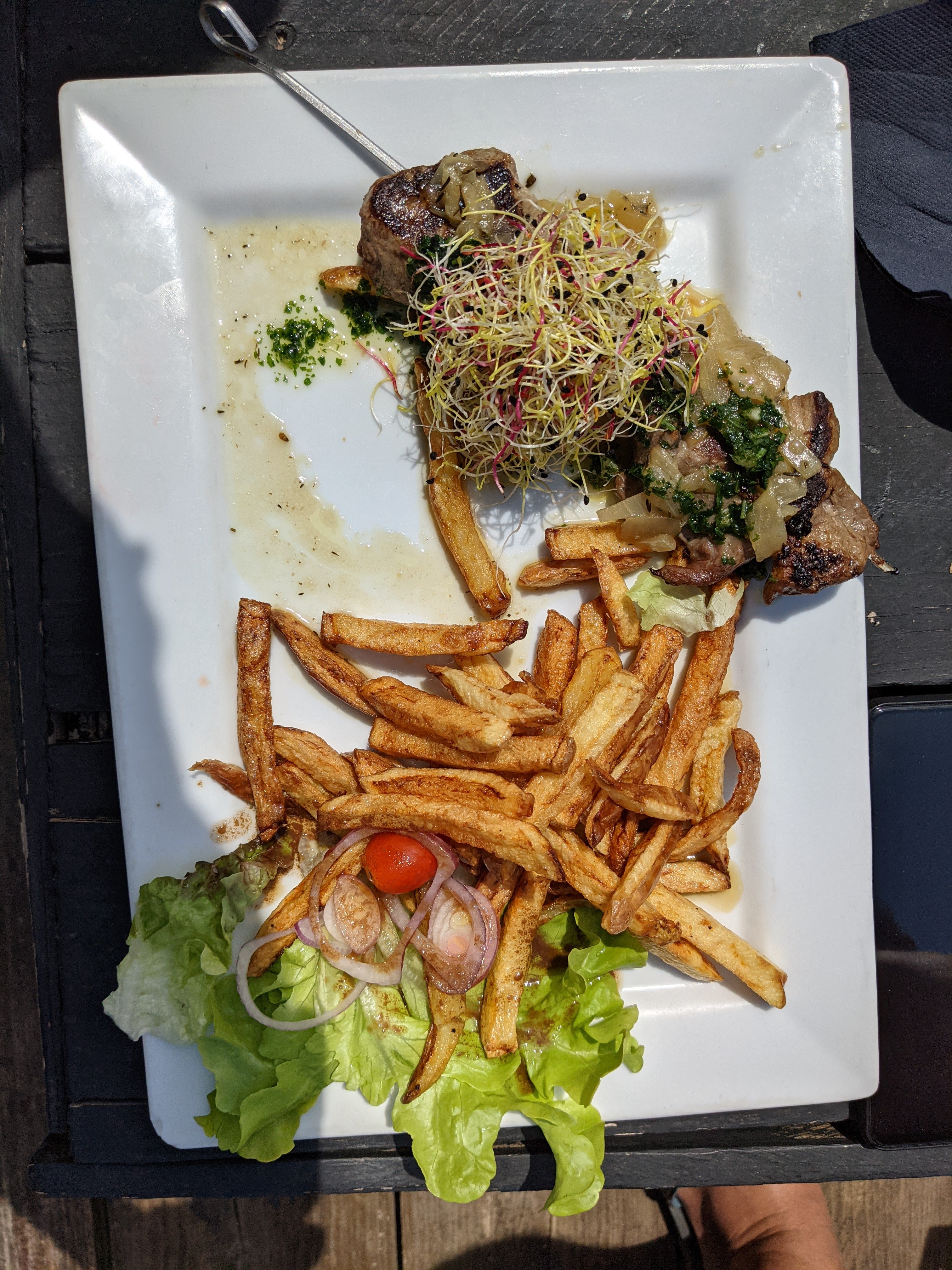 Lieu sympa idéal pour les amateurs de Windsurf . Bon rapport qualité prix . Le menu enfant était bon frites maison et le poulet également . Salade correcte bien présentée après pour 12€ c’était pas extraordinaire mais un bon rapport qualité prix . La vue est agréable . Lieu qui ne fait pas faire de gros détour avant de rejoindre l’autoroute donc cela est plutôt positif A terme faire un petit coup de ponçage sur les tables et de peinture cela commence à se faner .. le cuisinier était sympathique
