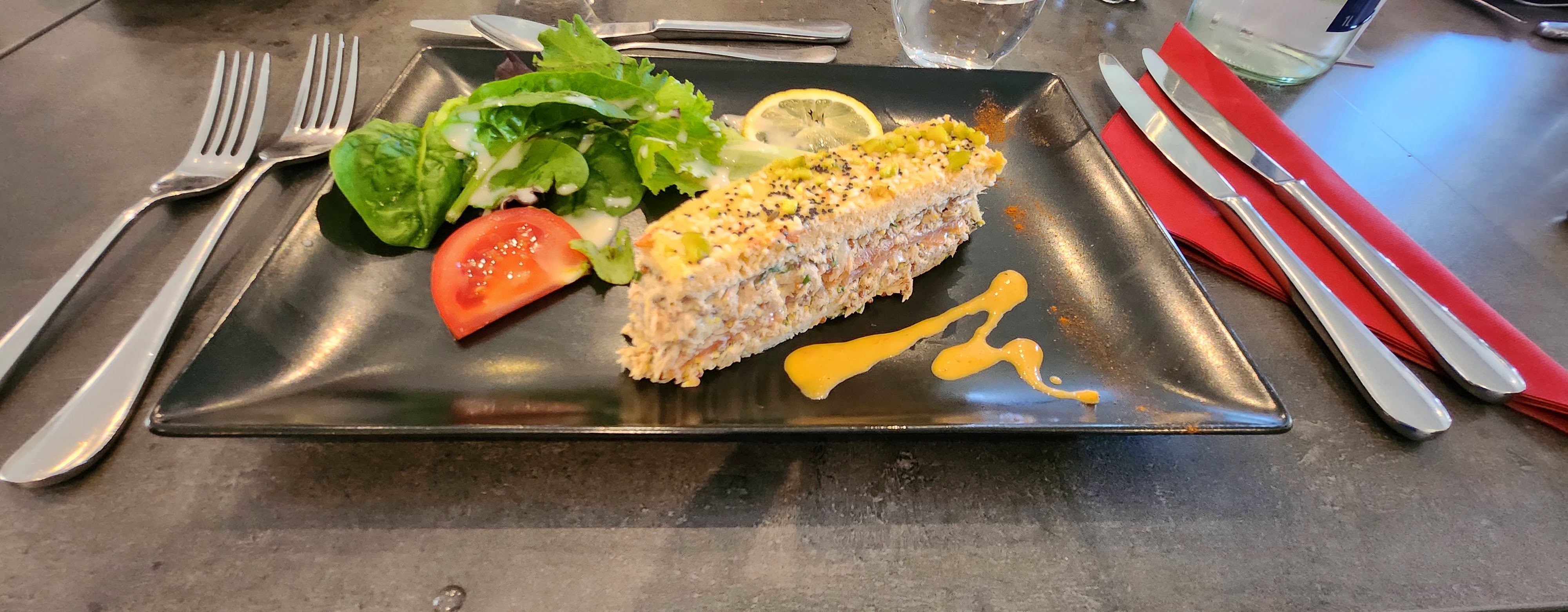 Le repas était très bon, belle présentation des plats le serveur très agréable dommage que les animaux soient refusés pourtant sur le site c'est mentionné animaux acceptés dommage !