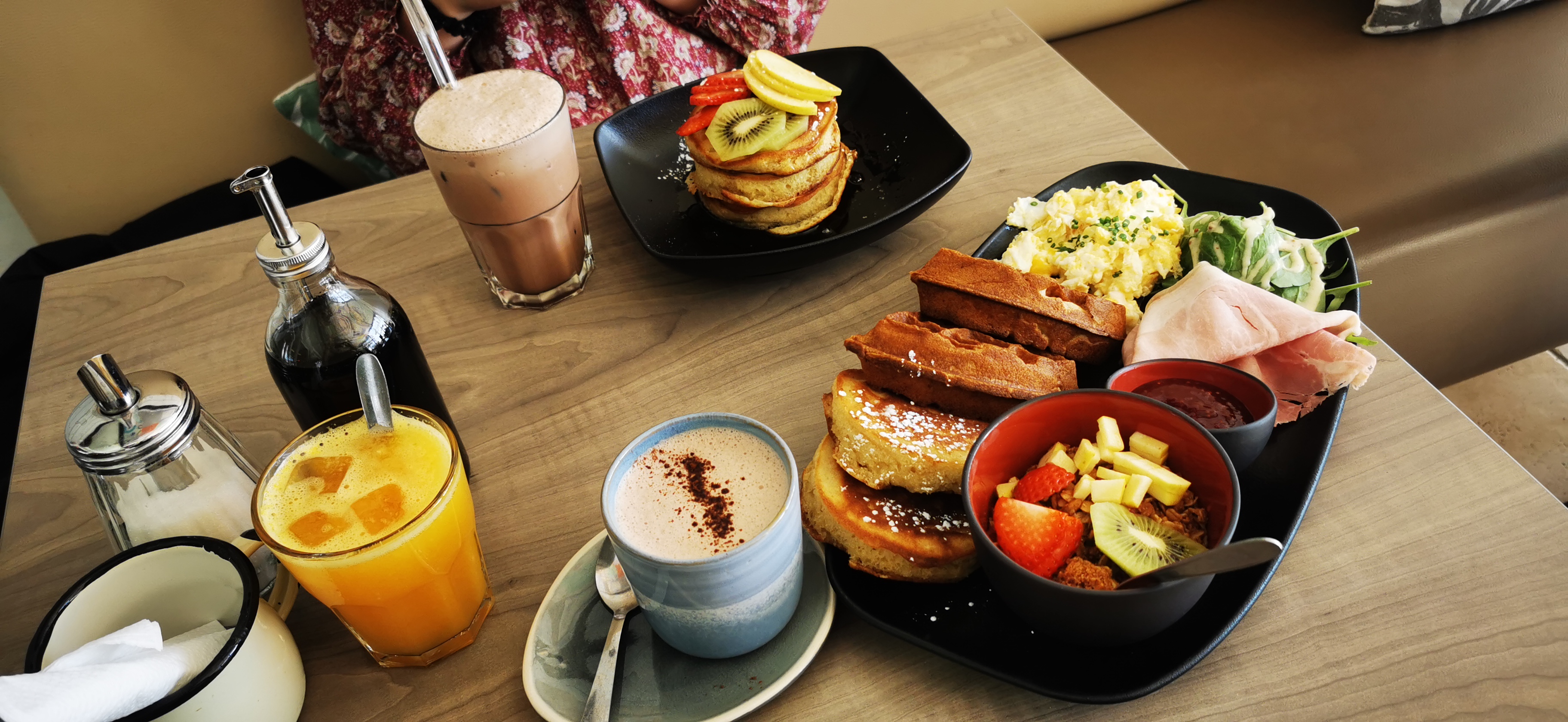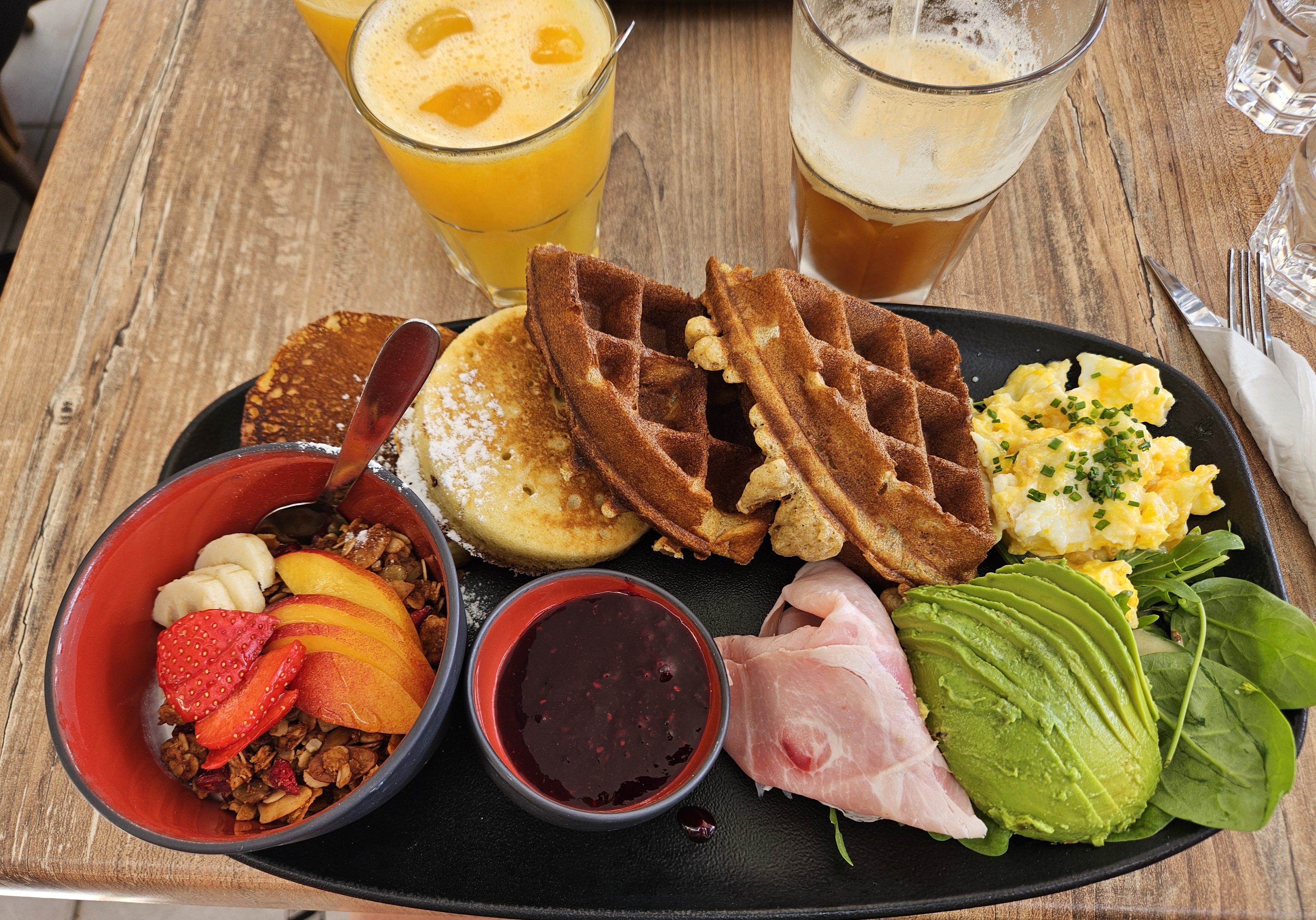 La formule brunch est parfaitement équilibrée entre le sucré et le salé, portion généreuse. Pancakes et gaufres savoureux et légers, œufs brouillés et jambon de qualité, granola délicieux et jus d’orange fraîchement pressé. Le cadre est magnifique et l’ambiance relaxante. Enfin l’accueil est simple et chaleureux. Un plaisir pour les yeux, les oreilles et surtout les papilles!