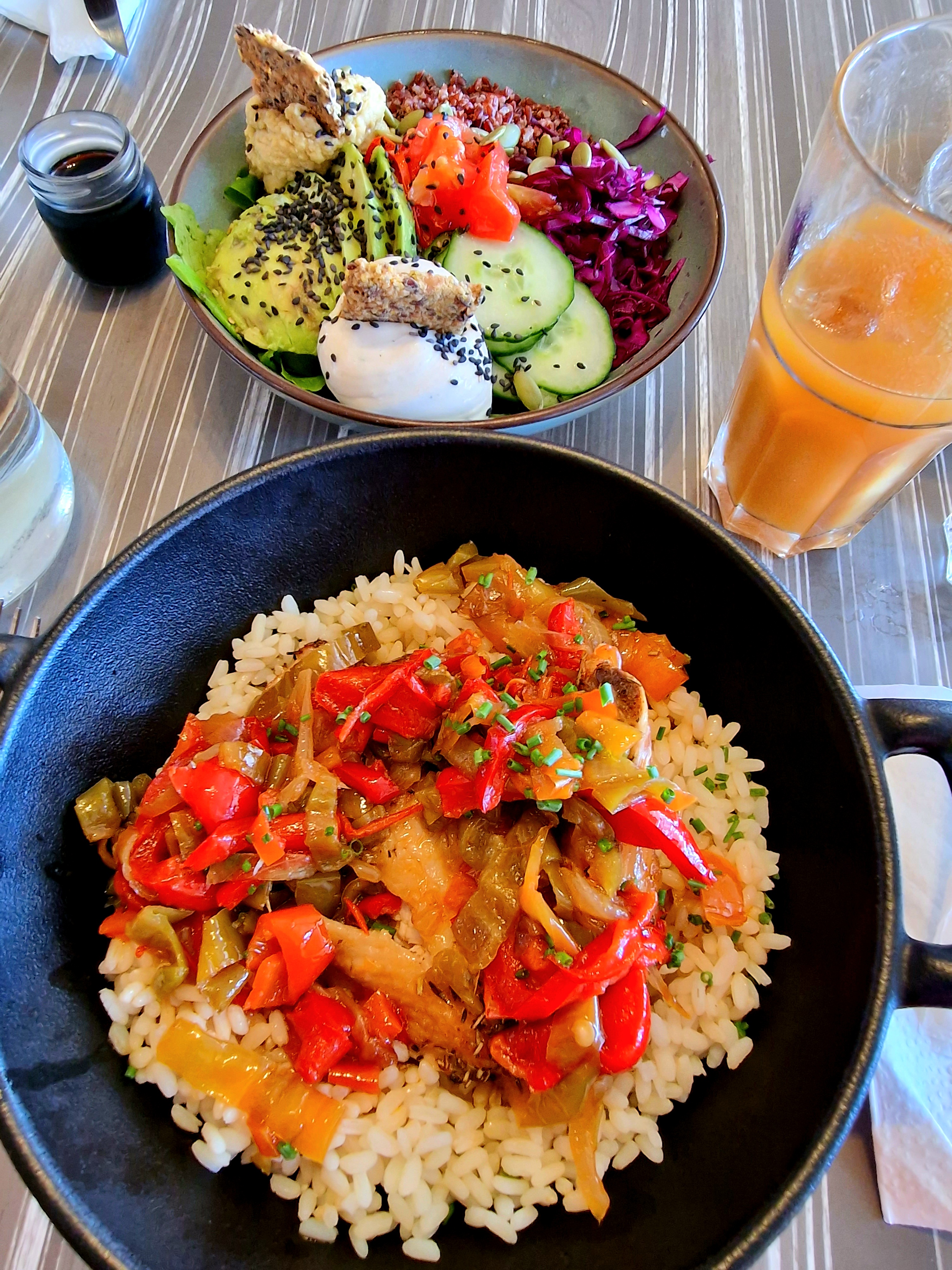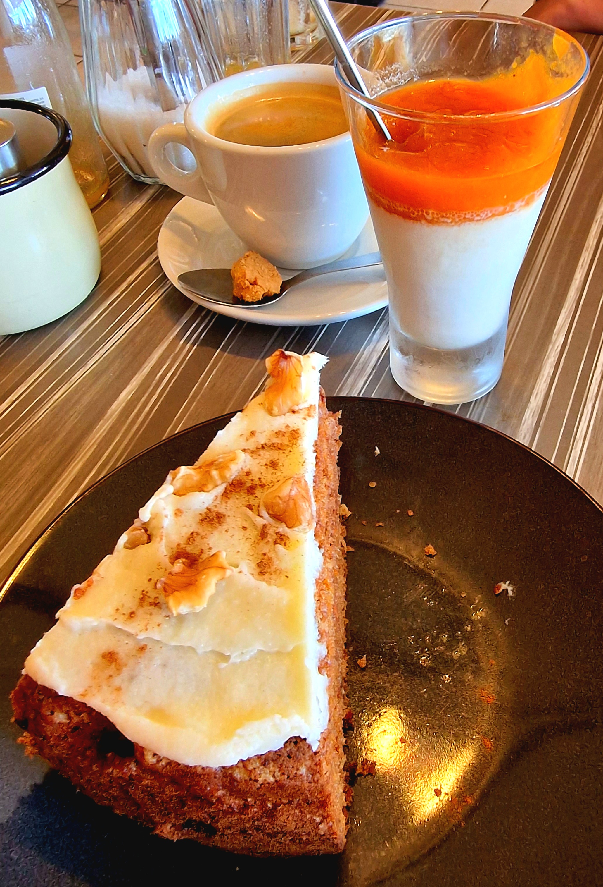 Nous sommes venus pour le déjeuner et un excellent service. On nous a donné des menus anglais et une carafe d'eau. Nous avons commandé un latte glacé avec du lait de soja et un cocktail de jus de fruits comme boissons. Ma femme avait le bol Bouddha qu'elle adorait et j'avais le riz au poulet spécial du jour avec des poivrons et des oignons, vraiment bon. Nous avions prévu de ne prendre qu'un seul plat mais comme nous aimions tellement le plat principal, nous avons pris le dessert. Ma femme, la panacotta aux abricots et moi avons eu le gâteau aux carottes (et quelle grosse tranche dont personne ne se plaindra de la taille des portions !!) Le café était également excellent. Félicitations aux deux dames qui n'ont jamais arrêté de travailler. Nous reviendrons demain.