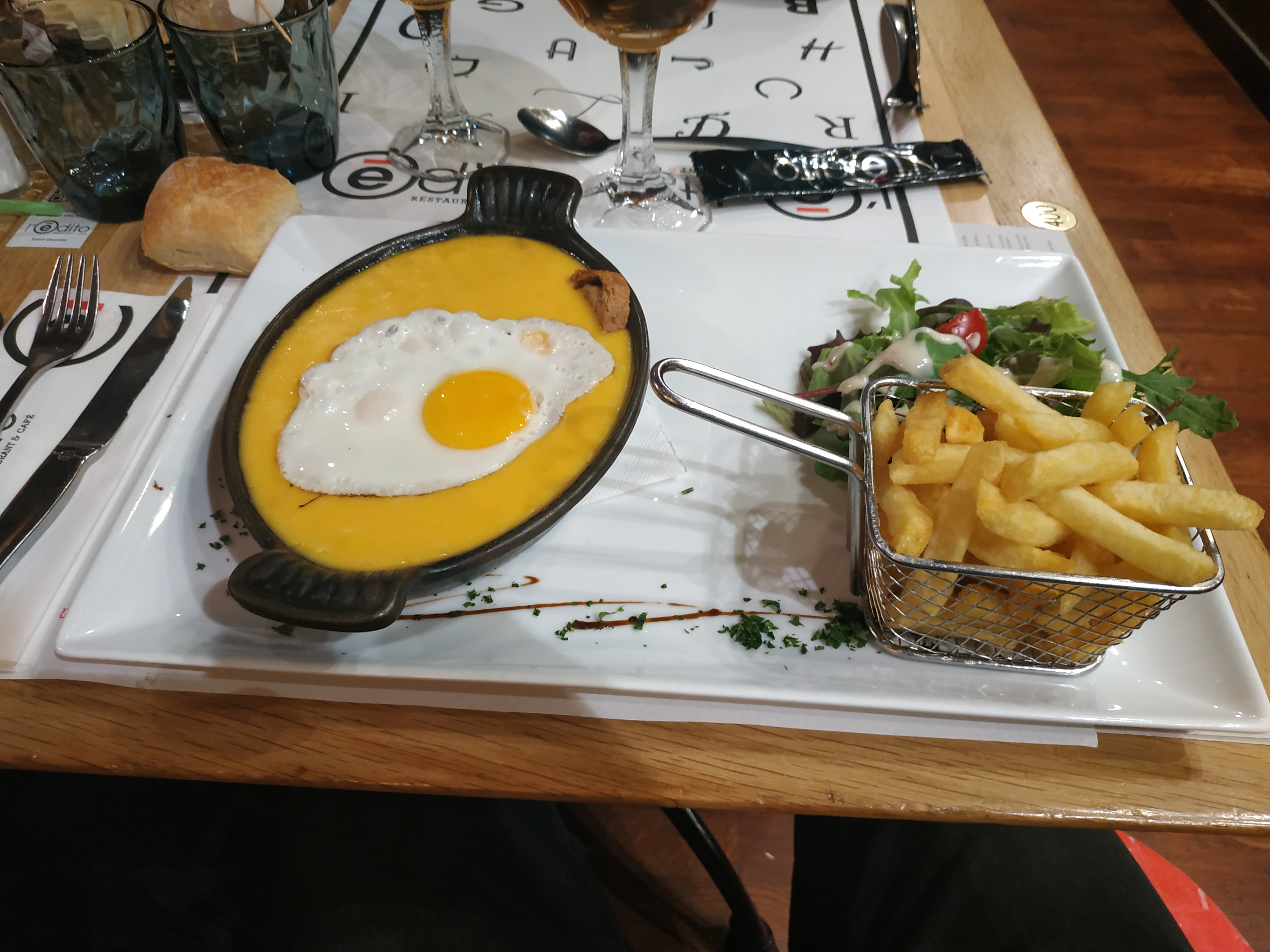 J'ai retrouvé des morceaux de coquille d'oeuf dans l'Oeuf cocotte aux camembert, a savoir que le jaune étais trop cuit. Les frites ont le goût d'huile usagée. Personne est venu nous demandez ce qu'on voulait boire pendant le repas. Donc je suis reparti avec la soif. Je déconseille fortement ce restaurant.