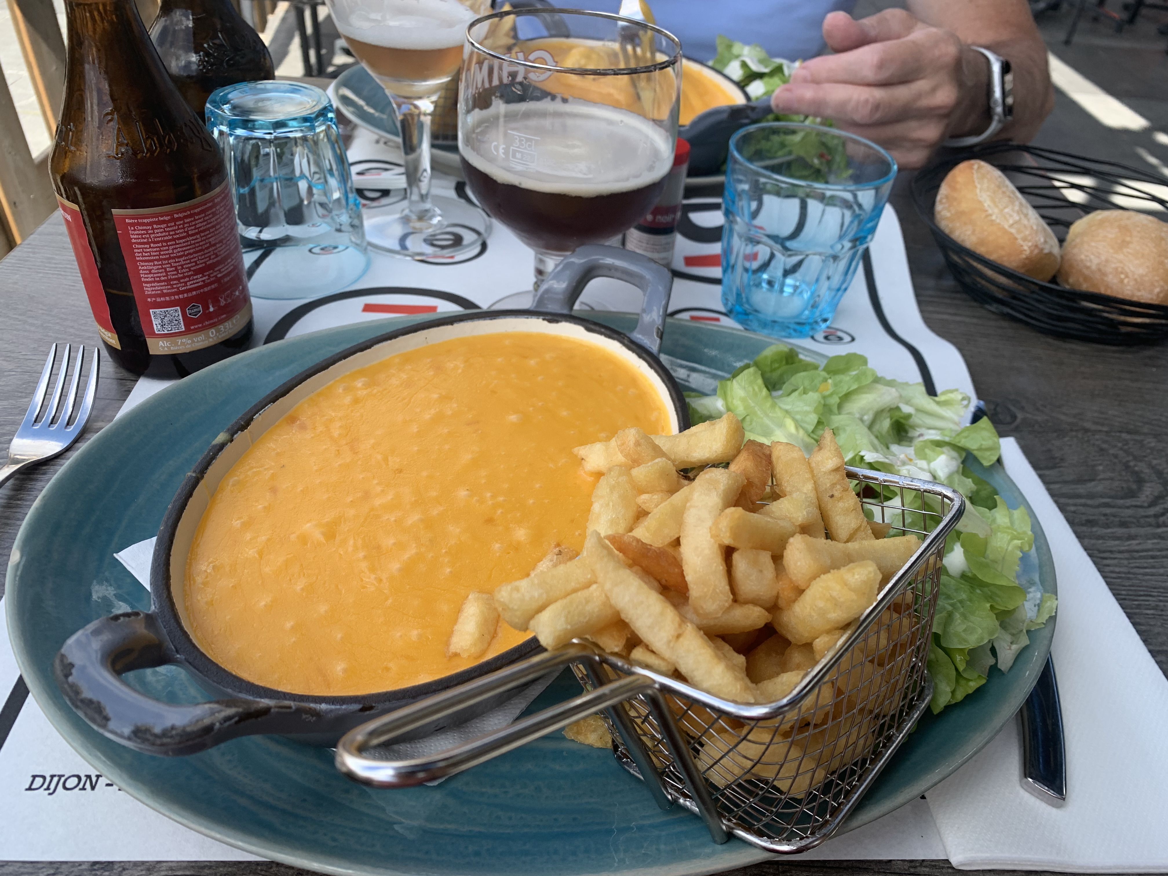 Très beau cadre et situé sur une grande place en plein centre-ville. Choix de bières intéressants. Les plus: - serveur assez sympa et disponible lors de notre visite. - dessert café gourmand franchement bon et bien fournis. - plat principal ok. Les moins: - dommage que l'on nous serve nos vins pour le repas quasi en même temps que l'apéritif (en l'occurrence 2 bières spéciales) à peine entamé et que le repas arrive si vite qu'il faille quasi tout le repas pour boire notre bières. Résultat on se retrouve à terminer le vin avec le dessert. Et détail important le vin blanc était tiède.