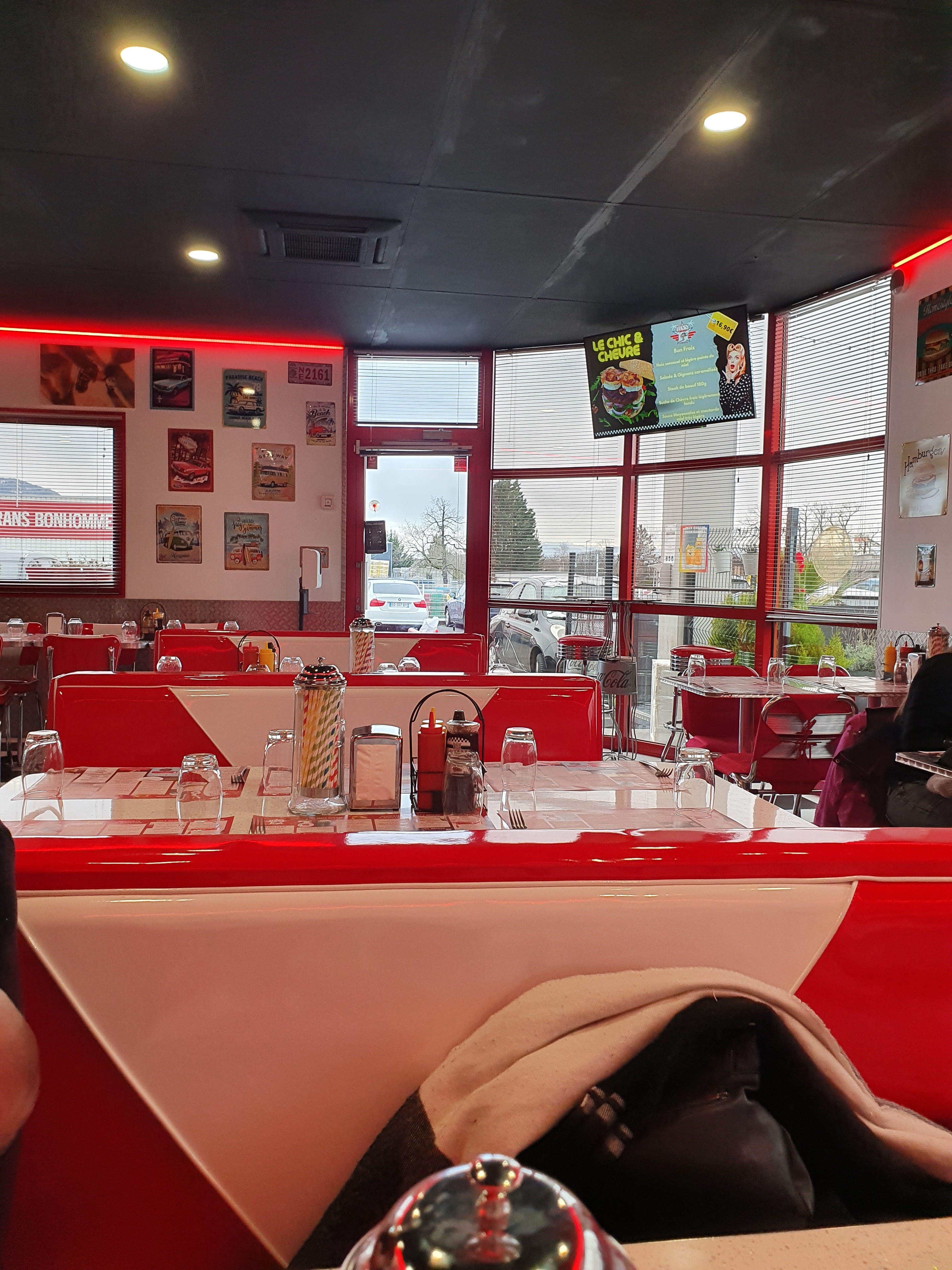 Belle découverte que ce diner US style 50's dans la zone de Ville-la-Grand. Grand choix de burgers simples, doubles voire triples.. Ils sont très bons et bien disposés dans l'assiette avec frites, demi épi de maïs et sauces à disposition. Egalement belles salades à essayer. Le vaste parking peut en plus accueillir nos Mercury, Chevrolet et autres Cadillac.!!
