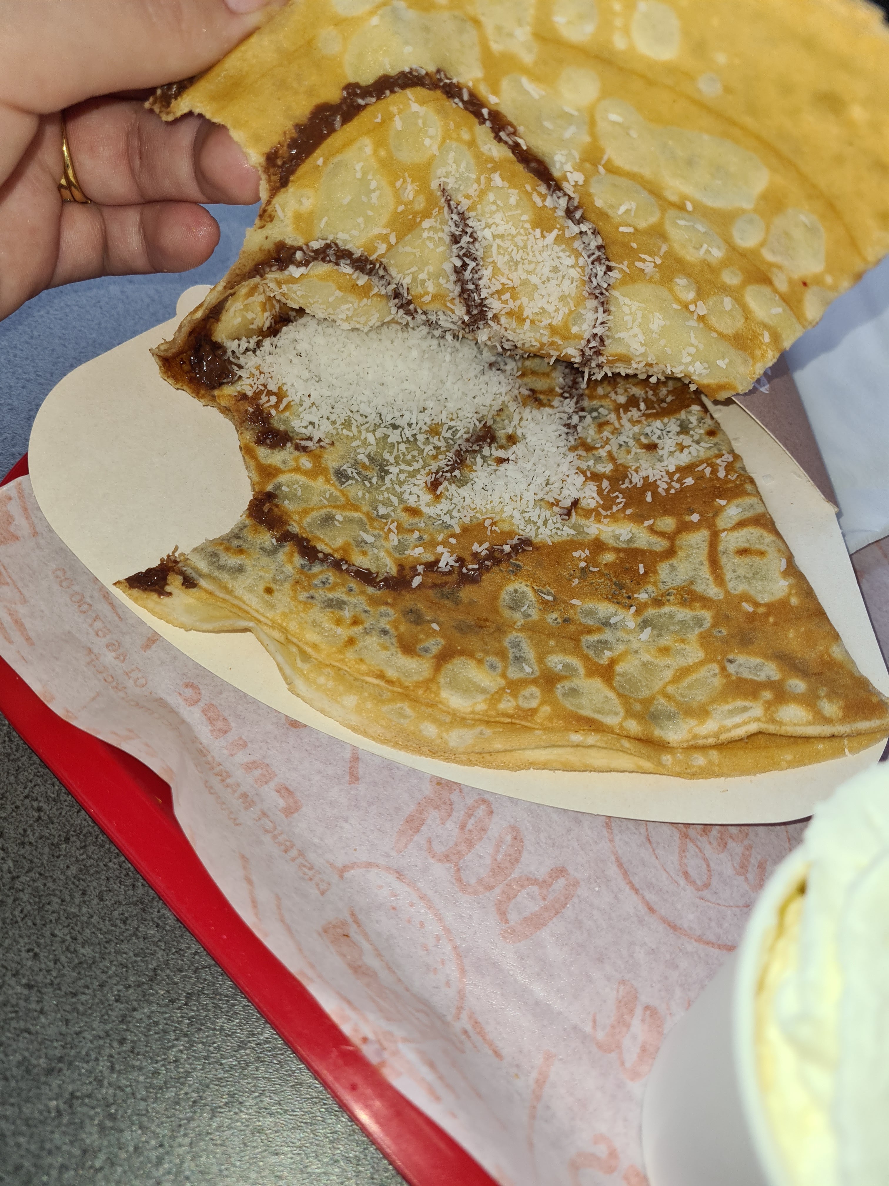 Crepe nutela coco banane juste banane et coco a l'intérieur tres déçue crepe salé ingrédients tres bas de gamme juste imonde mauvais accueil attente longue enfin bref a fuir pour ma part même gratuit je ne donnerai pas a mes enfants