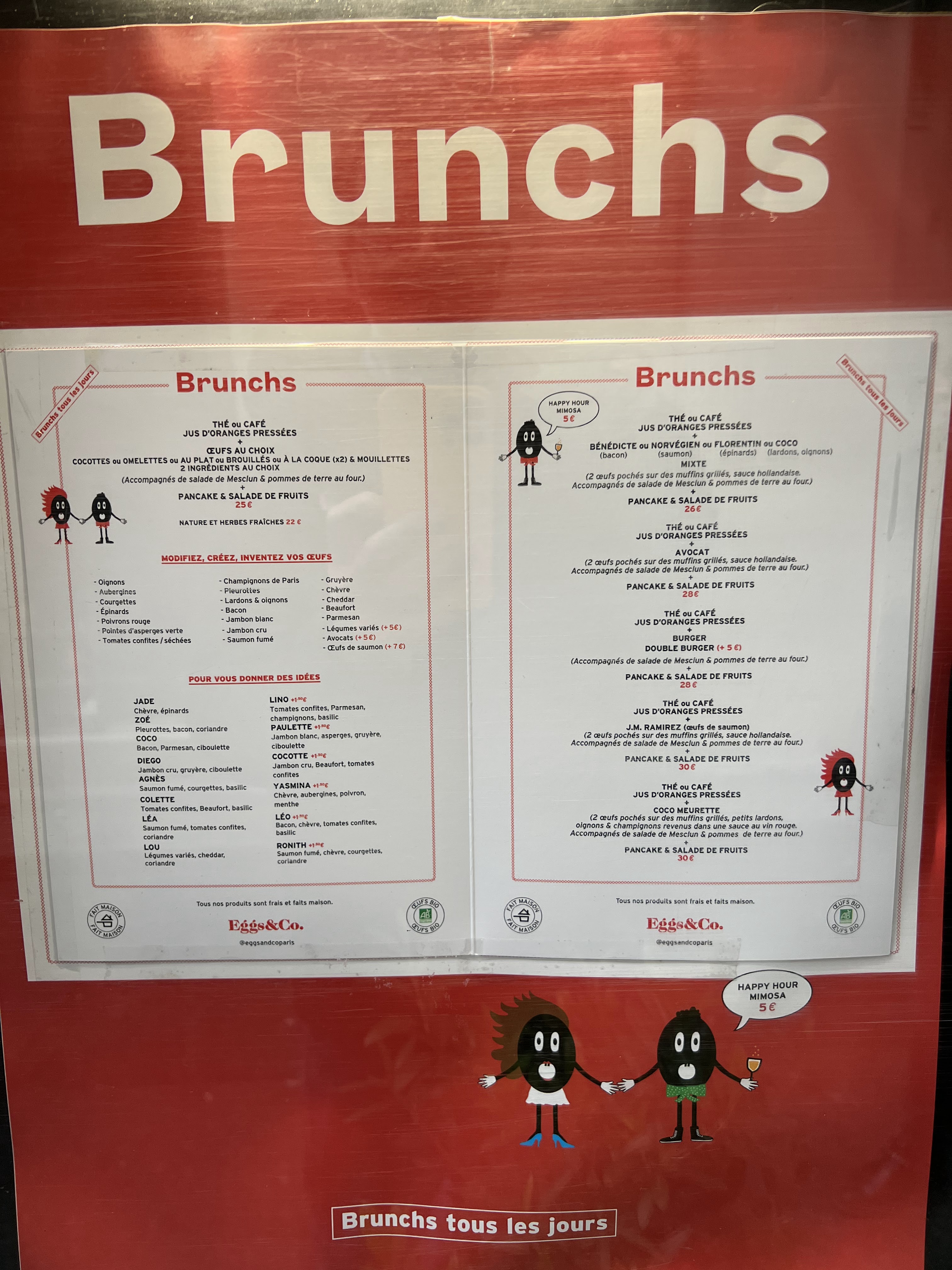 Pour lancer une journée de visites à Paris, Eggs and Co est une option de brunch fantastique et saine. - Pour 22 €, ils ont un brunch combiné - Le brunch comprend du jus d'orange + des boissons (chocolat chaud, variétés de café) + plat d'oeufs (omelette / œufs Benedict) avec un côté de pommes de terre au four et de salade + crêpes avec des fruits frais. - J'avais assez faim pour en manger chaque dernier morceau, mais les gens partageaient également une assiette. - Le personnel est très sympathique et efficace et très rapide avec les commandes. - Le décor est également adorable, ajoutant au charme de l'endroit. - Ils acceptent toutes les cartes Les inconvénients: - Longues files d'attente! Il y avait environ 20 personnes derrière moi dans la file d'attente dans la rue étroite à l'extérieur, et la curiosité attire encore plus de visiteurs. Mais ça vaut le coup d'attendre.