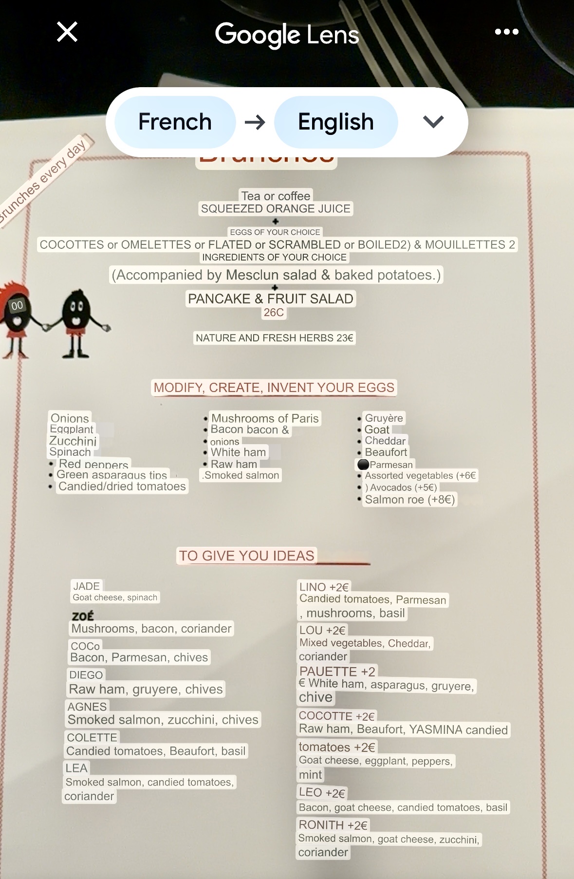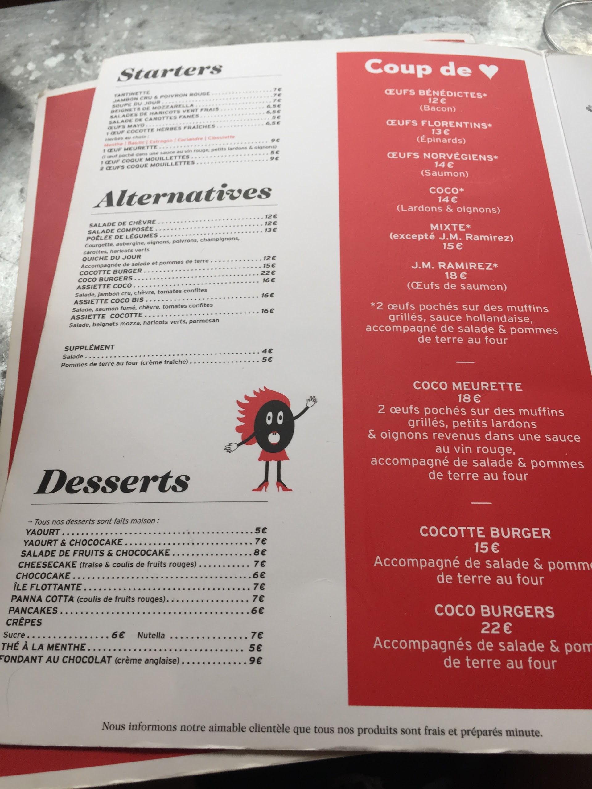 Ici en vacances et j'ai mangé des œufs Bénédicte, des crêpes, des fruits et c'était vraiment bon. Le cappuccino était bon aussi. Le service client était super !!!! Si jamais vous êtes à Paris ou dans les environs, je vous recommande de passer par là.