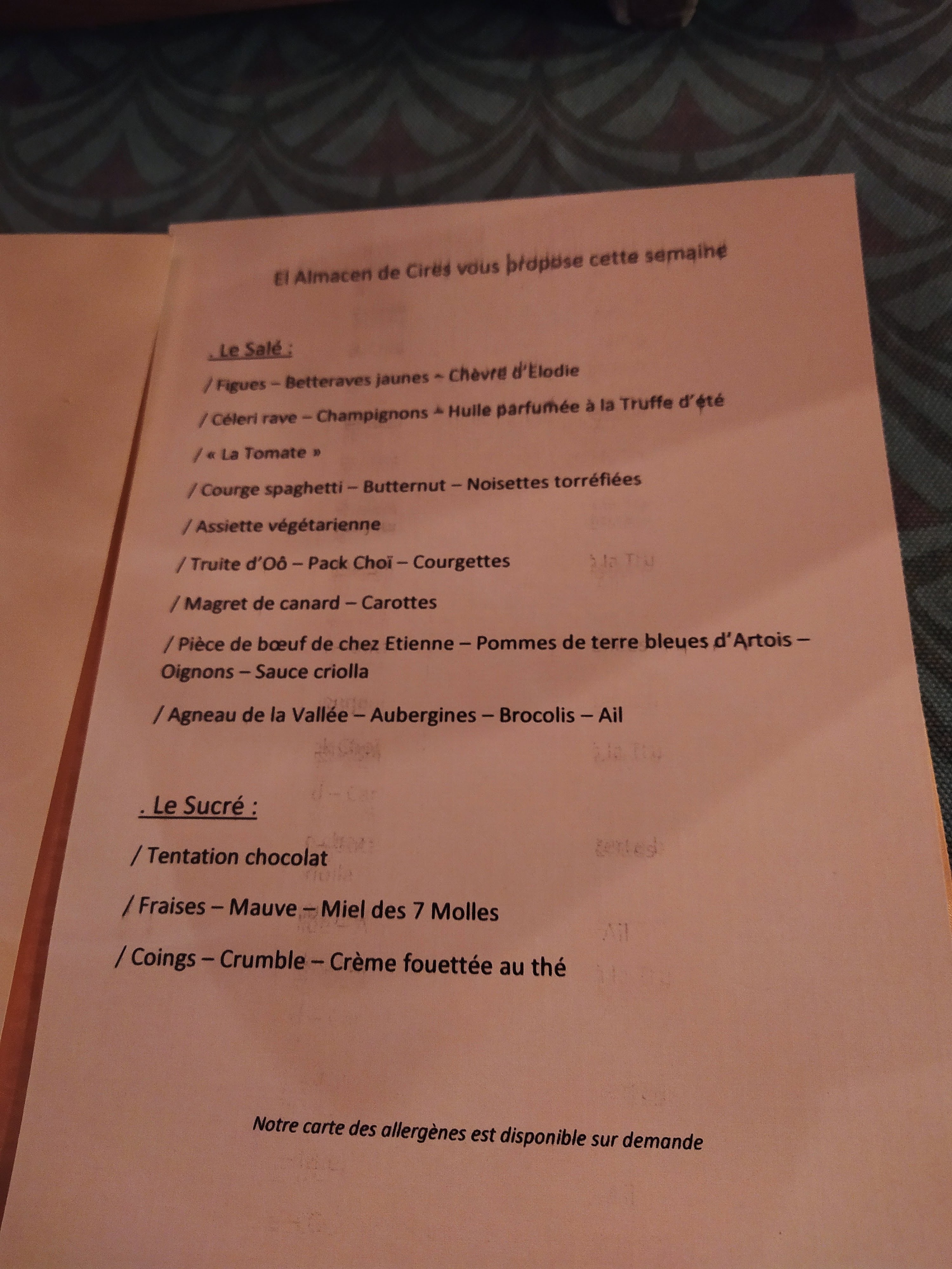 nous pensions manger à la grange, c'est El Almacèn qui nous a accueilli. Très bon accueil. Menu à un peu plus de 30€ par personne (apéro mais pas de vin). 1 seul menu entrée plat dessert avec 3 possibilités à chaque fois (truite, magret ou pieces de porc pour le plat par ex). On a bien mangé mais ça ne nous laissera pas un souvenir impérissable. Ma note est 3,5.