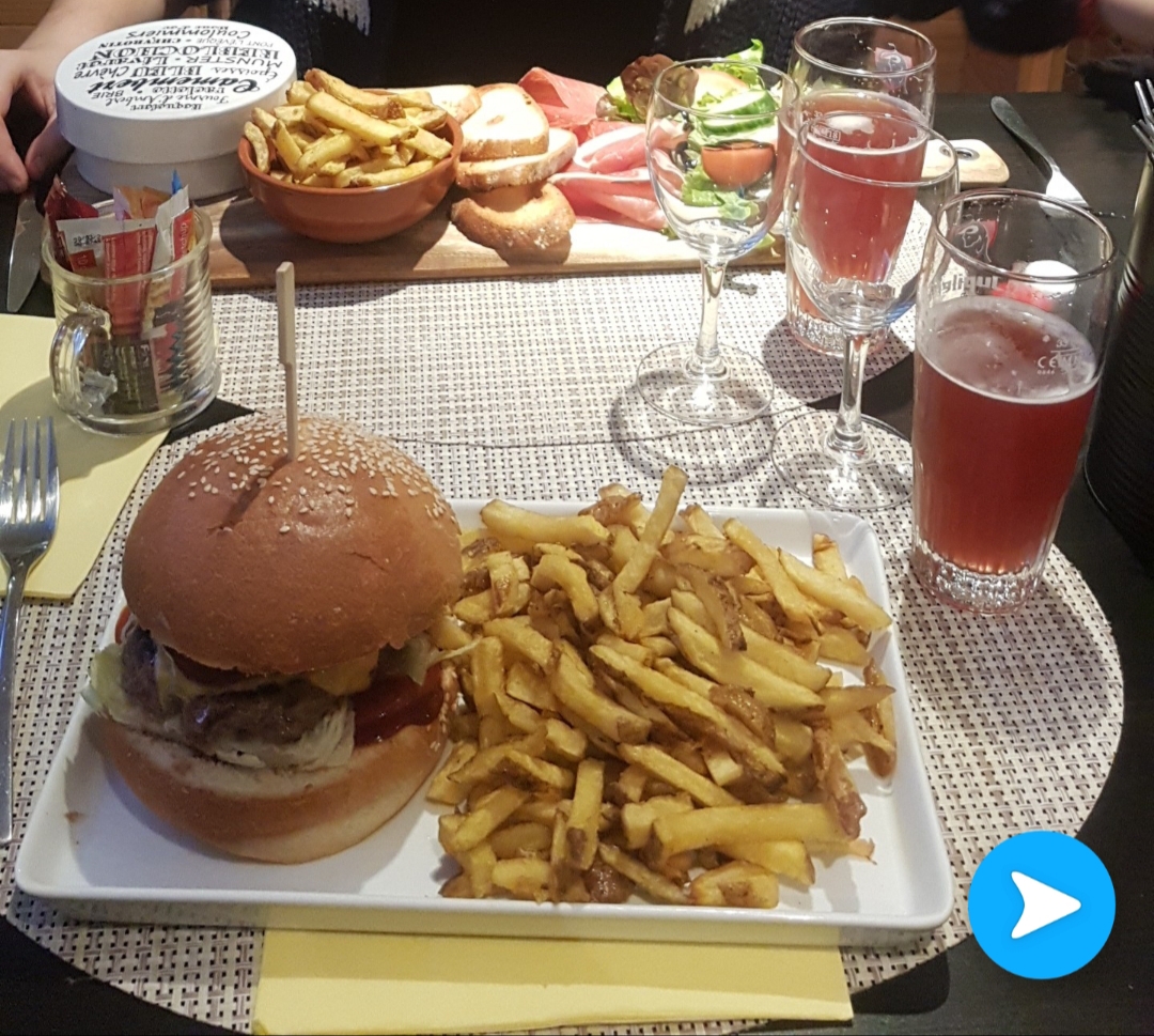 Burger avec frites maisons pour moi et camembert au four avec jambon cru pour mon amie , une regalade comme d'habitude . Je recommande