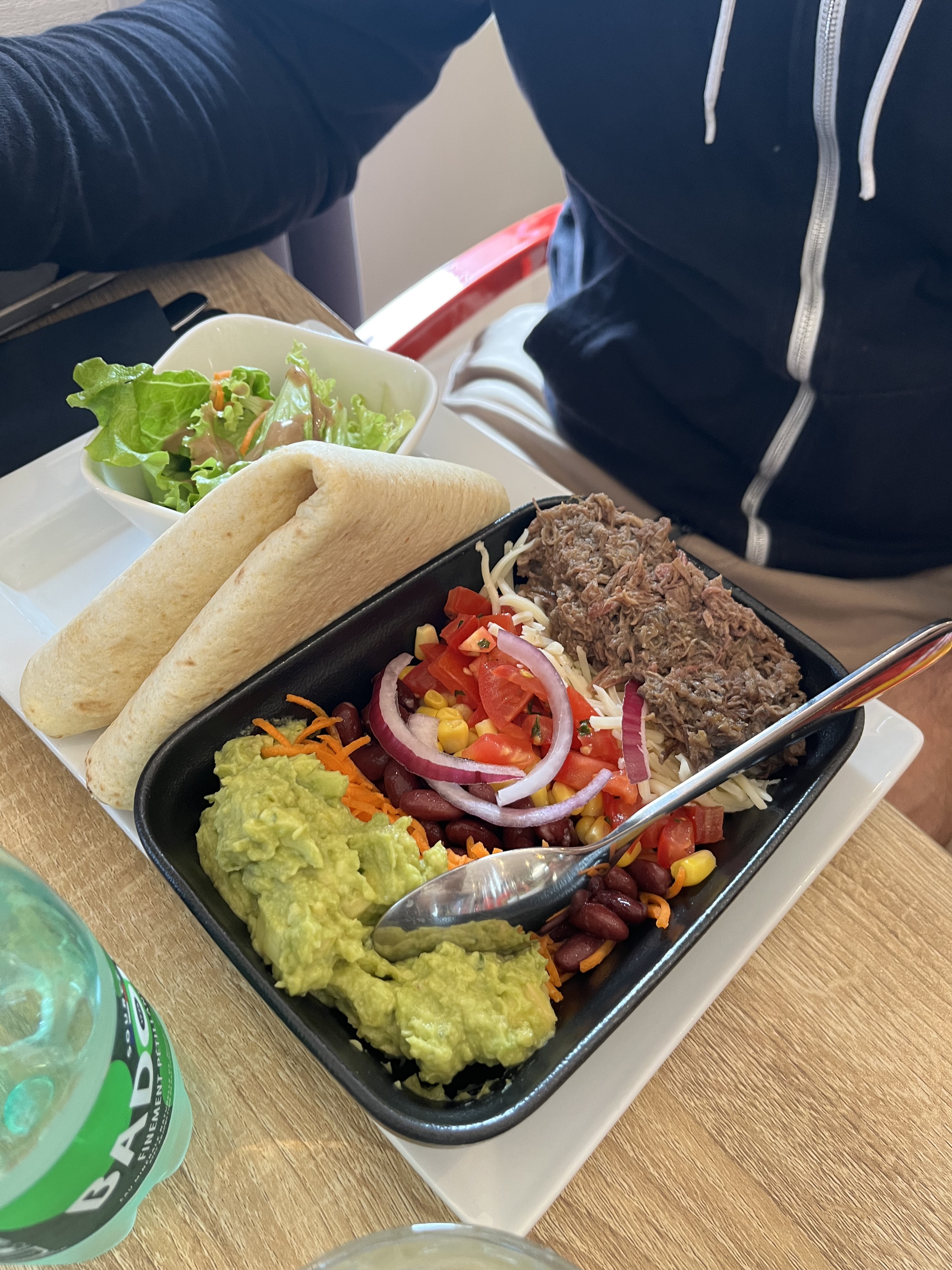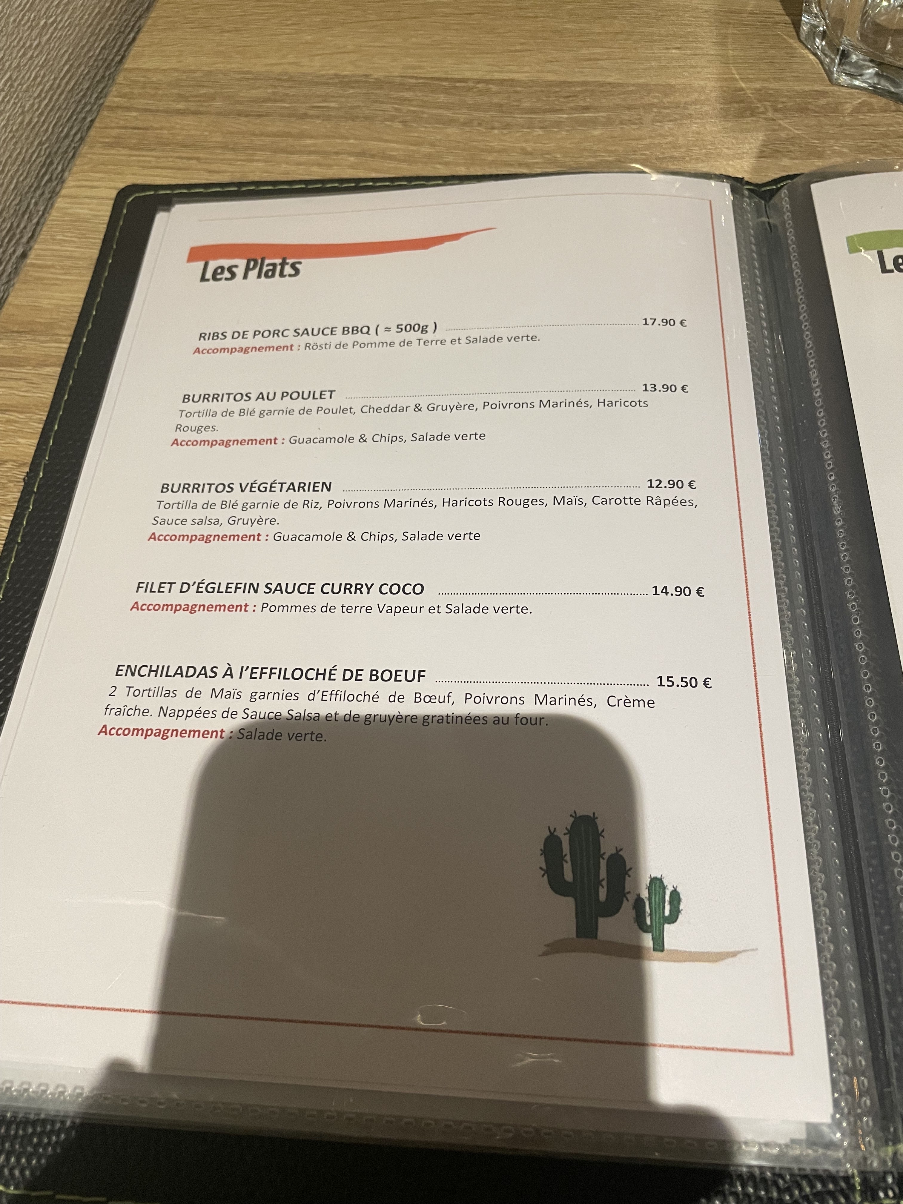 Bonne expérience ! Le punch en apéro était excellent, accompagné de nachos qui eux aussi était délicieux ! Plat assez copieux, burritos au bœuf qui avait du goût! Qu’il faut manger assez rapidement sinon cela refroidit ( mais pas dérangeant ) Je recommande vivement, bon rapport qualité/prix