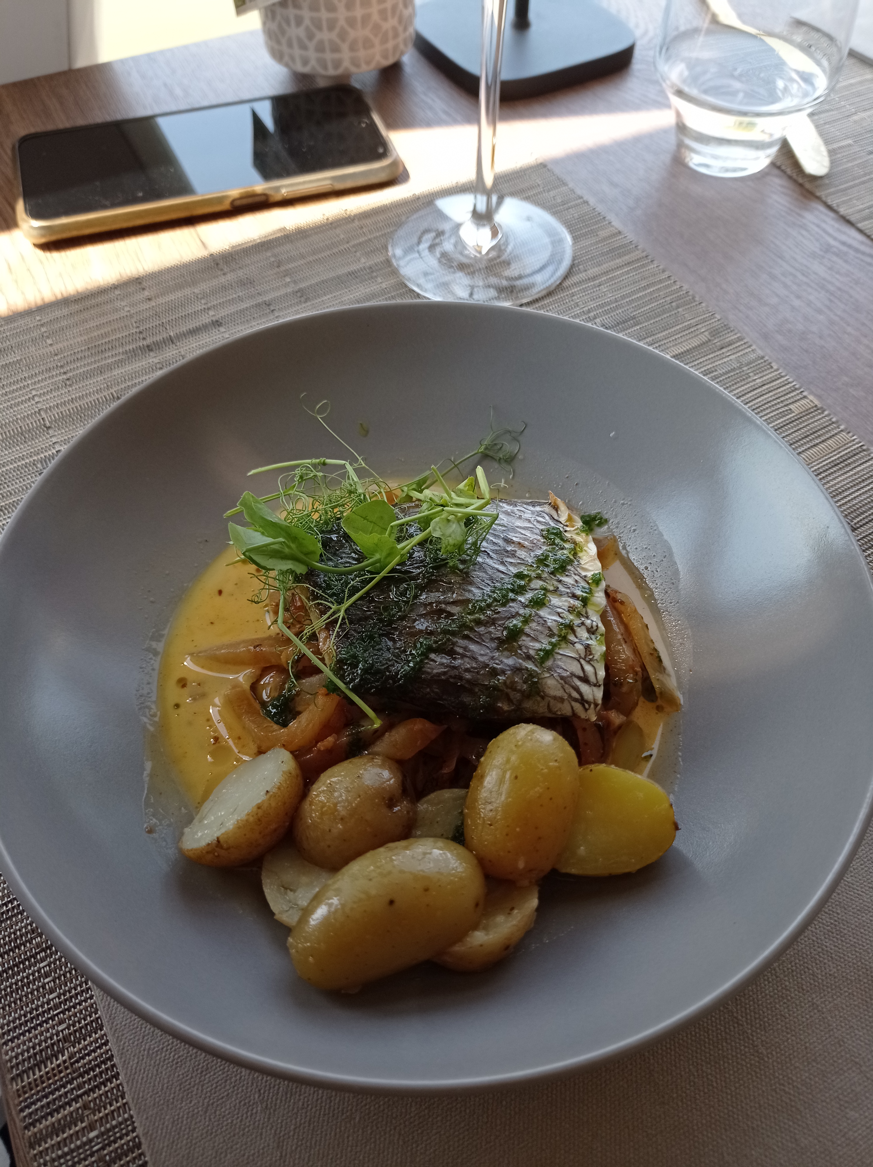 Nous J'y suis allé pour le déjeuner. Il y avait le menu recommandé. C'était très savoureux. Le poisson était cuit à la perfection. Les plats d'accompagnement étaient tous fraîchement préparés. Le dessert s'est terminé avec succès. Le vin rouge recommandé s'est bien accompagné du repas. Un très bon bateau restaurant. A bientôt.