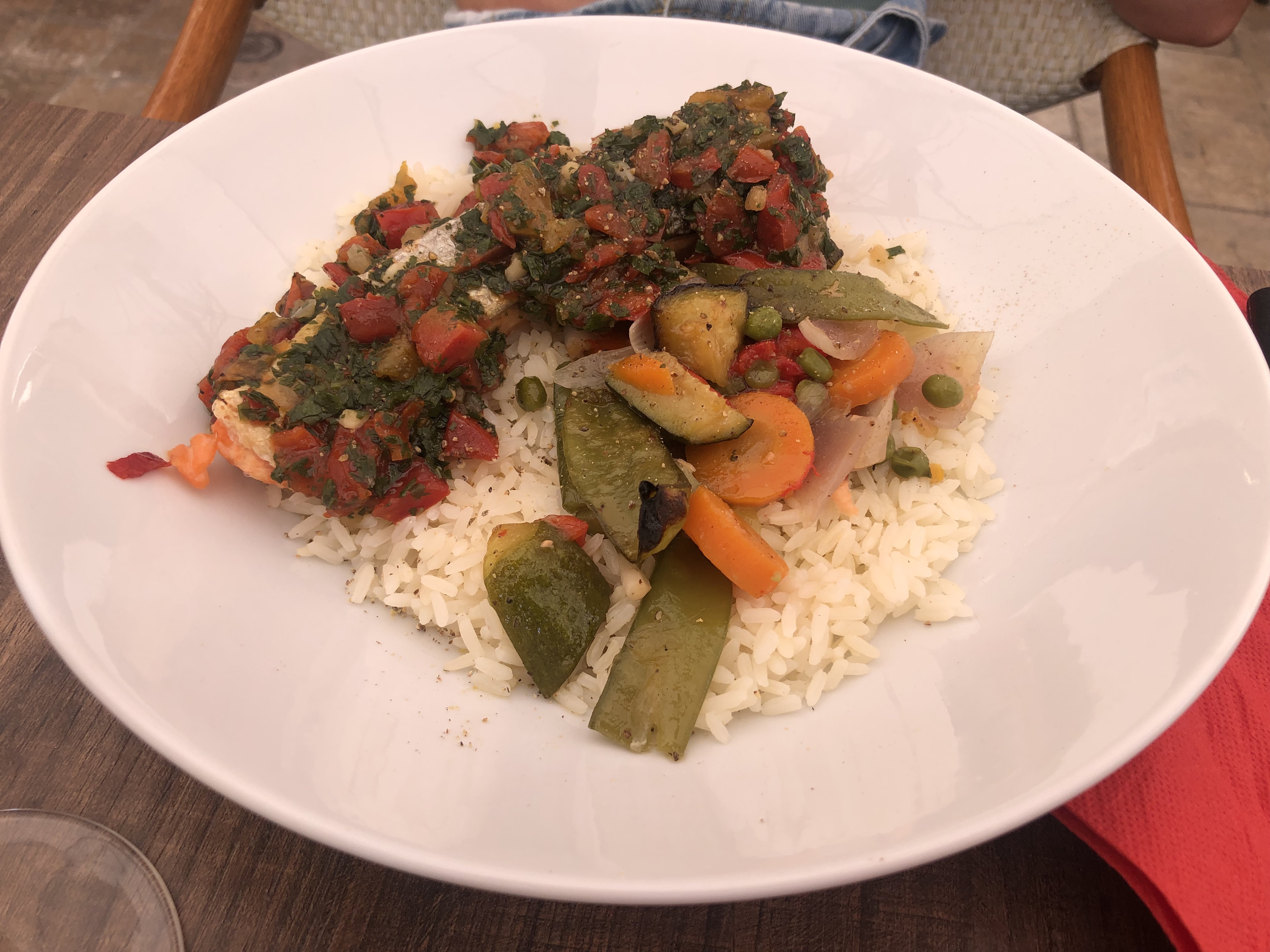 Un apéritif au soleil en ce 28 janvier puis repas à l intérieur. Service impécable et très bonne cuisine. J ai pris le plat du jour crevette, poisson et légumes.