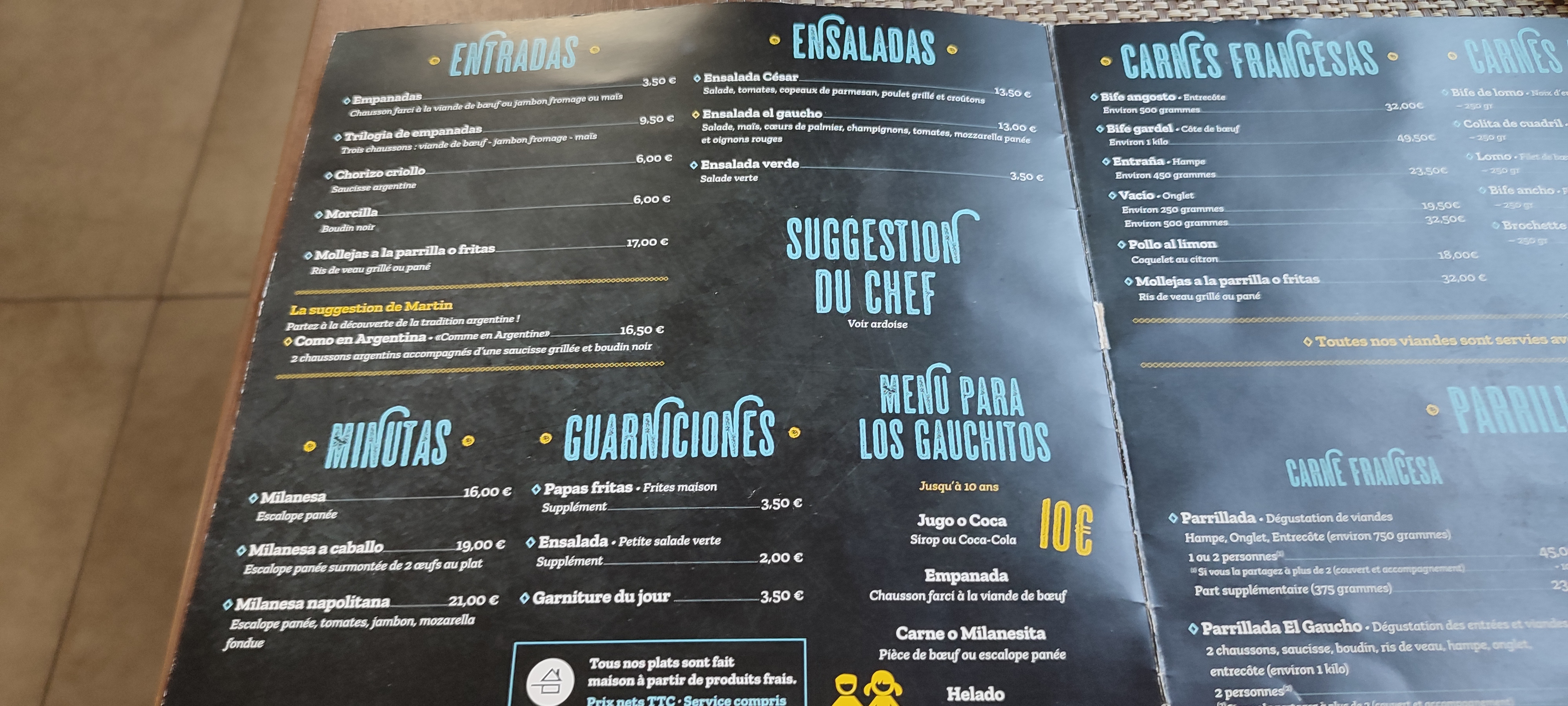 N'hésitez pas à venir le jeudi pour un menu unique et à volonté viandes et frites avec un dessert. La viande est excellente et bien cuite au feu de bois. Le prix est très abordable pour un menu à volonté et le vin aussi était excellent. Viva Argentina 🇦🇷