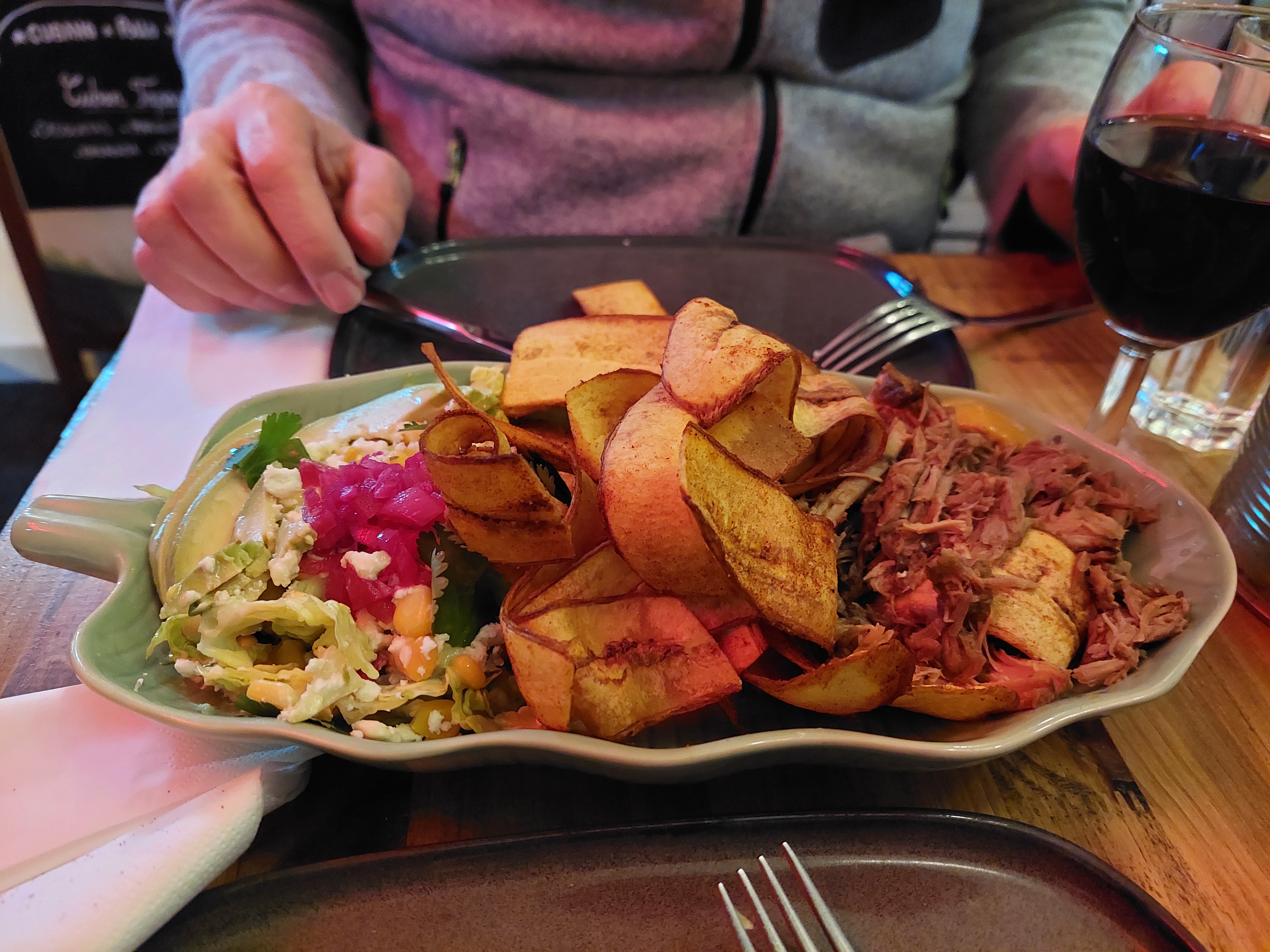 Après une journée intense, c’est avec le plus grand plaisir que je me suis posée au Lechón. Tous les sens sont gâtés : la déco et la présentation sont un bonheur pour les yeux, la banquette bien confortable pour les fesses, la musique ni trop faible ni trop forte agréable aux oreilles et les odeurs de cuisine qui mettent en appétit et font piaffer d’impatience en attendant l’arrivée des plats 🤩 Je n’avais pas assez faim pour le sandwich ultra copieux (que j’ai quand même gouté dans l’assiette voisine et……MIAM! Une tuerie !) donc j’ai choisi la succulente assiette, à tomber ! 😋 La petite salade est divine, les chips de plantain apportent la petite gourmandise exquise aux papilles et au moral et la viande…….. c’est tout un poème ! Marinée 6h et cuite 6h (le chef me corrigera si je me trompe de qqs heures 🙄) bref, un truc de malade !!! N’hésitez plus, courrez-y ! Nous nous y croiserons certainement 🫶🏽