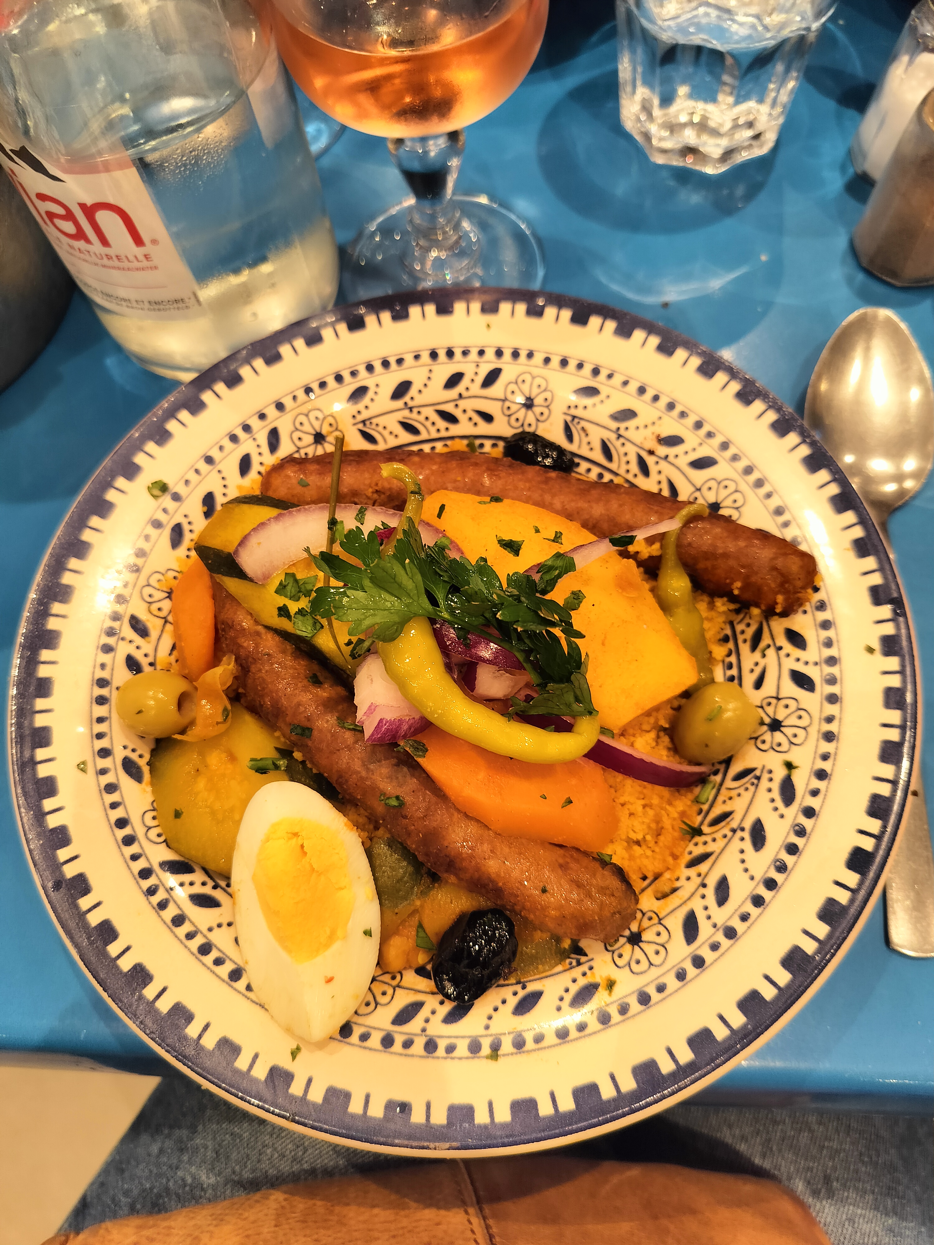 Ma femme avait pris un couscous au poisson et elle a adoré ! Pas trop lourd car bien préparé. Moi j'avais des brochettes et des frites ainsi qu'une sorte de crêpe orientale. Excellent ! Le cadre est reposant avec ce bleu des vacances.