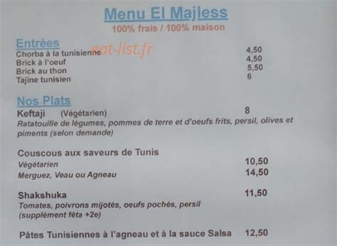 3 fois que je mange à El Majless, 3 fois que j'en suis ravie. Belle carte, prix très raisonnables,les plats sont très bons (j'y ai goûté les keftaji, couscous, desserts...). Et c'est adapté pour les végétariens. Le service est impeccable avec un personnel très agréable. Dans un joli cadre soigné. Bref, je recommande !