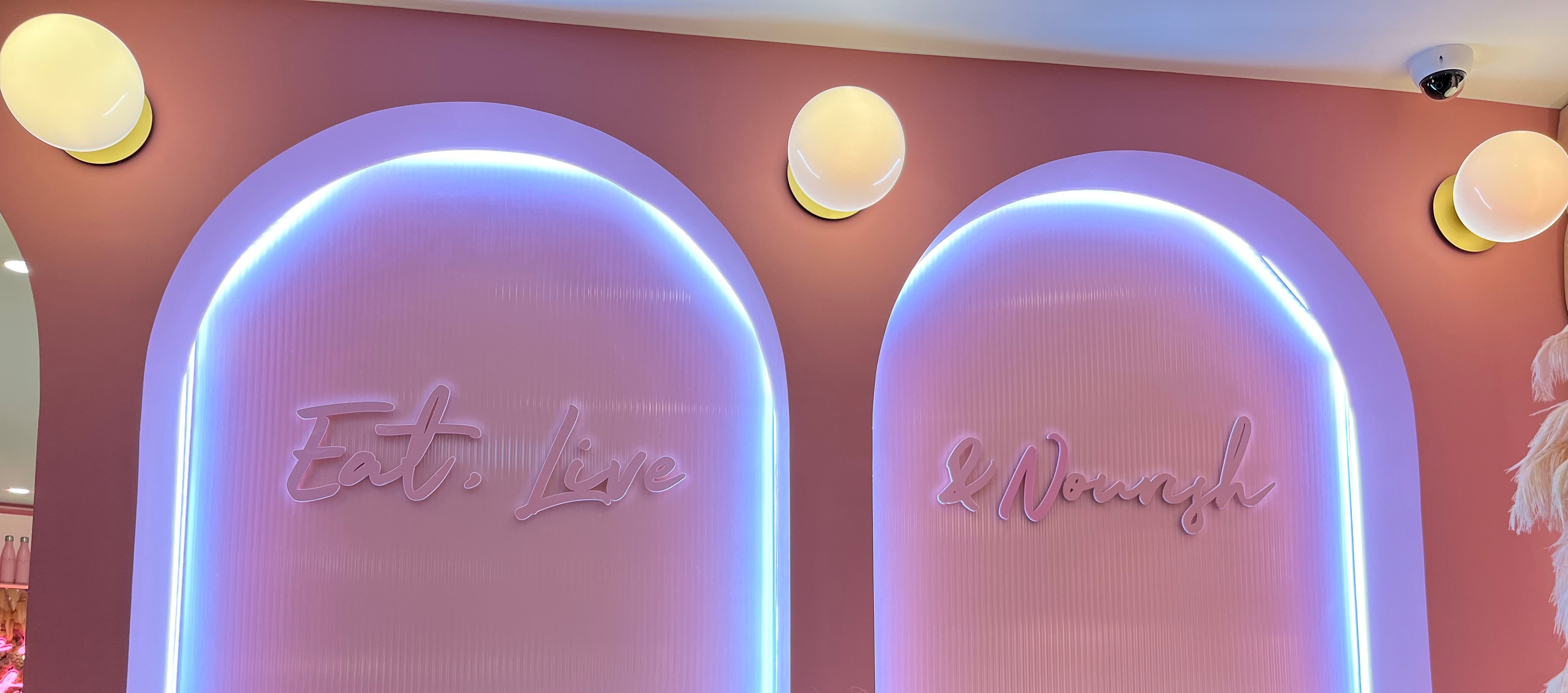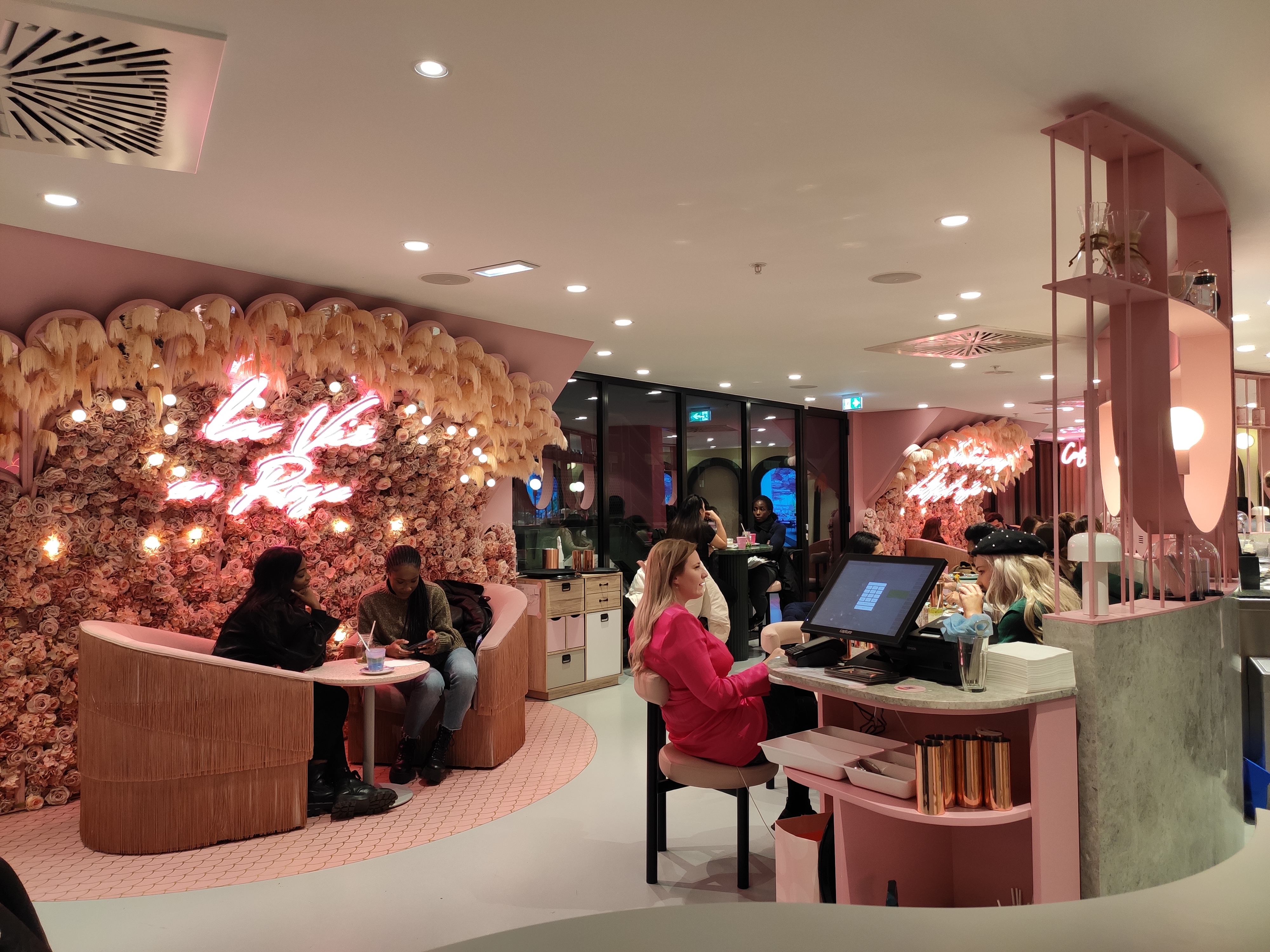 Une touche de rose au milieu des galeries Lafayette. Les plats sont excellents mais je vous recommande le bun n roll au saumon.
