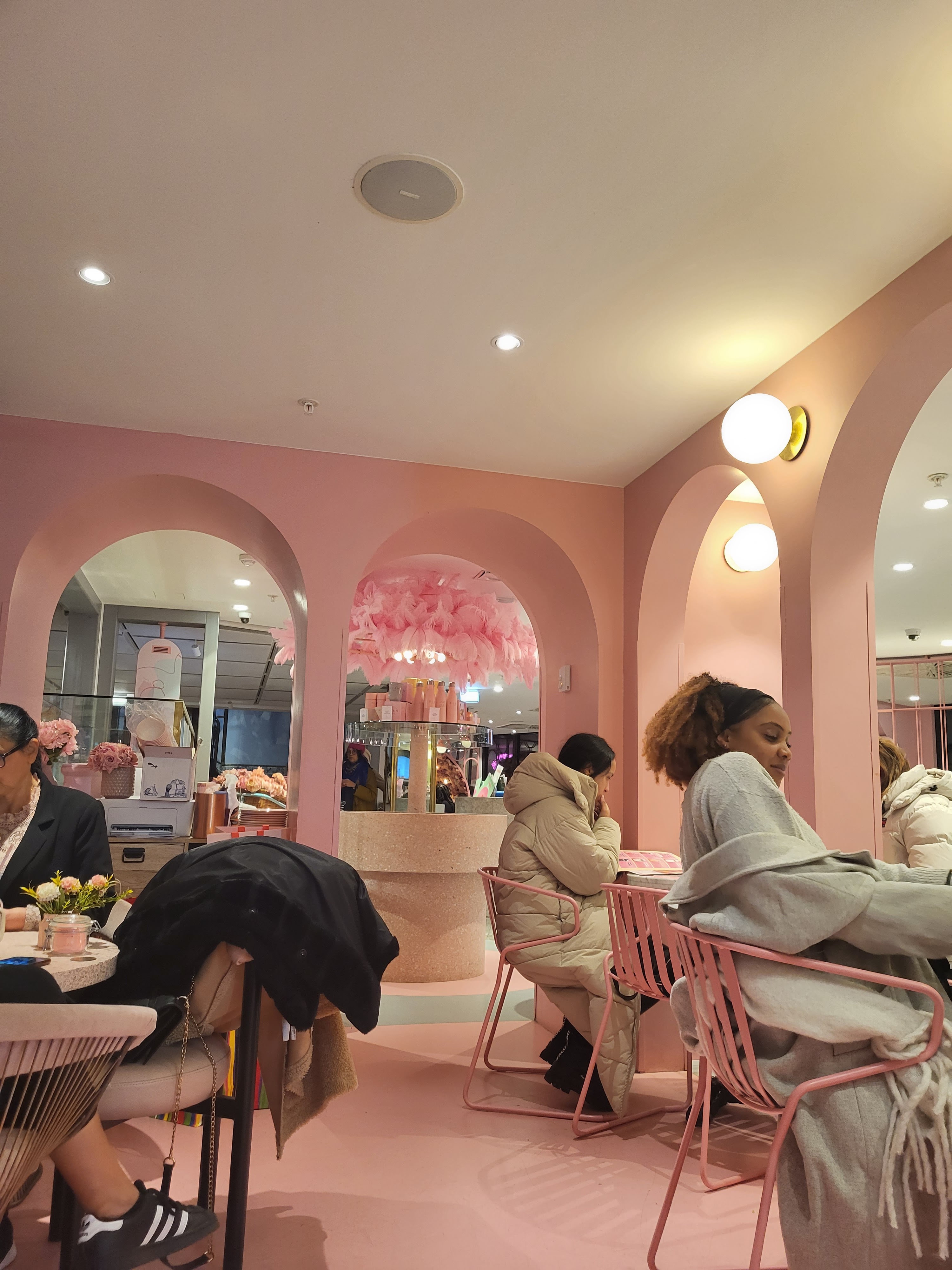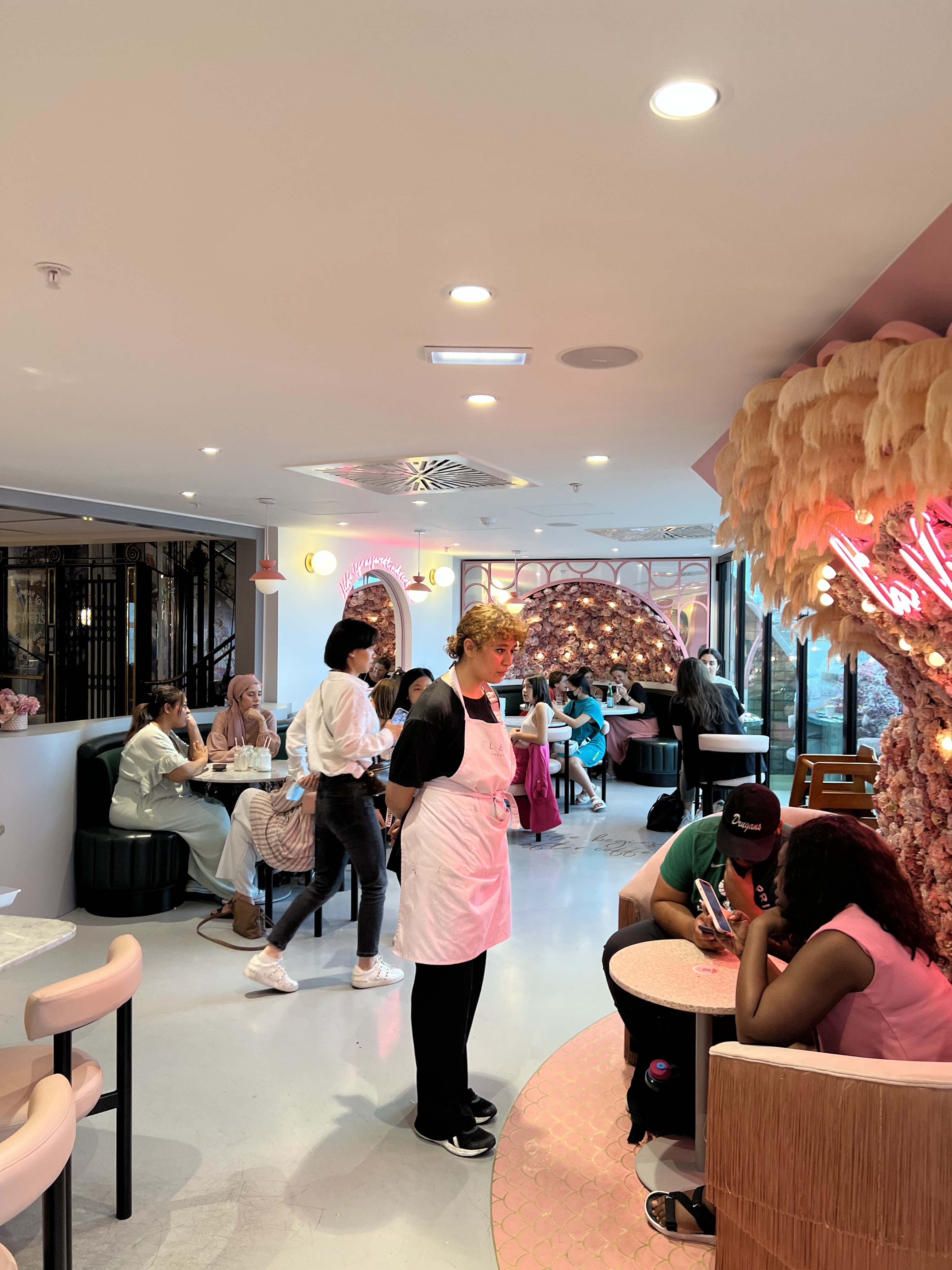 Lieu qui vous hypnotise par sa déco et ses belles pâtisseries En temps normal il y a bcp de monde et on doit faire la queue mais nous avons eu de la chance ce jour là il n’y en avait pas donc on en a profiter pour le tester Les point négatifs de notre point vue:!ce que nous avons commandé était bcp trop sucré et cher donc prévoir votre budget et diabétique s’abstenir Les points positifs magnifiques déco parfait pour Instagram et gentillesse du personnel