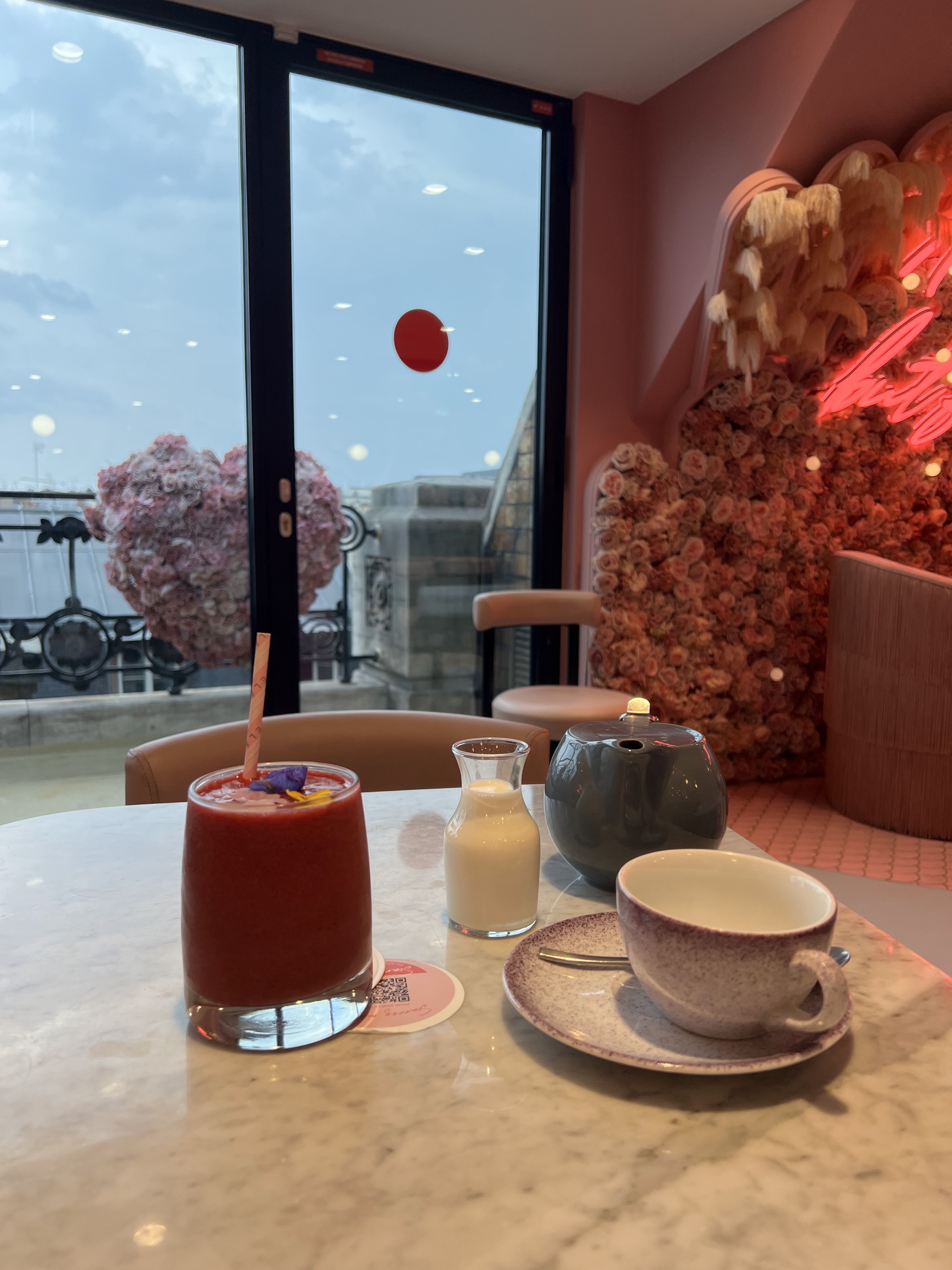 Superbe accueil de la serveuse Maria. Elle est souriante et serviable.Vue sur les toits de Paris, Situé au 4eme étage des galeries Lafayettes, Le lieu est décoré tout en rose. On a pris un smoothie aux fruits rouges et un thé English breakfast. Prix un peu élevés.