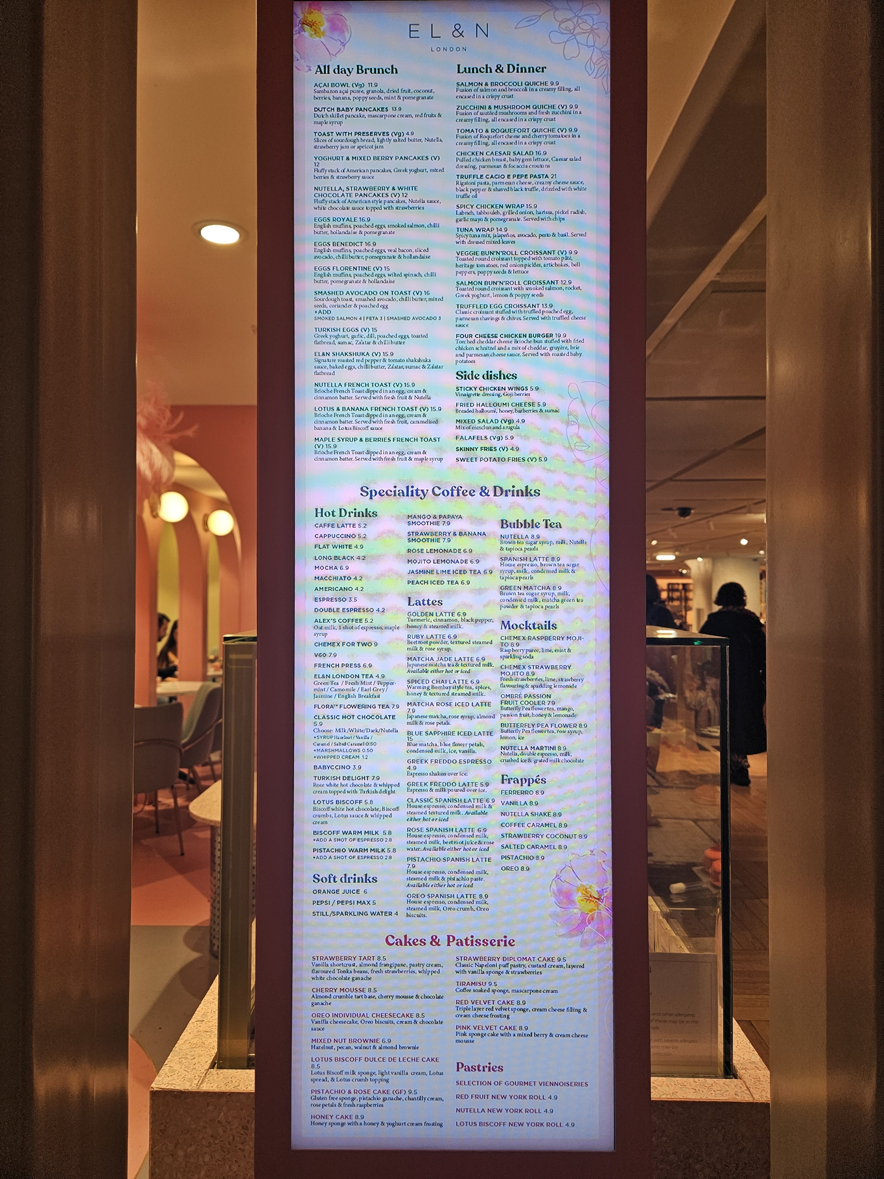 El&N London, est un très joli restaurant bien décoré. Le service est très bon et le personnel très sympathique. Le menu et les portions étaient petites. les plats colorés et jolis. Ils étaient savoureux et avaient l'air frais. Les prix sont plus élevés qu'ils ne le devraient. Je suis un peu déçu. De plus, nous l'avons à peine trouvé. la carte n'était pas utile du tout.