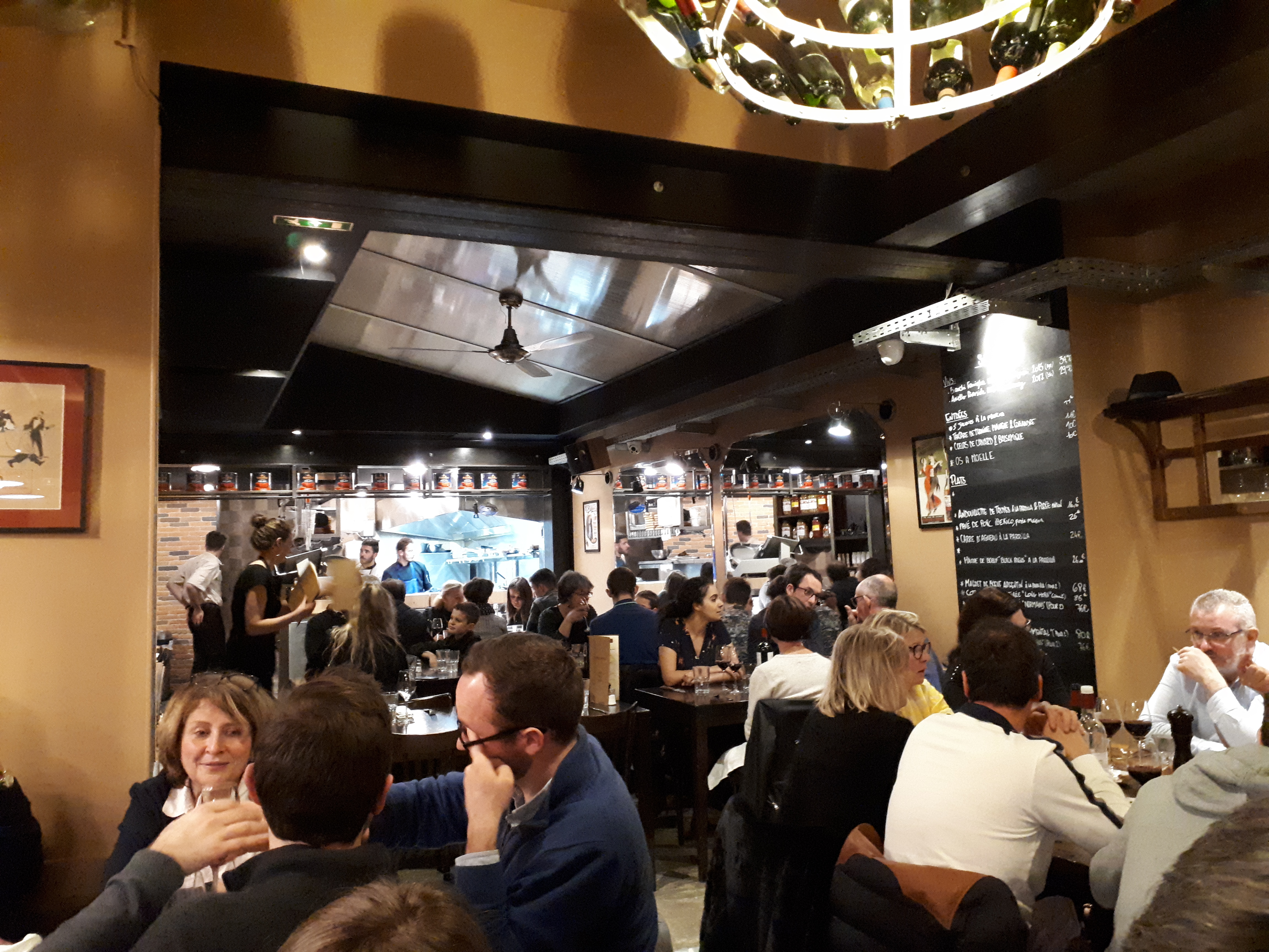 Ambiance bistrot agité bruyant serré, on aime ou on aime pas. Entrée très longue attente et saucisson froid et trop gras très déçus. Viande et dessert très bon ensuite. Vins très chers.