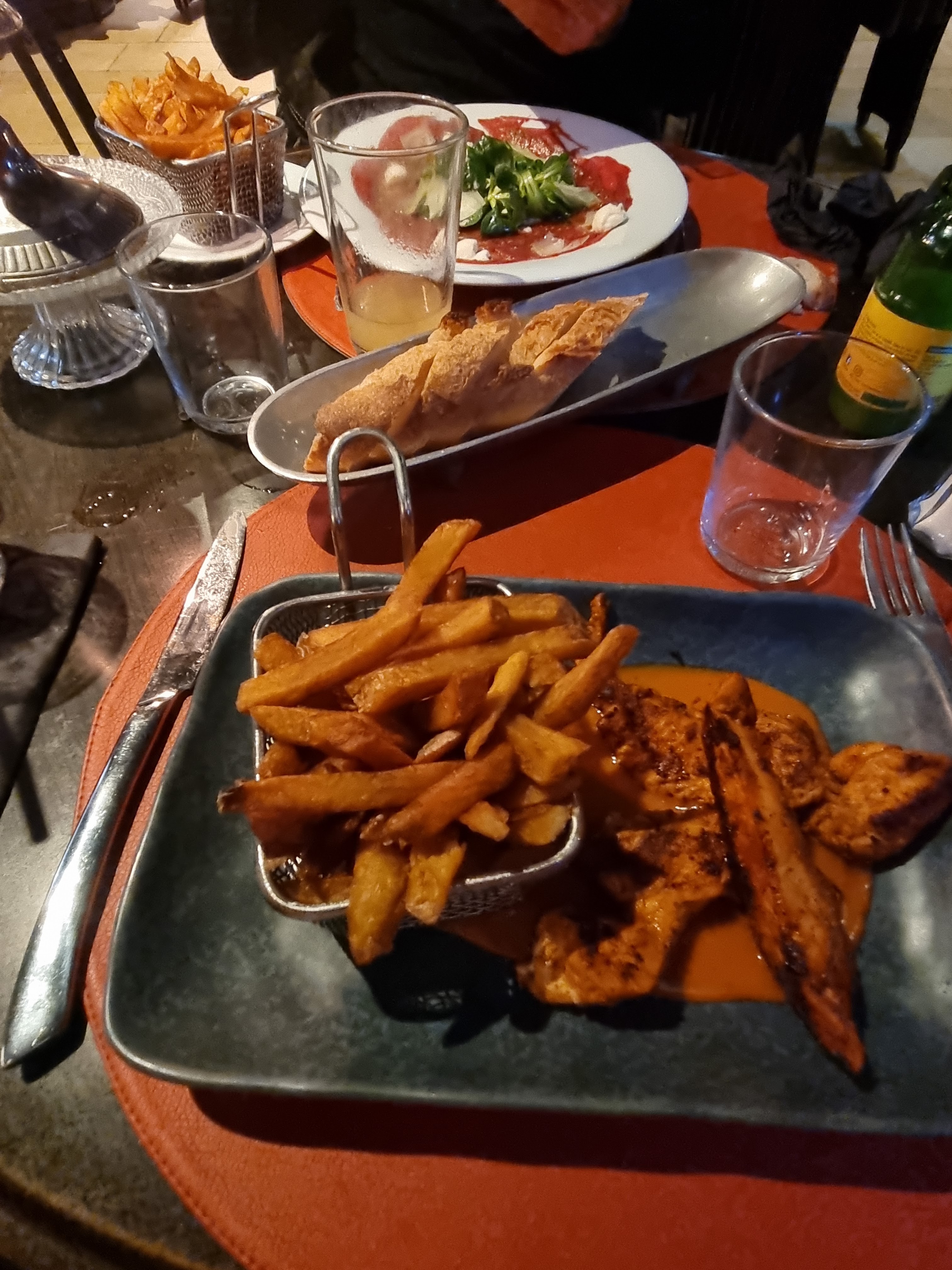 Globalement Très satisfaite !! Les plats étaient super bon ! Les serveurs étaient très sympa ( pas simple de gérer 7 filles 😅) Le seul bemol c'est que les assiettes étaient un peu tiède et le service un peu rapide , pas trop le temps de finir l'apéritif.