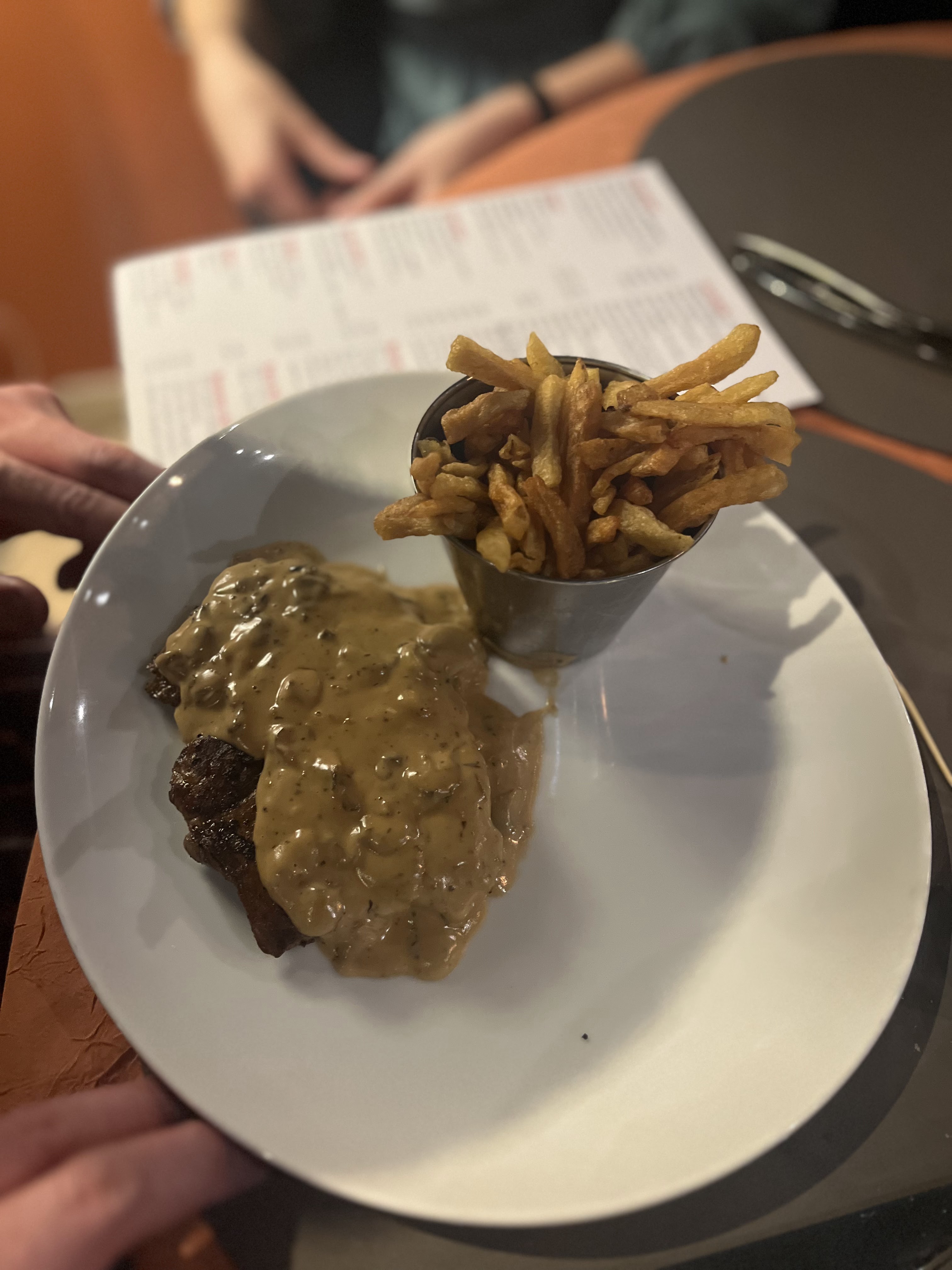 Endroit cosy chaleureux on s'y sent bien même si les tables sont un peu serrés. Pièce de boeuf délicieuse et tendre a souhait . Le pavé de saumon avec la sauce thaï était très bon également . Serveur très poli souriant et serviable ... Rapport qualité prix très bien . Je recommande
