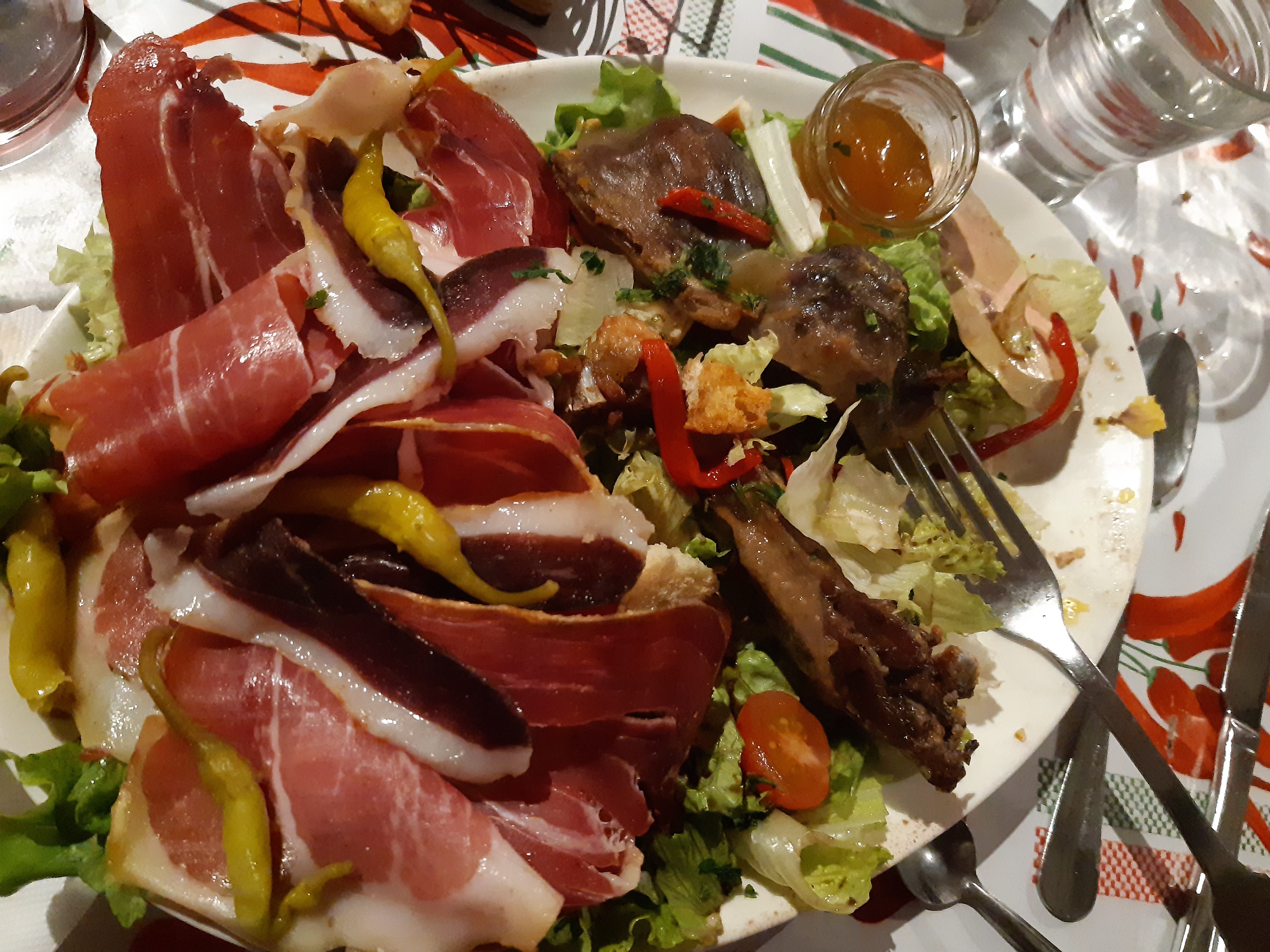 Le genre de resto dont on se rappelle. Il faut savoir qu'il n'y a qu'un plat du moins le midi donc il faut manger ce qui est proposé. C'est copieux, fait maison, et on y mange une cuisine typiquement landaise. Exemple j'ai mangé des graisserons de canard ça faisait au moins 20 ans que j'avais pas mangé ça ! Ça m'a fait plaisir mais Attention, c'est gras, quand même. L'ambiance Feria super sympa. Chants basques en fond sonore. J'ai adoré le concept et j'avais envie de leur faire la pub pour cette cuisine de mon enfance qui vaut le coup d'être découverte. 13€ le menu a midi. Service rapide. Vraiment rien a dire. Le personnel super. Ce jour là nous n'avions pas envie de manger son cassoulet donc le patron a été sympa il nous a fait une bonne assiette de charcuteries ibériques avec une salade en wrap.