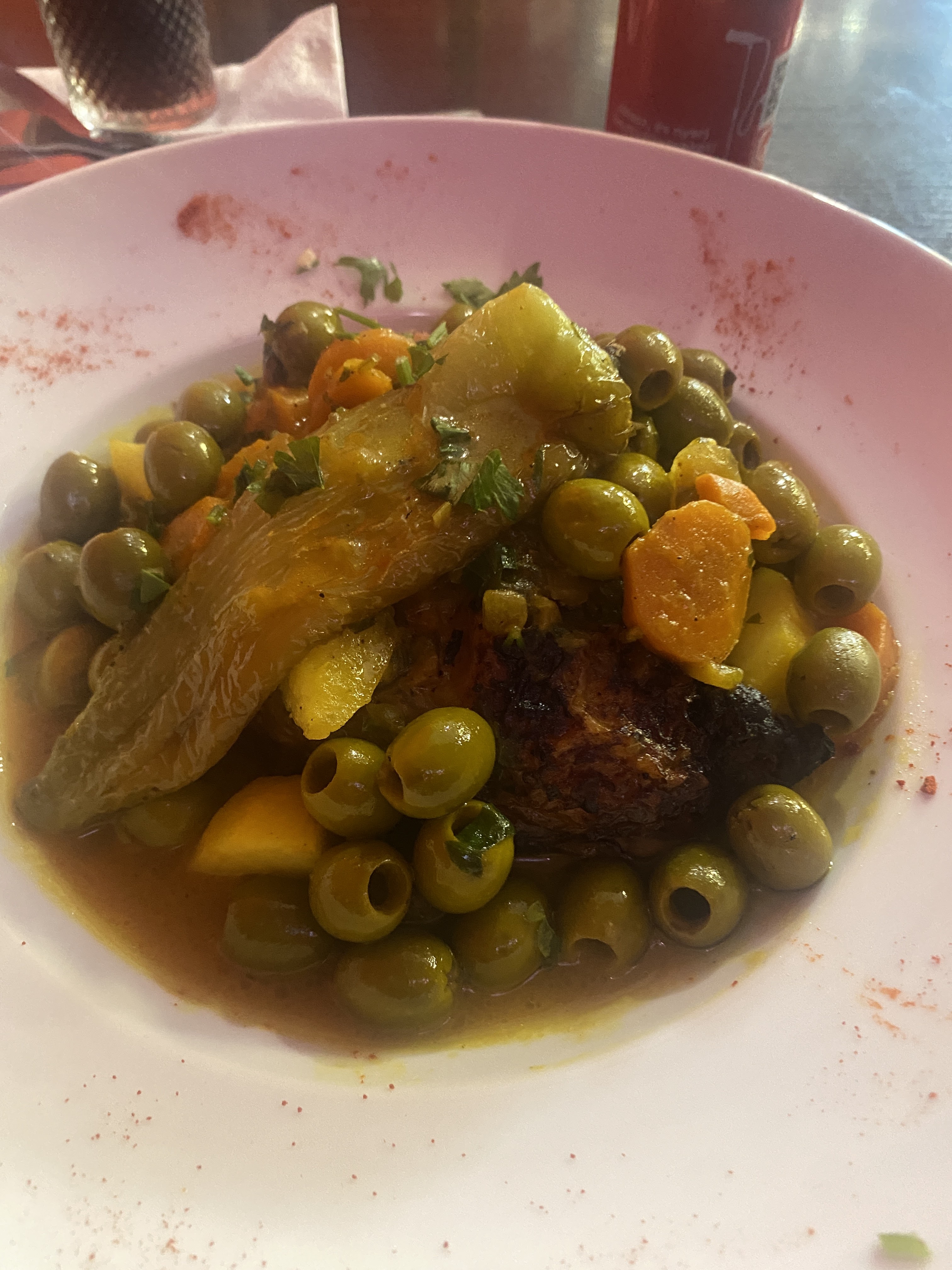 Sans plus ! Entrées moyennement bonnes , nous avions commandé plusieurs entrées ( le moutabal n’est pas terrible, le houmous était très sec , on a dû rajouté de l’huile d’olive et feuilles de vignes passable). En plat la chekchouka était bonne mais très liquide , pas assez solide et consistante. Le tajine aux olives était ridicule , une cuisse de poulet noyé dans un bain d’olive. Seul point positif : l’accueil