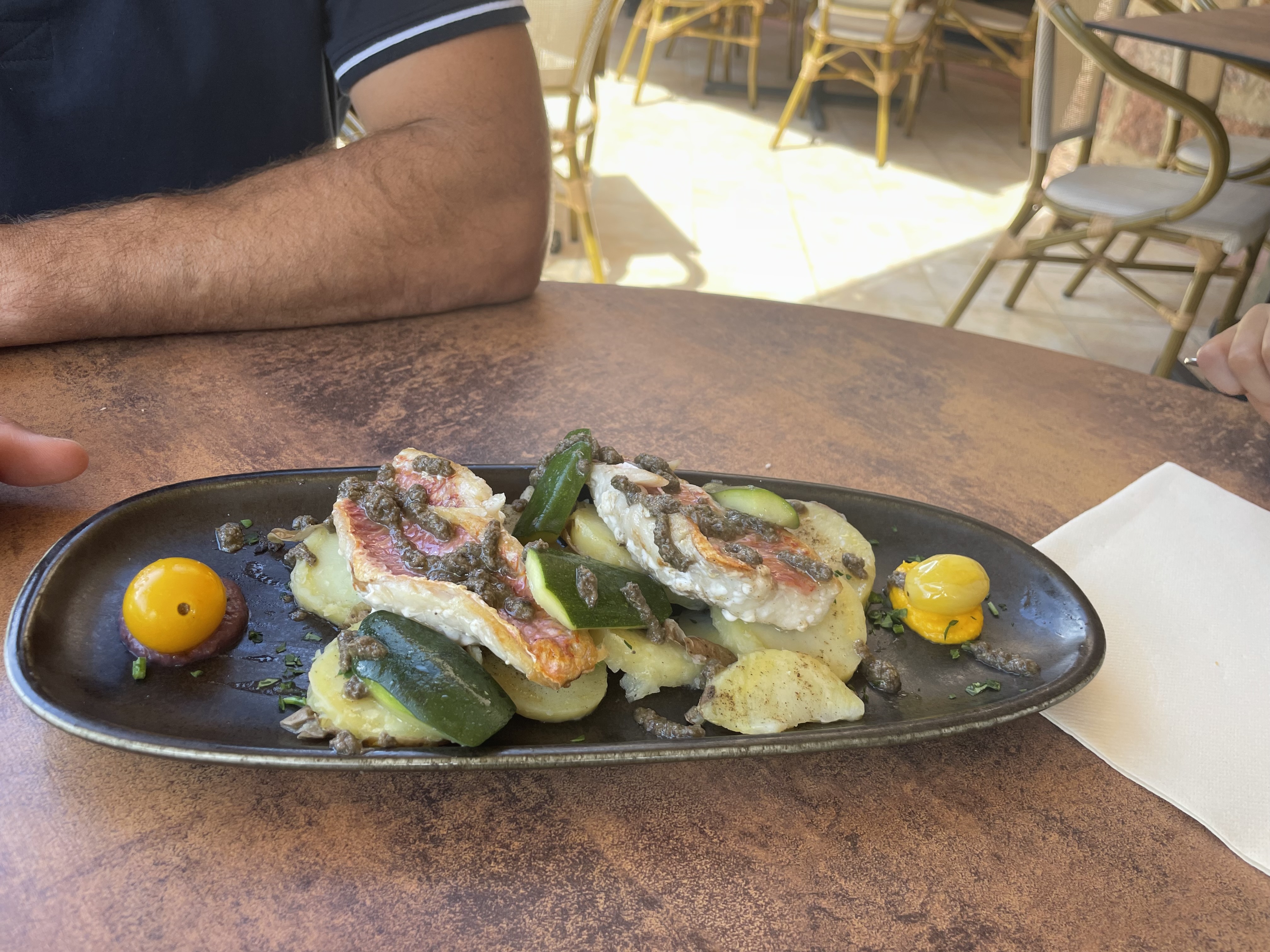 Un cadre magnifique avec vue sur le port, serveur très accueilant et avec de l'humour et une très belle carte 😊 Filets de rouget, viande, petites entrées fraîches..tout était très bon. Merci pour ce bon moment !