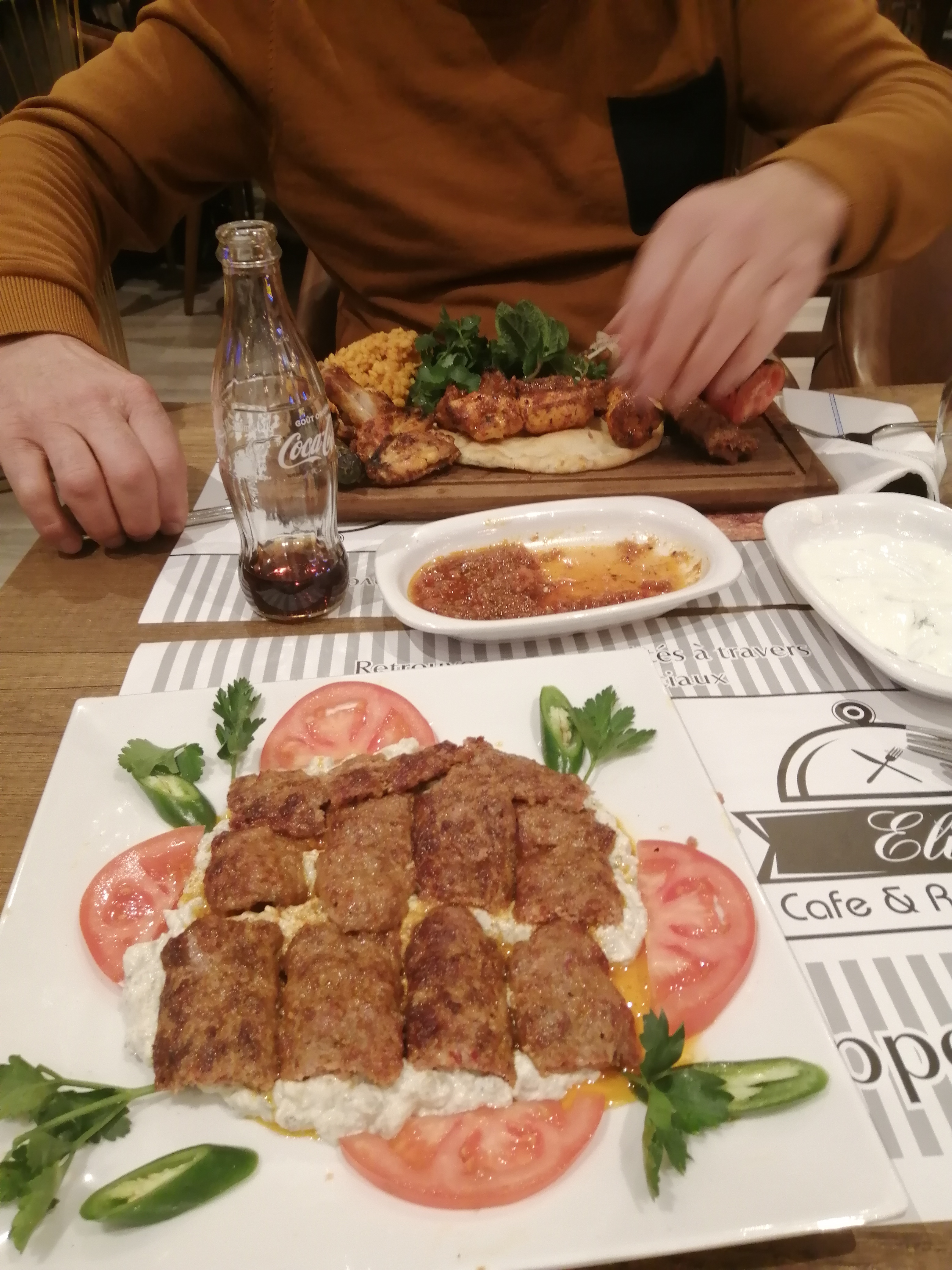 Entièrement déçue, arrivé au restaurant à 20h on a passé commande et peu de temps après deux repas (mixte grillé) sont arrivés, mais les ailes de poulet étaient pas cuit et le adana trop cuit. 30 minutes plus tard le troisième repas (beyti sarma) est arrivé le boulghour était entièrement froid. de plus, mes amis avaient déjà terminé leurs repas et les frites sont arrivés à la fin, la moitié des frites étaient chaud et l’autre moitié froid. Une fois terminée, nous avons beaucoup attendu la serveuse pour qu’elle puisse venir débarrasser (alors qu’il n’y avait pas grand monde dans le restaurant) et nous proposer un dessert. Mais non, elle a préféré ramener du thé à ses collègues et ses amis qui sont arrivés au restaurant, ils se sont posé manger discuter Vraiment déçu, au prix que ça coûte, je m’y attendais pas...