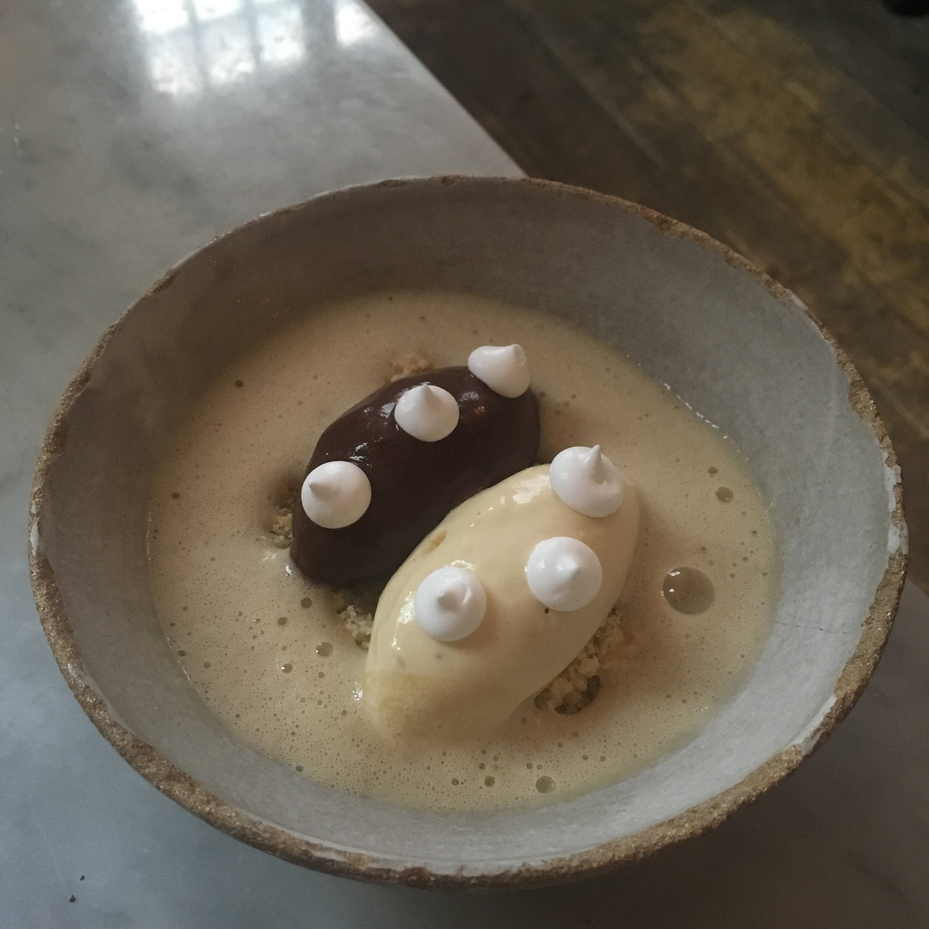 Goûtez leurs desserts ! Certes c'est un bar à vin et à tapas donc on passe facilement à côté du sucré, mais leurs créations sur magnifiques de ce côté. Je suis moi même pâtissier et j'adore cette adresse pour ses desserts à l'assiette toujours magnifiques. J'ai été particulièrement enchanté par quelque chose au café avec une glace au foin je crois et un crumble cacao. Une tuerie !