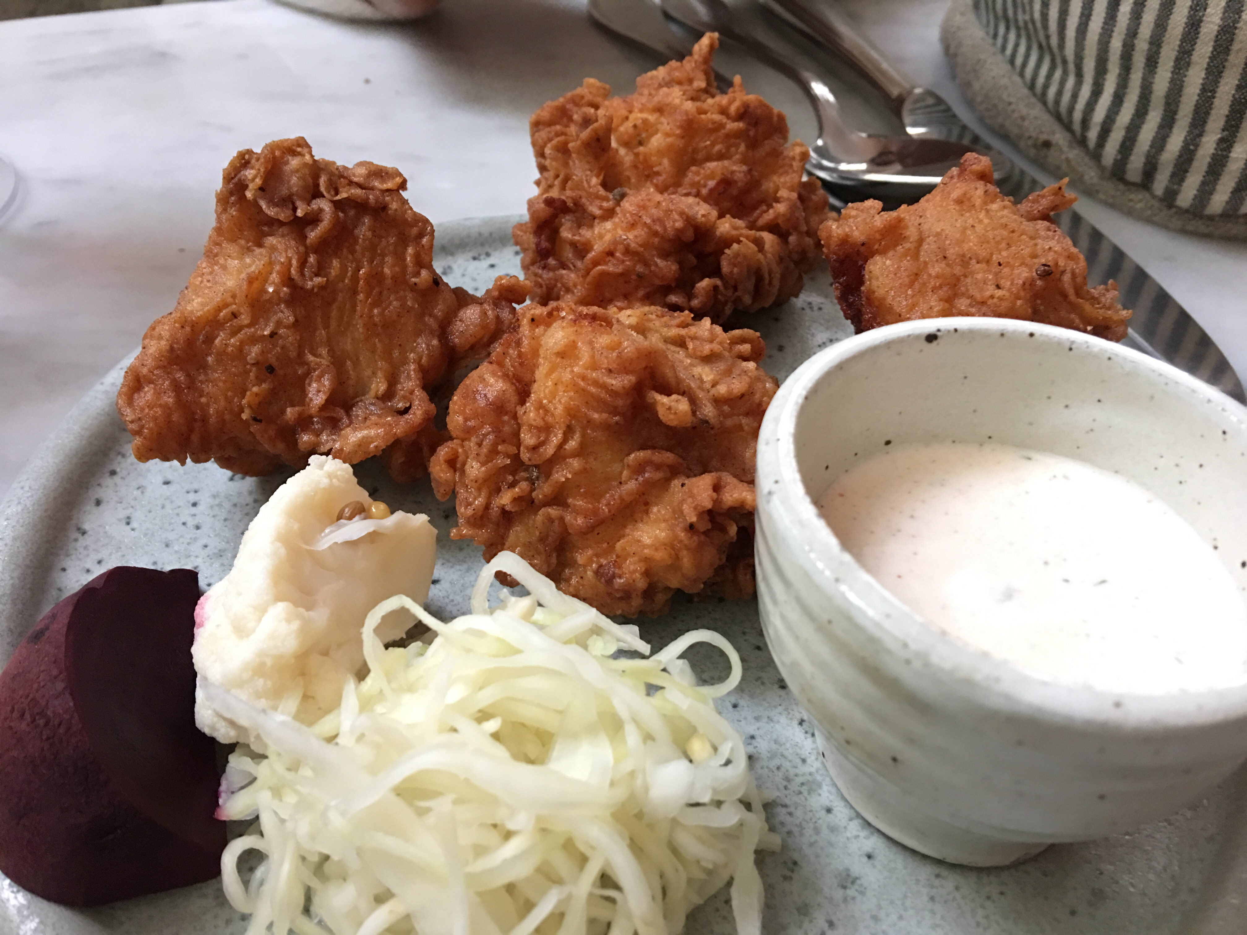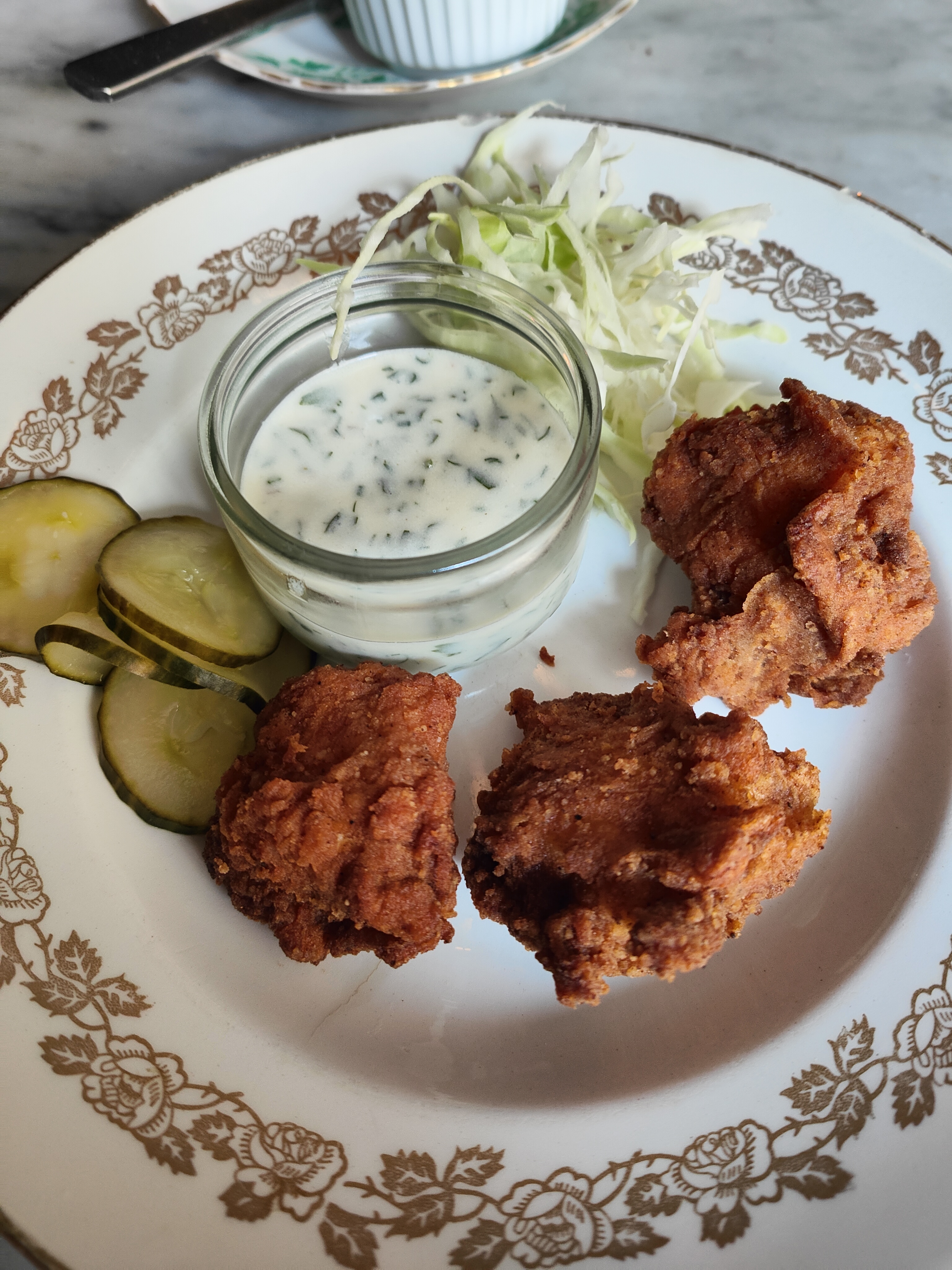 Je suis venu ici pour déjeuner avec une réservation et j'ai eu l'option plat/entrée à 24 €. Les palourdes étaient bonnes mais trop salées à mon goût, la sauce était un bouillon salé et aqueux sans saveur. La raison pour laquelle j'ai donné 4 étoiles est parce que le poulet frit était si croustillant à l'extérieur et super tendre et délicieux à l'intérieur. J'ai adoré le ranch au babeurre et les cornichons, en particulier la saveur de seigle qui l'accompagnait. J'étais super heureux après avoir pris la première bouchée, j'ai immédiatement oublié les palourdes.