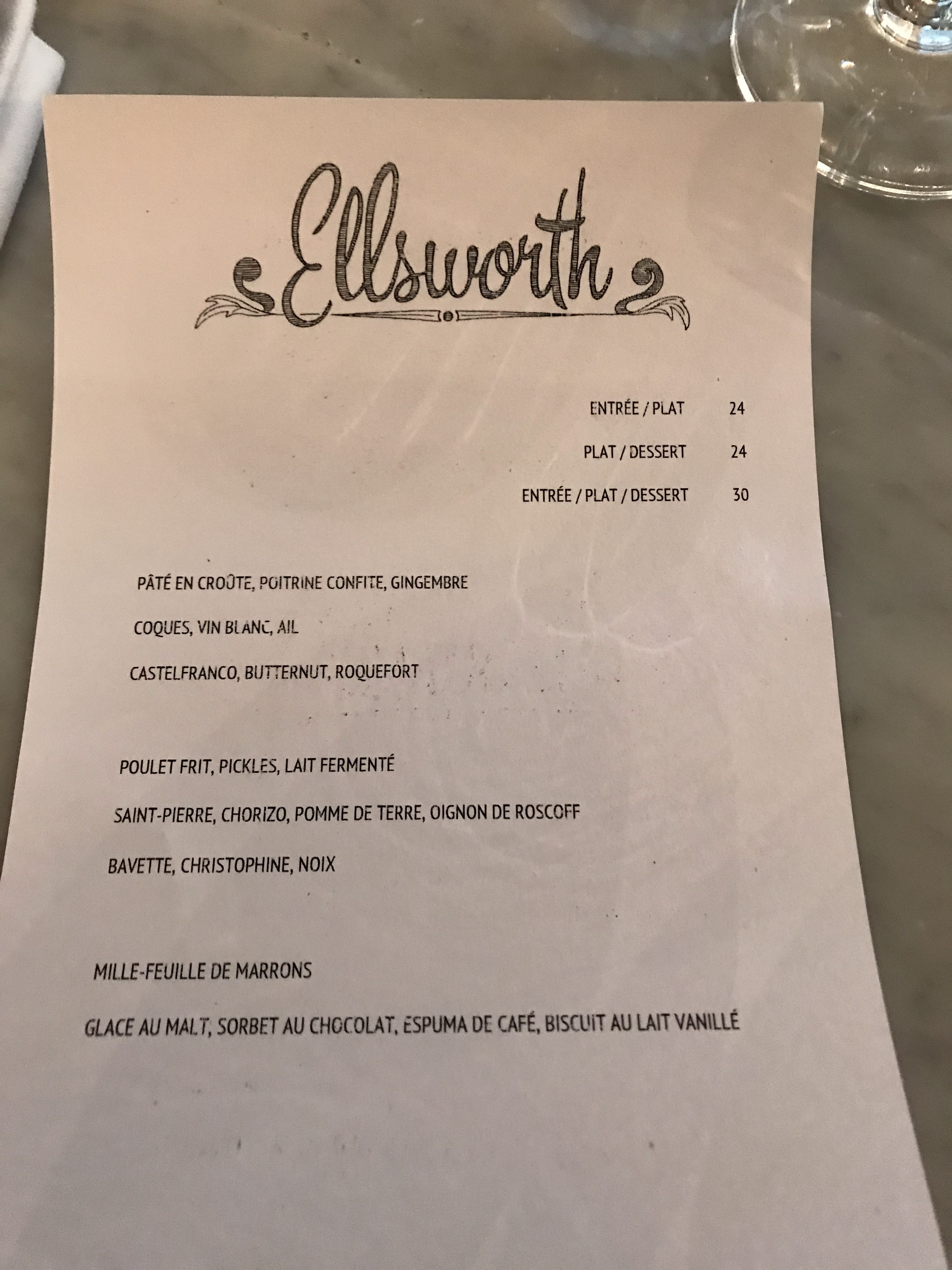 Je suis ravi de retrouver Ellsworth mais peut-être…. Pas la même énergie ni le même niveau d’exécution. Ambiance bizarre un samedi soir. La playlist était du rock des années 70 et 80 et les serveurs étaient comme d'habitude, désintéressés, mais d'une manière ou d'une autre, cela n'a tout simplement pas cliqué comme avant. Le menu est si limité qu’il peut être difficile et les descriptions ne sont pas très utiles pour comprendre ce que vous allez obtenir. Les desserts étaient particulièrement décevants. Peut-être que nos attentes étaient trop élevées et nous reviendrons un jour pour le déjeuner, ce qui est probablement un repas plus approprié pour cet endroit relativement simple.