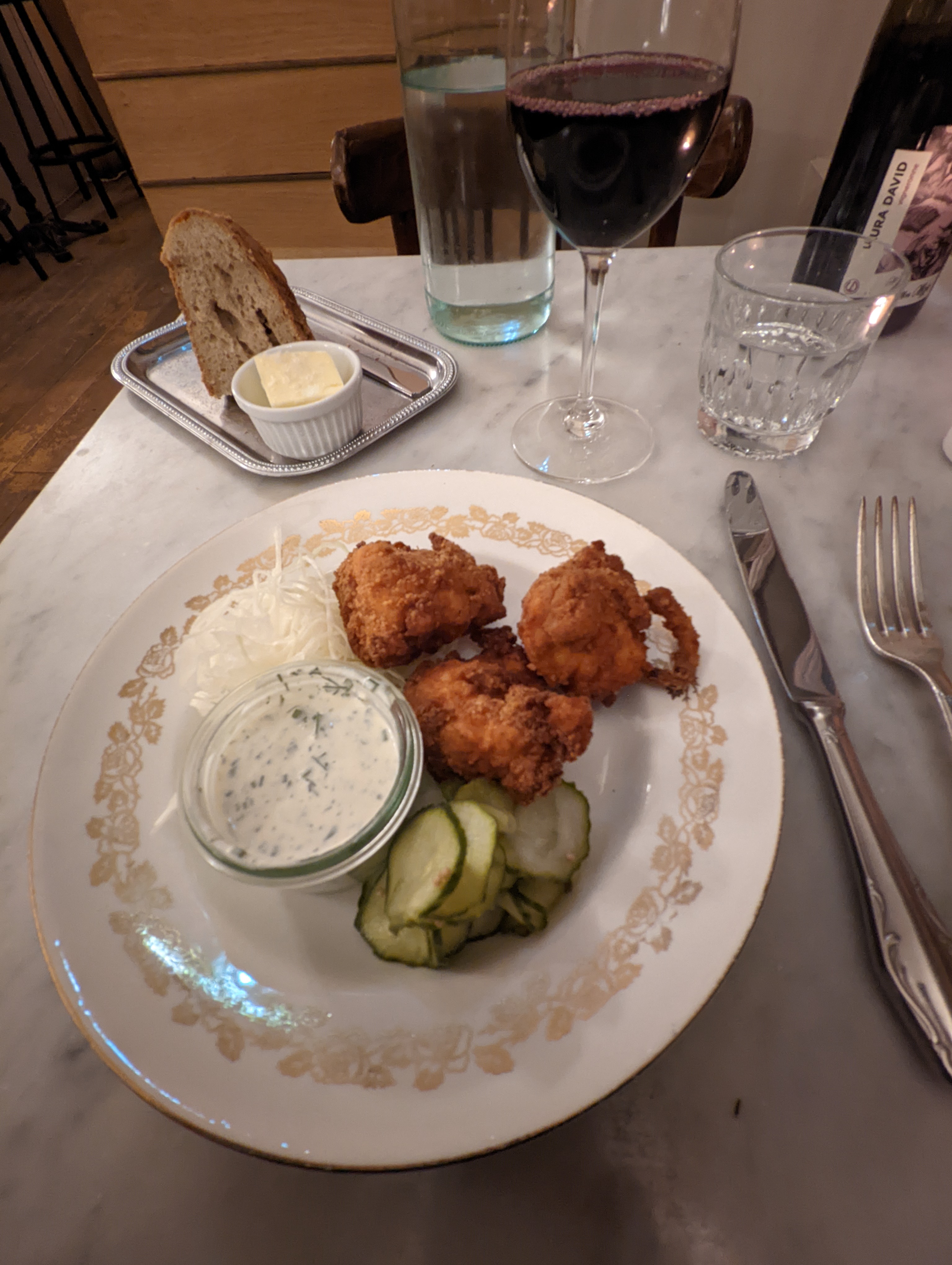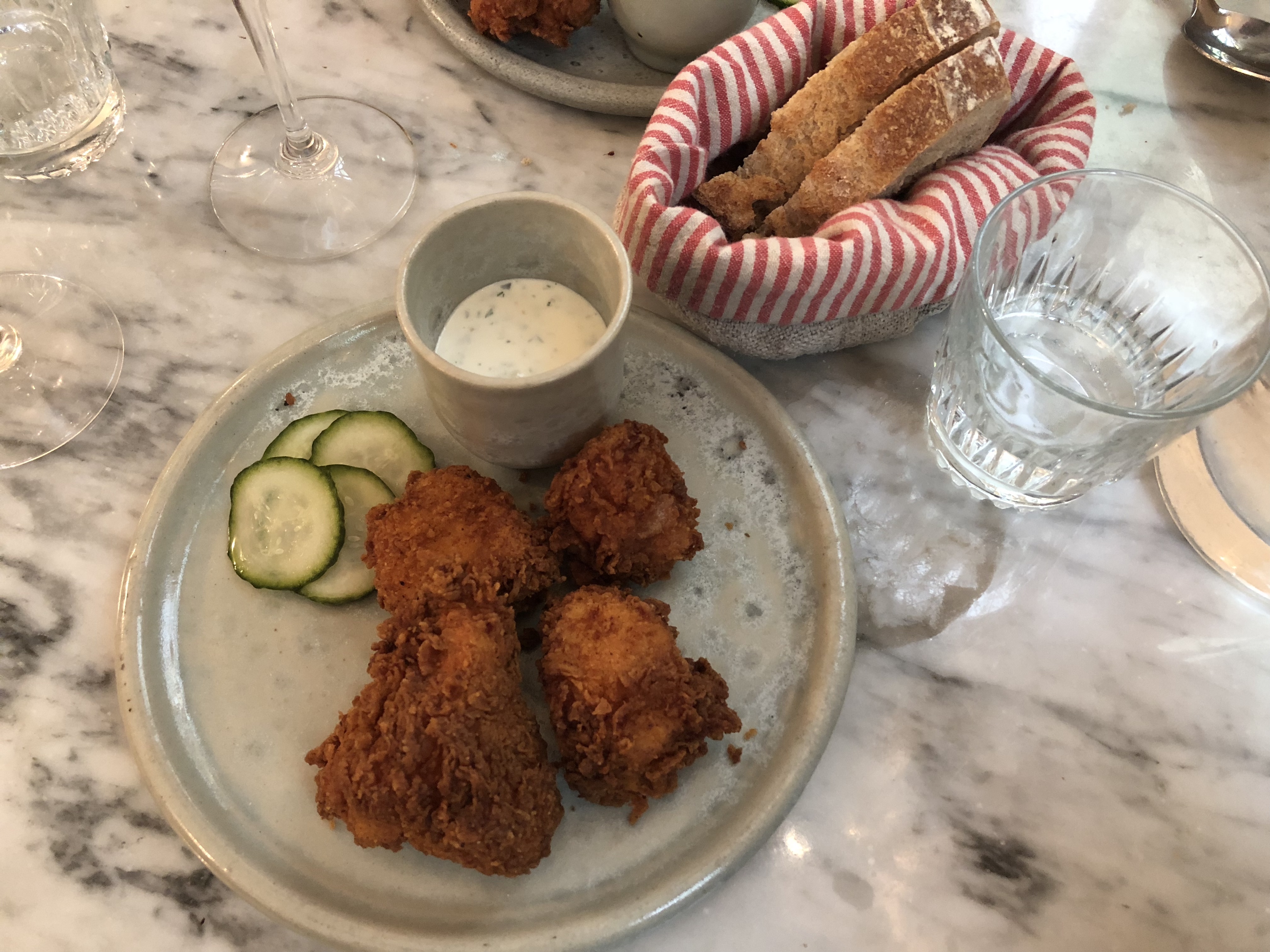 Très bonne découverte, même si je ne suis pas du tout la cible de ce genre d'établissement. L'adresse est très petite, je vous recommande de réserver Je suis venu spécialement pour le poulet frit et je peux vous garantir qu'il est très bon, surtout avec la sauce à l'ail et aux herbes, fournie en très bonne quantité Le pain aux céréales aussi, un vrai régal. Très bonne idée le couteau au beurre avec le beurre ramolli. C'est la valeur ajoutée du restaurant La carte des vins aussi, la vache, incroyable la quantité de bouteilles qu'ils ont pour une si petite adresse. En revanche, et ça... Ça pique le prix. 13€ pour 3 morceaux de poulets, je m'en souviendrai 😉