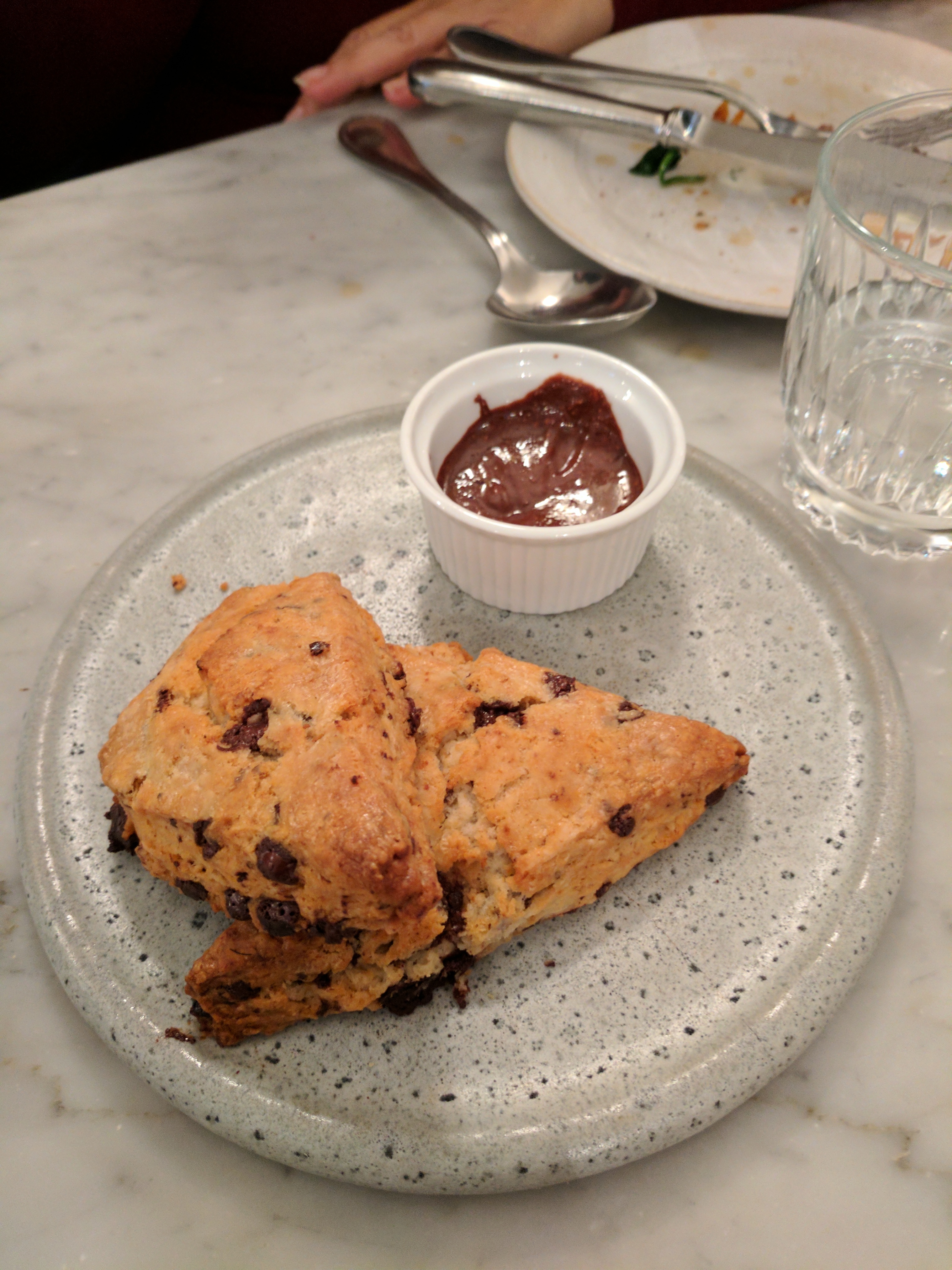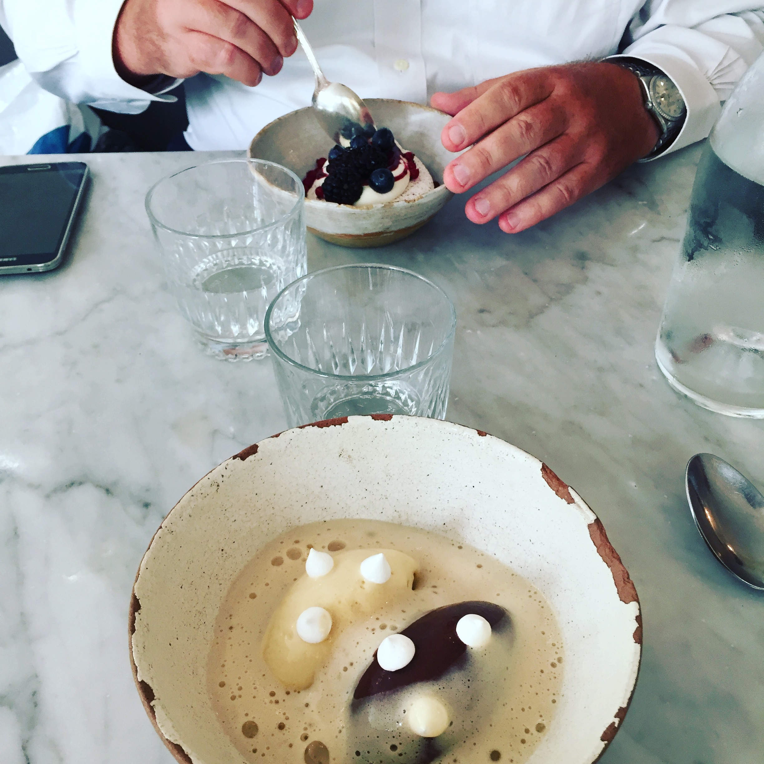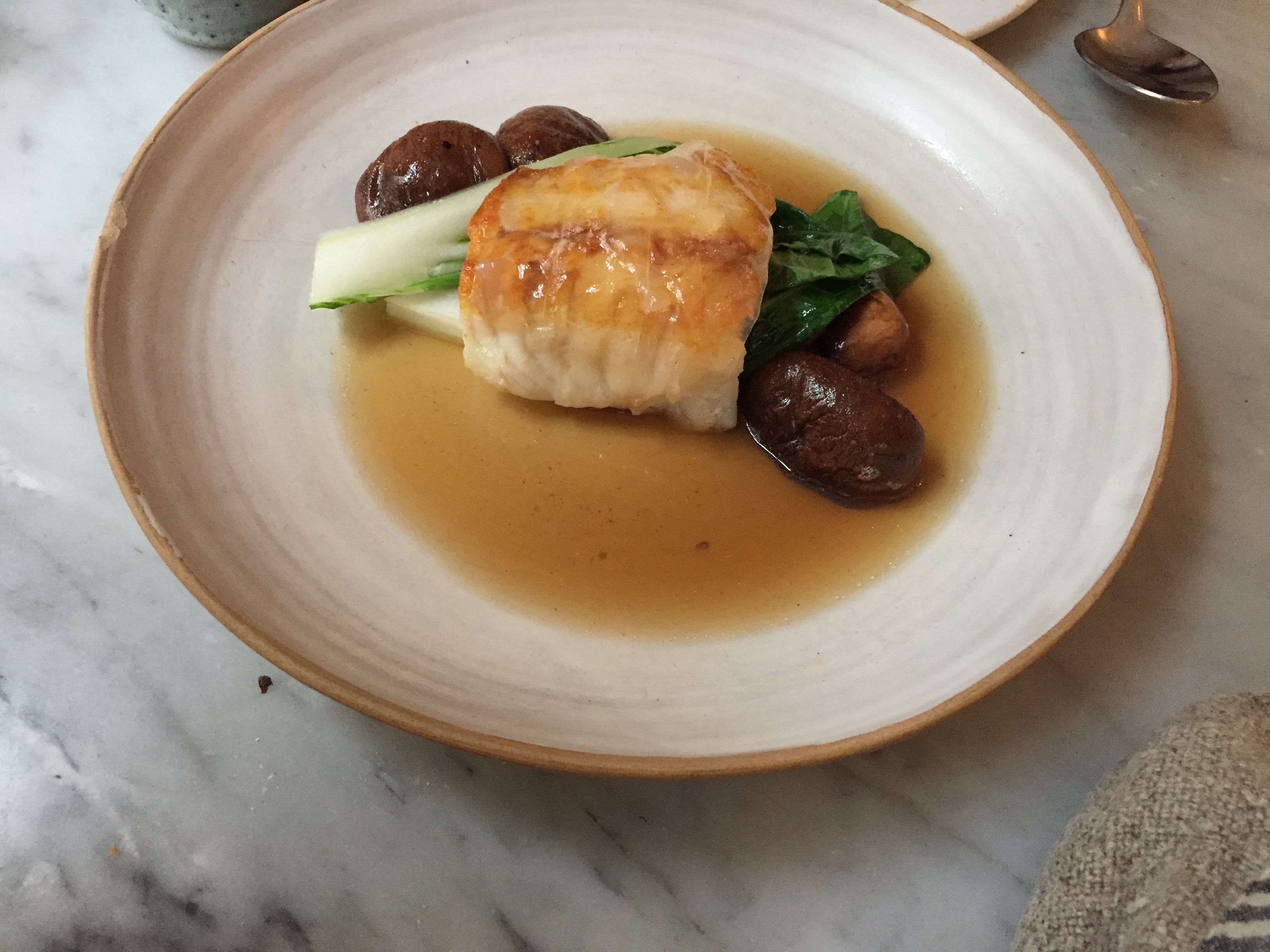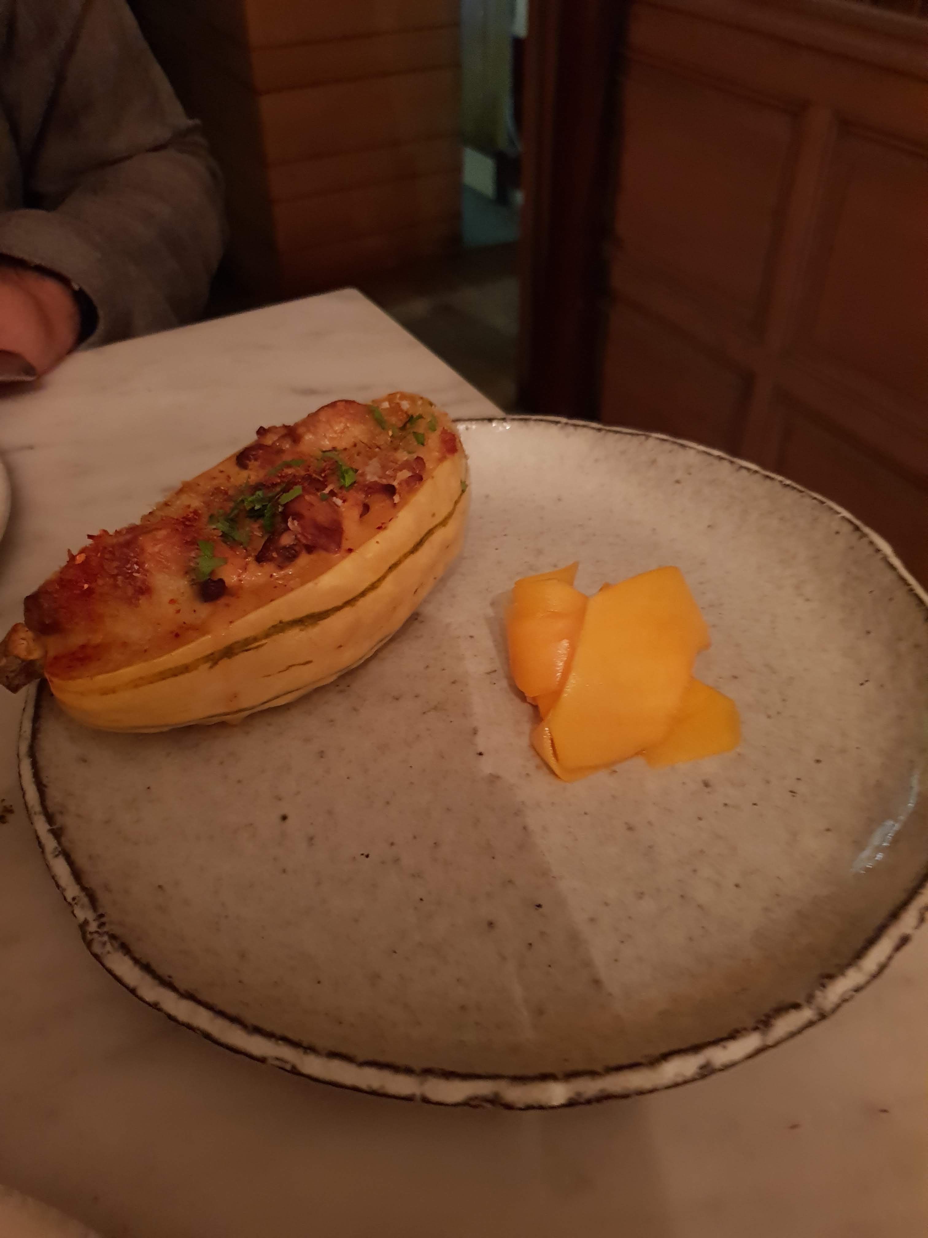 Nourriture délicieuse. Les COURGETTES MARINÉES STRACCIATELLA, ROQUEFORT et SOUFFLÉ À LA CHÂTAIGNE, MOUSSE BUTTERSCOTCH étaient toutes sensationnelles. Je ne saurais trop recommander de manger ici. Notre visite n'a été que légèrement gâchée par une autre table qui est arrivée en retard, nous a poussés dans le restaurant, a été impolie envers le personnel et a refusé de s'asseoir à la table qui leur avait été assignée, à laquelle mon mari et moi avons fini par nous asseoir et ce n'était pas aussi bon. bon. Le personnel a semblé un peu stressé par la suite, même s'il était parfaitement agréable et efficace. L'ambiance semblait juste un peu tendue...