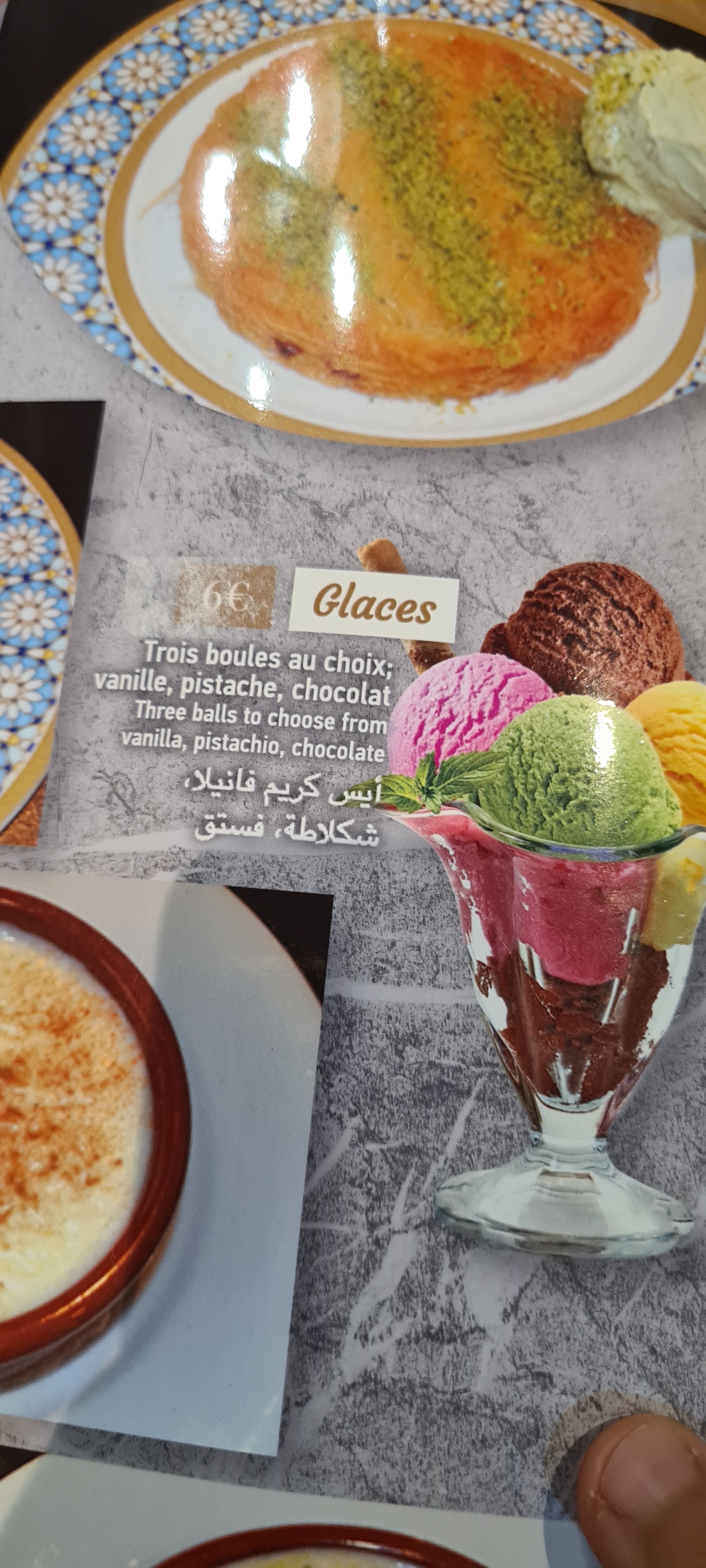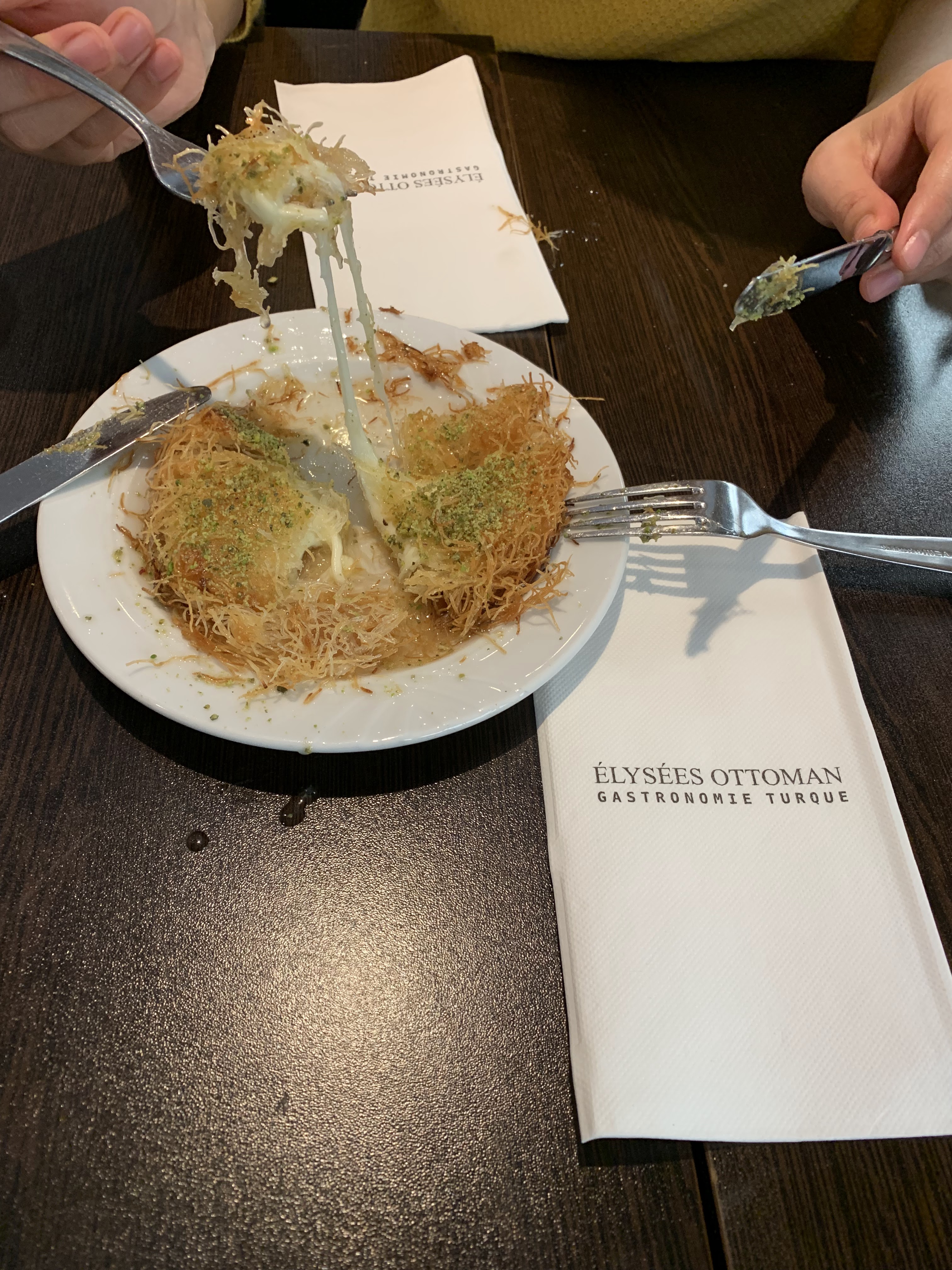 estaurant a fuir, je vous conseille de passer votre chemin, vous allez être arnaquer, je vous laisse voir les photos, j'ai pris meze pour 4 personnes et vous pouvez voir la quantité, et le pain !!! Pour 4 personnes !! Même mes couverts ils m'ont donné qu'un seule !!! La kounefa est a 18 euros!! Alors j'ai payé 58 euros pour un mini pain, quelques entrées et une kounefa. Les amis vraiment je vous conseil de tout mon cœur de fuir et passer votre chemin. Les prix sont des arnaques, si vous voulez des restaurants orientale ou turc je vous conseil helas, hadhramout et le lobnaine.