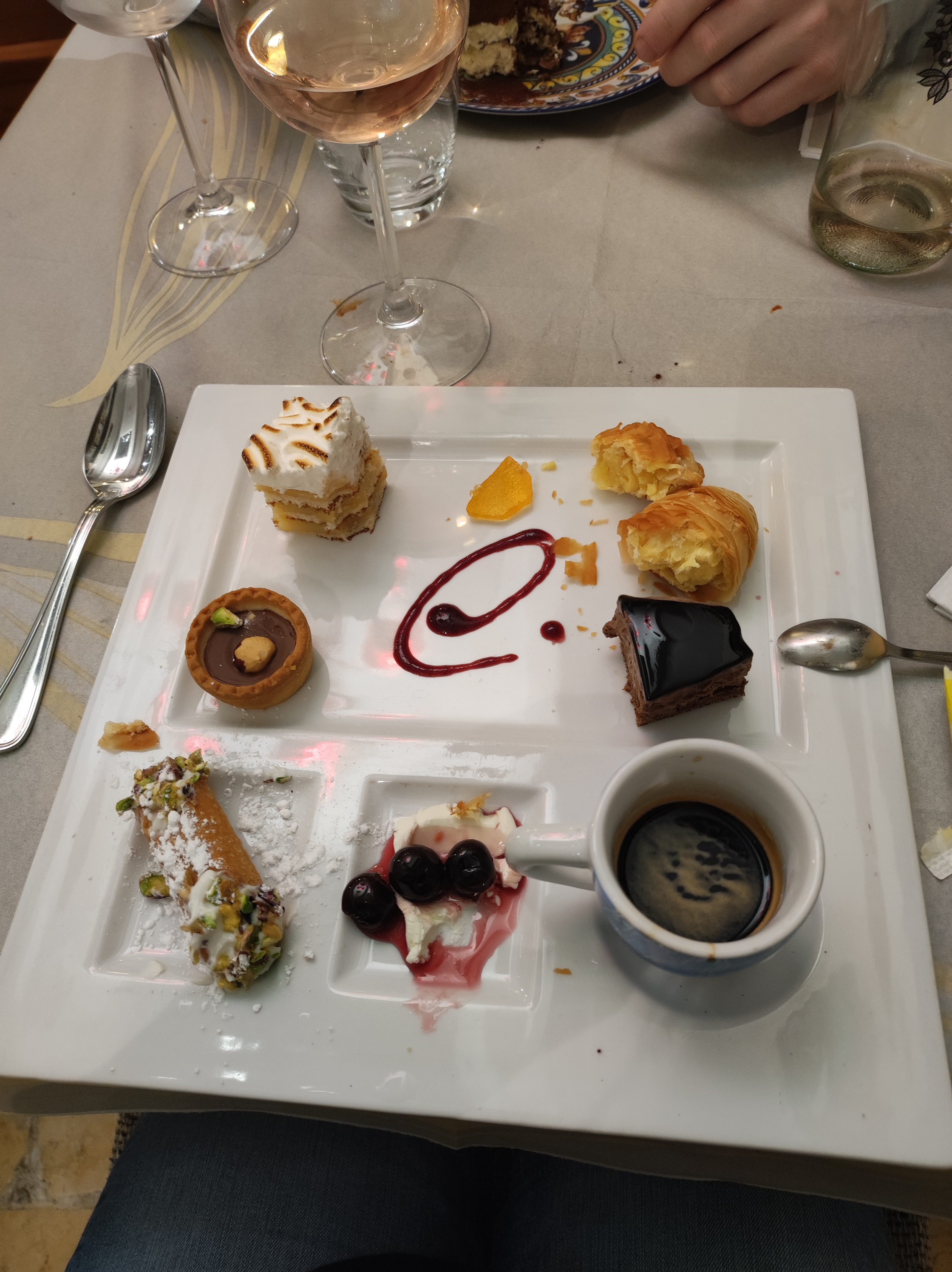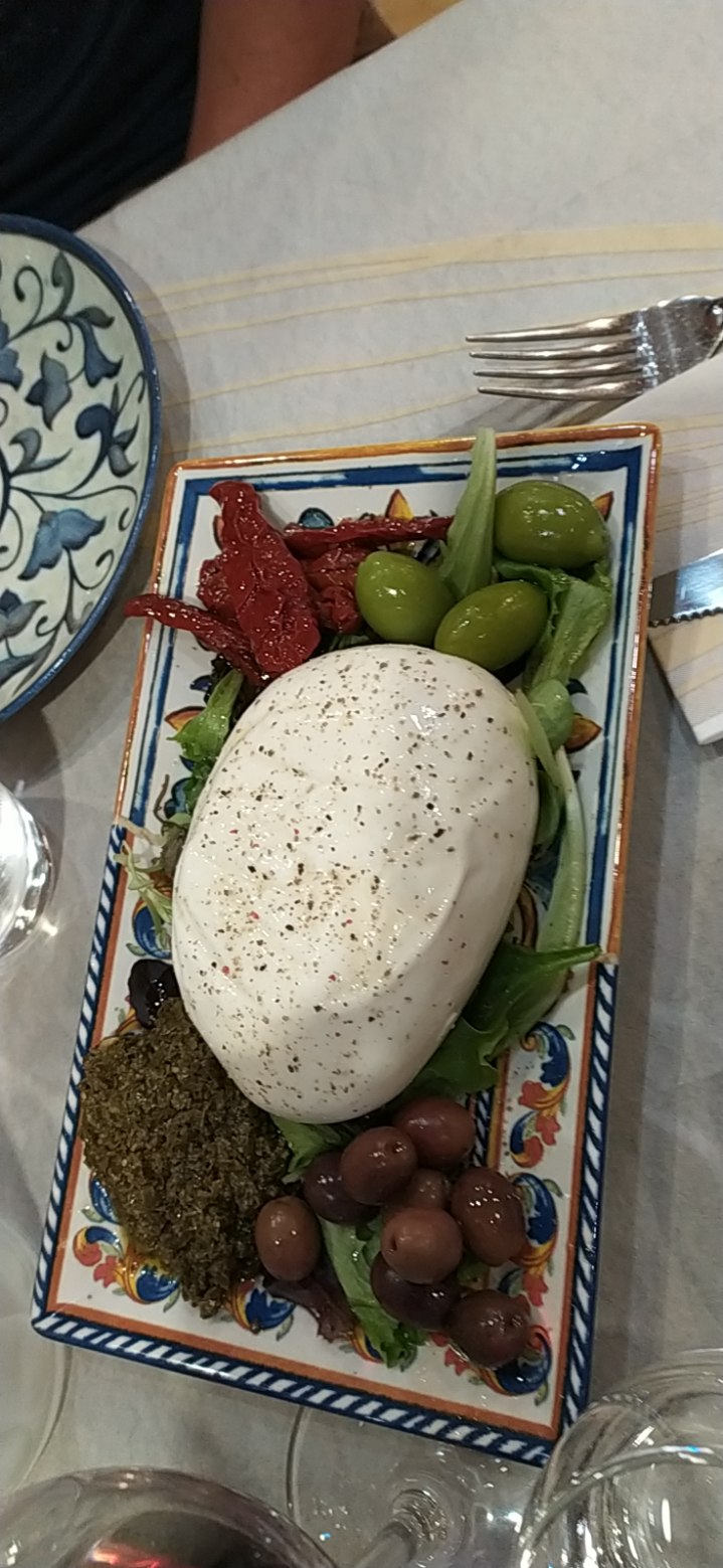 Bouratta au truffe il n'y avais que de l'huile aromatisé truffe. 15e En plat assortiment poulpes,1 st jacque,calamars,crevettes,2 gambas en sauce très bon mais très cher. 32e Dessert mini baba il était très mini 8e Vin bon prix resonable. 15e Digestif Amaro qui vaux 6e la bouteille 5e.😠😠😠
